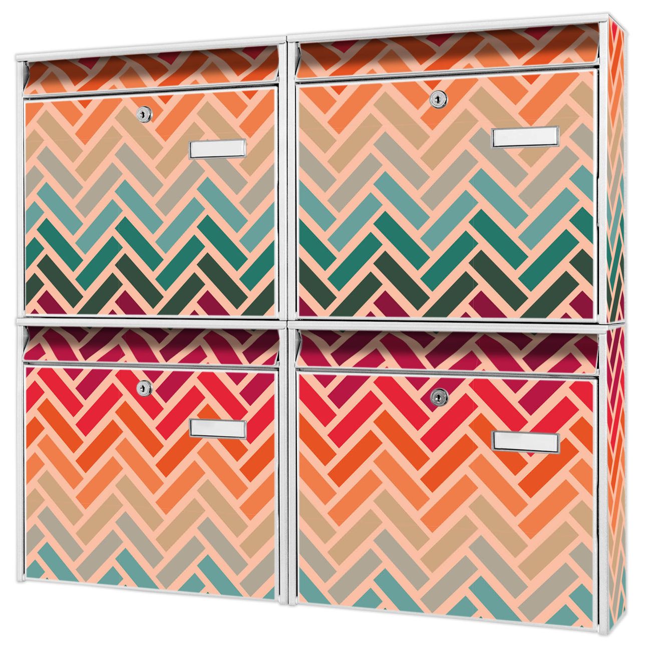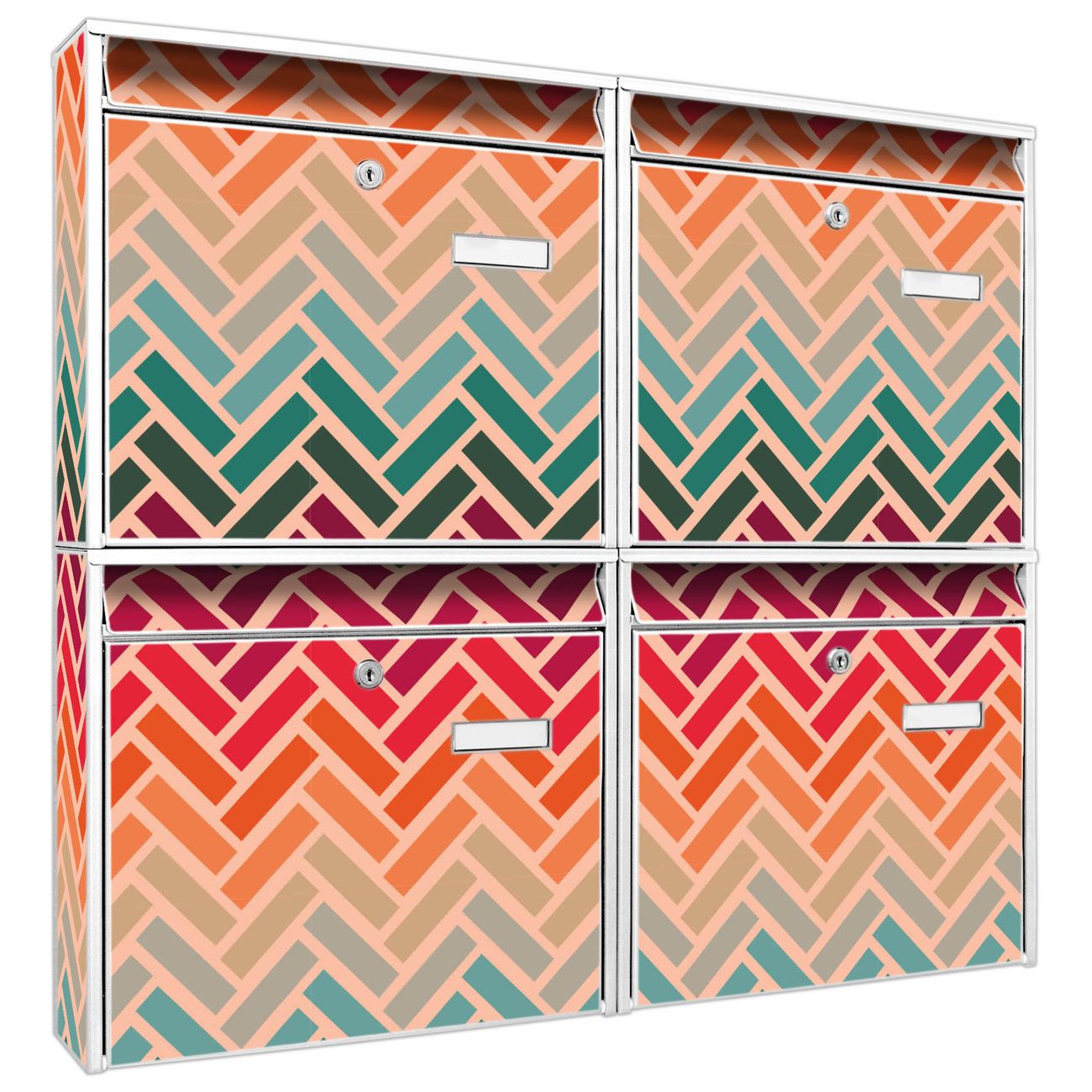 FUNKTION: Die Burg-Wächter Briefkastenanlage mit Motiv Fischgräten bietet Ihnen ausreichend Fassungsvermögen um auch A4 und C4 Sendungen zu empfangen. Das integrierte Namensschild lässt sich individuell beschriften. Wählen Sie aus den Grundfarben weiß, silber und schwarz. DESIGN: Die 4 Briefkästen haben ein ansprechendes und zeitloses Design, ohne dabei auf Funktionalität zu verzichten. Das Material ist sehr stabil, wetterfest und rostfrei. Durch das Motiv Fischgräten werden die Postkästen zu einem Blickfang. DETAILS: Die Postkästen bestehen aus verzinktem Stahl der zusätzlich mit Klarlack versiegelt wurde. Die Kästen sind gesamt 64,5cm hoch, 72,5cm breit und 10cm tief. Das Motiv besteht aus einer wetter- und UV-festen Folie, die Ihren Briefkasten zusätzlich vor Kratzern schützt. Die Postkästen werden mit Montagematerial, je einem Namensschild und je zwei Schlüsseln geliefert. NUTZEN: Das Briefkastenset eignet sich für die Wandmontage, die Größe bietet genügend Platz für Sendungen aller Art. Das zeitlose Design sowie die stabile Bauart bieten Ihnen einen treuen Begleiter für Ihre Post. BANJADO: