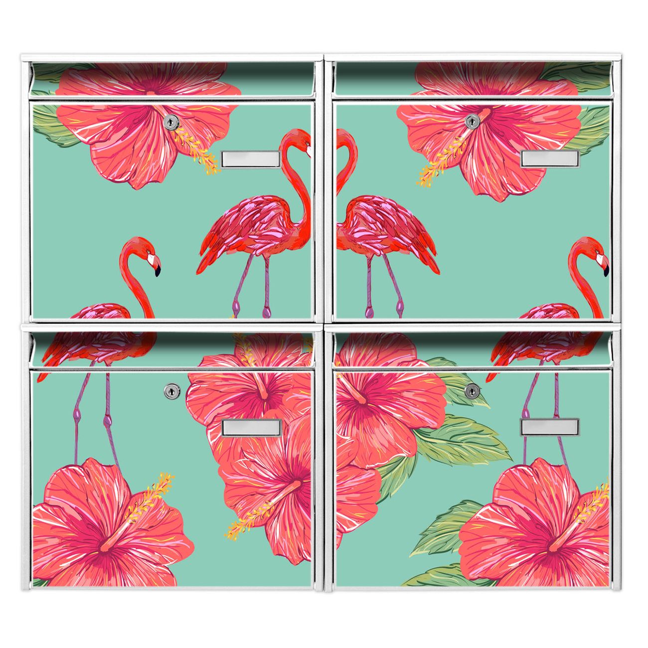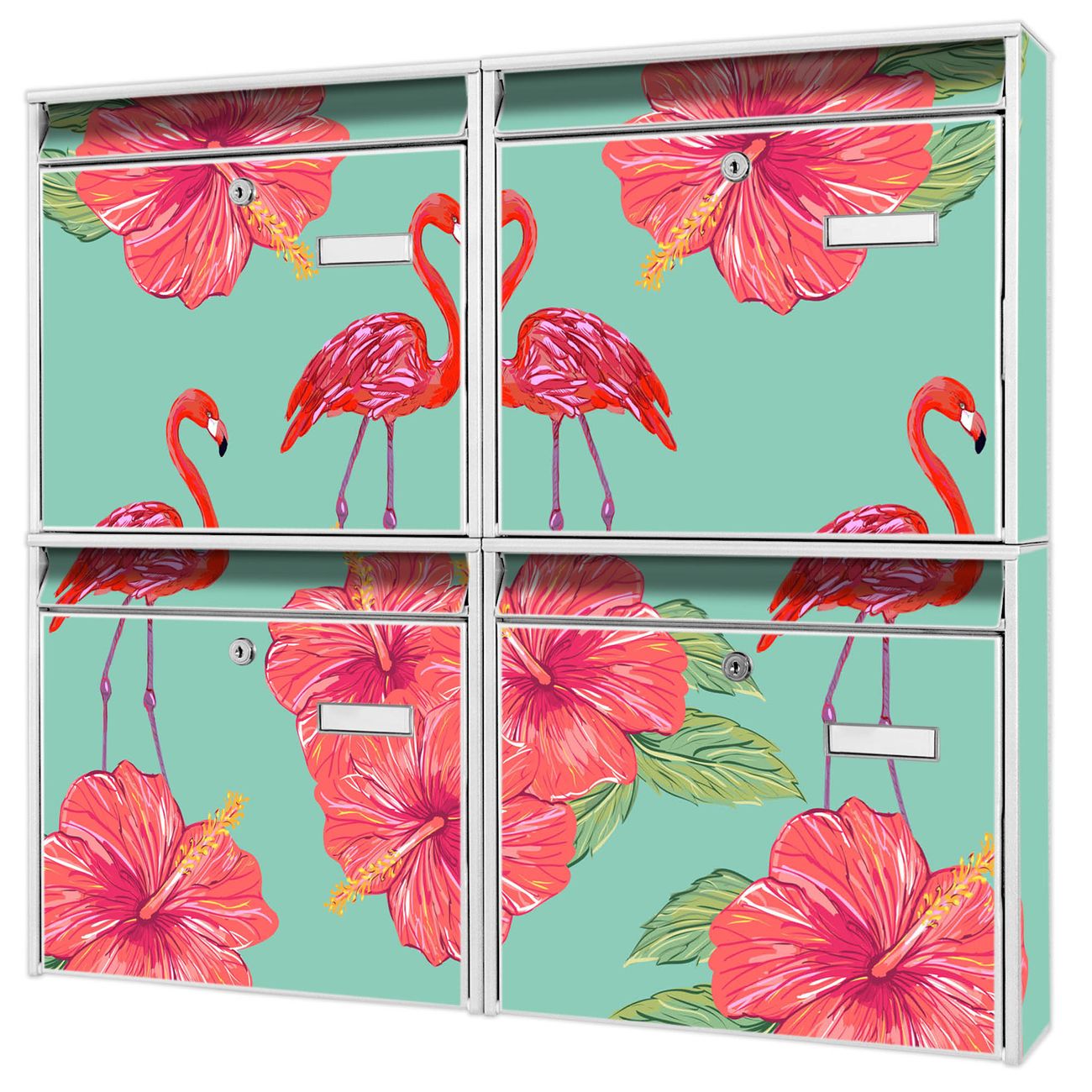 FUNKTION: Die Burg-Wächter Briefkastenanlage mit Motiv Flamingo Liebe bietet Ihnen ausreichend Fassungsvermögen um auch A4 und C4 Sendungen zu empfangen. Das integrierte Namensschild lässt sich individuell beschriften. Wählen Sie aus den Grundfarben weiß, silber und schwarz. DESIGN: Die 4 Briefkästen haben ein ansprechendes und zeitloses Design, ohne dabei auf Funktionalität zu verzichten. Das Material ist sehr stabil, wetterfest und rostfrei. Durch das Motiv Flamingo Liebe werden die Postkästen zu einem Blickfang. DETAILS: Die Postkästen bestehen aus verzinktem Stahl der zusätzlich mit Klarlack versiegelt wurde. Die Kästen sind gesamt 64,5cm hoch, 72,5cm breit und 10cm tief. Das Motiv besteht aus einer wetter- und UV-festen Folie, die Ihren Briefkasten zusätzlich vor Kratzern schützt. Die Postkästen werden mit Montagematerial, je einem Namensschild und je zwei Schlüsseln geliefert. NUTZEN: Das Briefkastenset eignet sich für die Wandmontage, die Größe bietet genügend Platz für Sendungen aller Art. Das zeitlose Design sowie die stabile Bauart bieten Ihnen einen treuen Begleiter für Ihre Post. BANJADO: