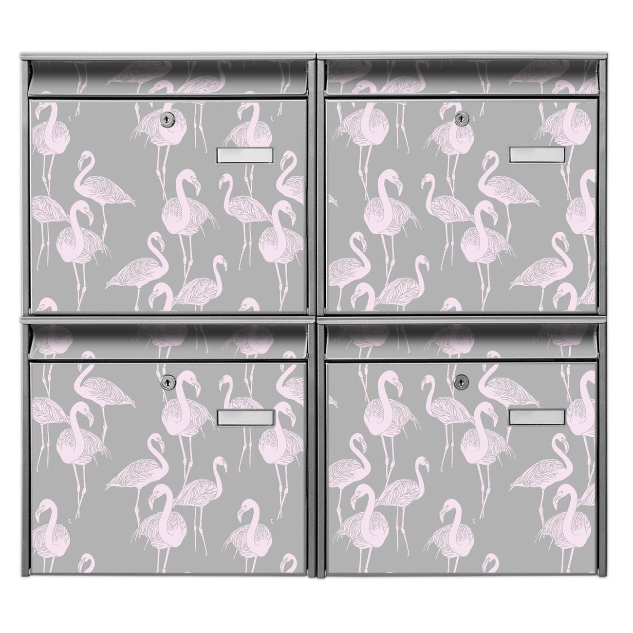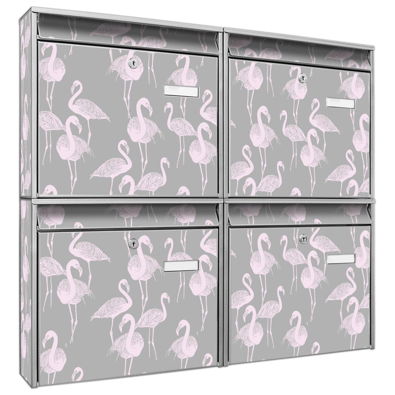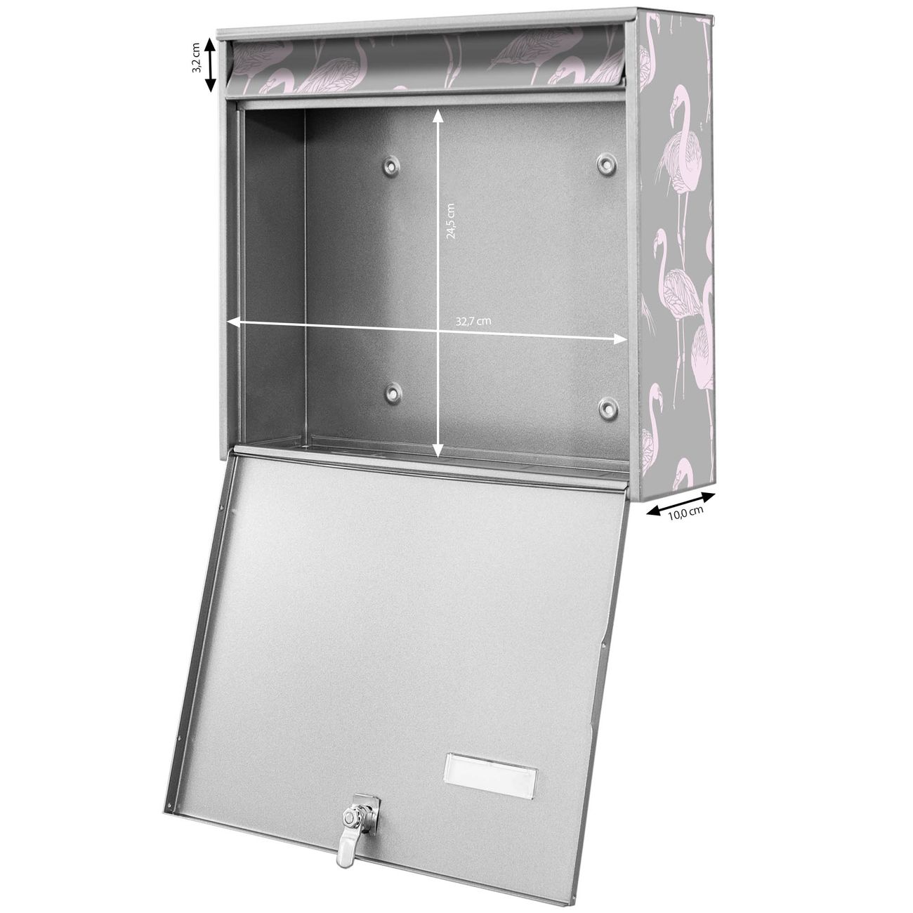 FUNKTION: Die Burg-Wächter Briefkastenanlage mit Motiv Flamingos Blass bietet Ihnen ausreichend Fassungsvermögen um auch A4 und C4 Sendungen zu empfangen. Das integrierte Namensschild lässt sich individuell beschriften. Wählen Sie aus den Grundfarben weiß, silber und schwarz. DESIGN: Die 4 Briefkästen haben ein ansprechendes und zeitloses Design, ohne dabei auf Funktionalität zu verzichten. Das Material ist sehr stabil, wetterfest und rostfrei. Durch das Motiv Flamingos Blass werden die Postkästen zu einem Blickfang. DETAILS: Die Postkästen bestehen aus verzinktem Stahl der zusätzlich mit Klarlack versiegelt wurde. Die Kästen sind gesamt 64,5cm hoch, 72,5cm breit und 10cm tief. Das Motiv besteht aus einer wetter- und UV-festen Folie, die Ihren Briefkasten zusätzlich vor Kratzern schützt. Die Postkästen werden mit Montagematerial, je einem Namensschild und je zwei Schlüsseln geliefert. NUTZEN: Das Briefkastenset eignet sich für die Wandmontage, die Größe bietet genügend Platz für Sendungen aller Art. Das zeitlose Design sowie die stabile Bauart bieten Ihnen einen treuen Begleiter für Ihre Post. BANJADO: