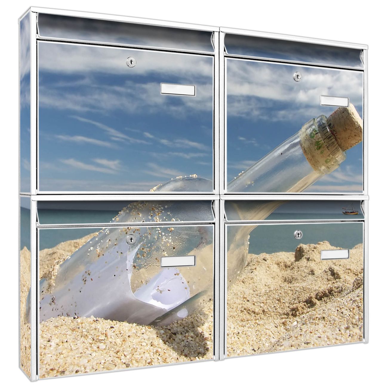FUNKTION: Die Burg-Wächter Briefkastenanlage mit Motiv Flaschenpost bietet Ihnen ausreichend Fassungsvermögen um auch A4 und C4 Sendungen zu empfangen. Das integrierte Namensschild lässt sich individuell beschriften. Wählen Sie aus den Grundfarben weiß, silber und schwarz. DESIGN: Die 4 Briefkästen haben ein ansprechendes und zeitloses Design, ohne dabei auf Funktionalität zu verzichten. Das Material ist sehr stabil, wetterfest und rostfrei. Durch das Motiv Flaschenpost werden die Postkästen zu einem Blickfang. DETAILS: Die Postkästen bestehen aus verzinktem Stahl der zusätzlich mit Klarlack versiegelt wurde. Die Kästen sind gesamt 64,5cm hoch, 72,5cm breit und 10cm tief. Das Motiv besteht aus einer wetter- und UV-festen Folie, die Ihren Briefkasten zusätzlich vor Kratzern schützt. Die Postkästen werden mit Montagematerial, je einem Namensschild und je zwei Schlüsseln geliefert. NUTZEN: Das Briefkastenset eignet sich für die Wandmontage, die Größe bietet genügend Platz für Sendungen aller Art. Das zeitlose Design sowie die stabile Bauart bieten Ihnen einen treuen Begleiter für Ihre Post. BANJADO: