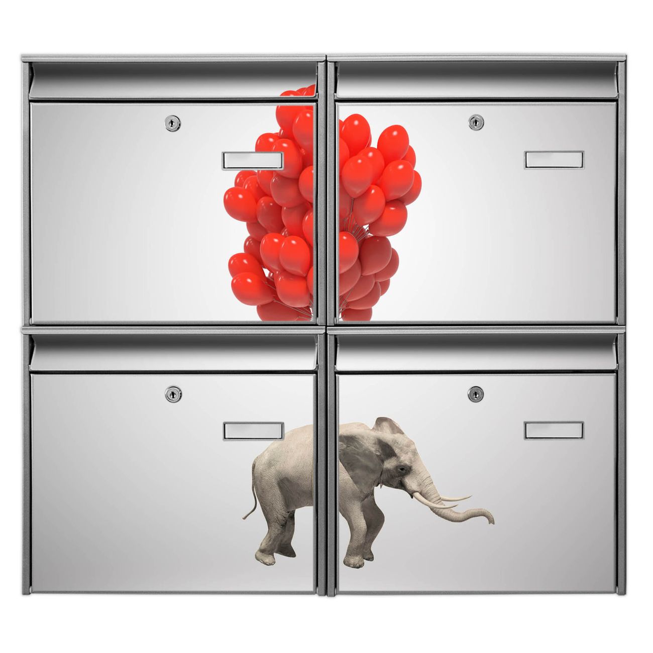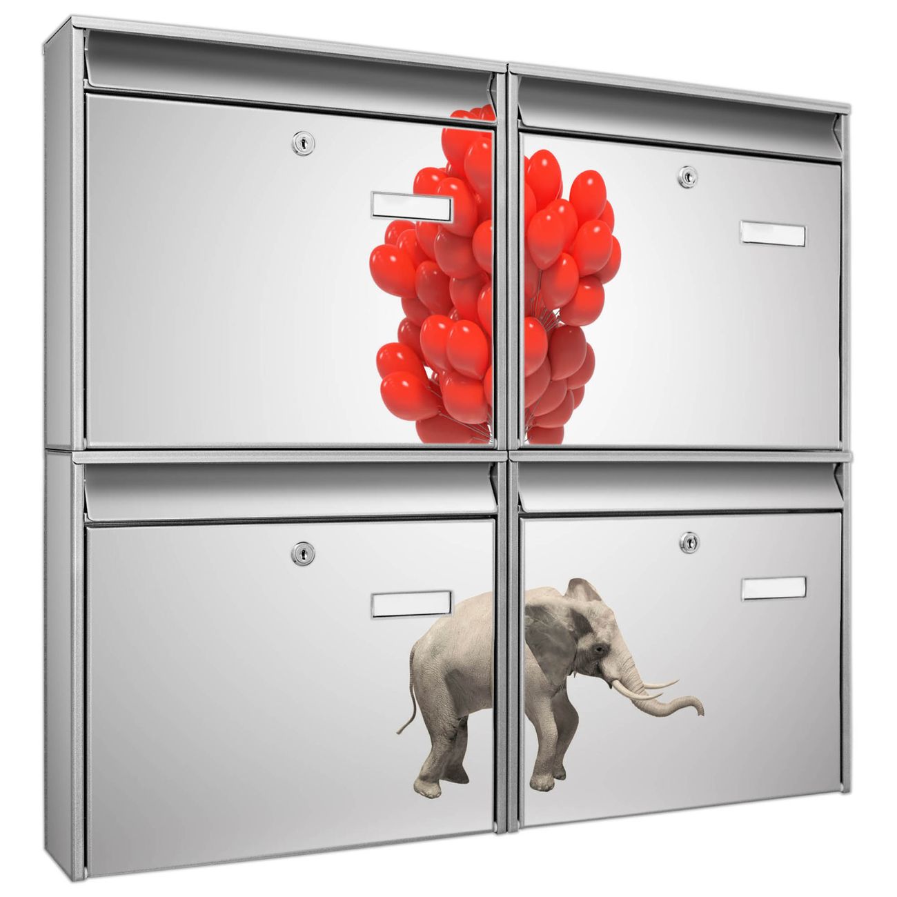 FUNKTION: Die Burg-Wächter Briefkastenanlage mit Motiv Fliegender Elefant bietet Ihnen ausreichend Fassungsvermögen um auch A4 und C4 Sendungen zu empfangen. Das integrierte Namensschild lässt sich individuell beschriften. Wählen Sie aus den Grundfarben weiß, silber und schwarz. DESIGN: Die 4 Briefkästen haben ein ansprechendes und zeitloses Design, ohne dabei auf Funktionalität zu verzichten. Das Material ist sehr stabil, wetterfest und rostfrei. Durch das Motiv Fliegender Elefant werden die Postkästen zu einem Blickfang. DETAILS: Die Postkästen bestehen aus verzinktem Stahl der zusätzlich mit Klarlack versiegelt wurde. Die Kästen sind gesamt 64,5cm hoch, 72,5cm breit und 10cm tief. Das Motiv besteht aus einer wetter- und UV-festen Folie, die Ihren Briefkasten zusätzlich vor Kratzern schützt. Die Postkästen werden mit Montagematerial, je einem Namensschild und je zwei Schlüsseln geliefert. NUTZEN: Das Briefkastenset eignet sich für die Wandmontage, die Größe bietet genügend Platz für Sendungen aller Art. Das zeitlose Design sowie die stabile Bauart bieten Ihnen einen treuen Begleiter für Ihre Post. BANJADO: