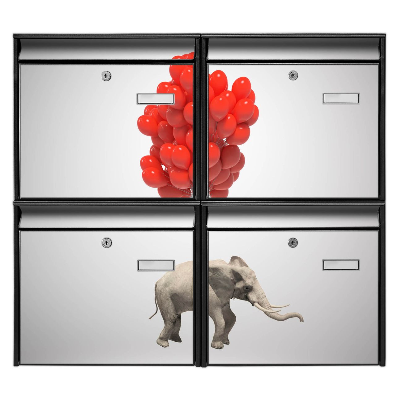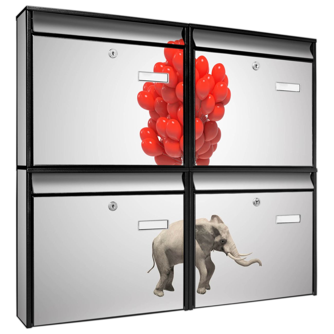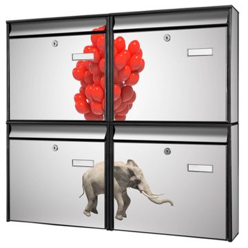 FUNKTION: Die Burg-Wächter Briefkastenanlage mit Motiv Fliegender Elefant bietet Ihnen ausreichend Fassungsvermögen um auch A4 und C4 Sendungen zu empfangen. Das integrierte Namensschild lässt sich individuell beschriften. Wählen Sie aus den Grundfarben weiß, silber und schwarz. DESIGN: Die 4 Briefkästen haben ein ansprechendes und zeitloses Design, ohne dabei auf Funktionalität zu verzichten. Das Material ist sehr stabil, wetterfest und rostfrei. Durch das Motiv Fliegender Elefant werden die Postkästen zu einem Blickfang. DETAILS: Die Postkästen bestehen aus verzinktem Stahl der zusätzlich mit Klarlack versiegelt wurde. Die Kästen sind gesamt 64,5cm hoch, 72,5cm breit und 10cm tief. Das Motiv besteht aus einer wetter- und UV-festen Folie, die Ihren Briefkasten zusätzlich vor Kratzern schützt. Die Postkästen werden mit Montagematerial, je einem Namensschild und je zwei Schlüsseln geliefert. NUTZEN: Das Briefkastenset eignet sich für die Wandmontage, die Größe bietet genügend Platz für Sendungen aller Art. Das zeitlose Design sowie die stabile Bauart bieten Ihnen einen treuen Begleiter für Ihre Post. BANJADO: