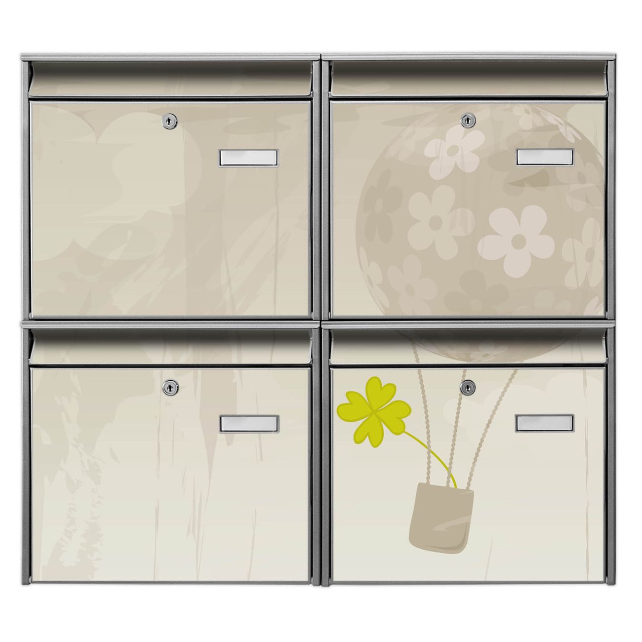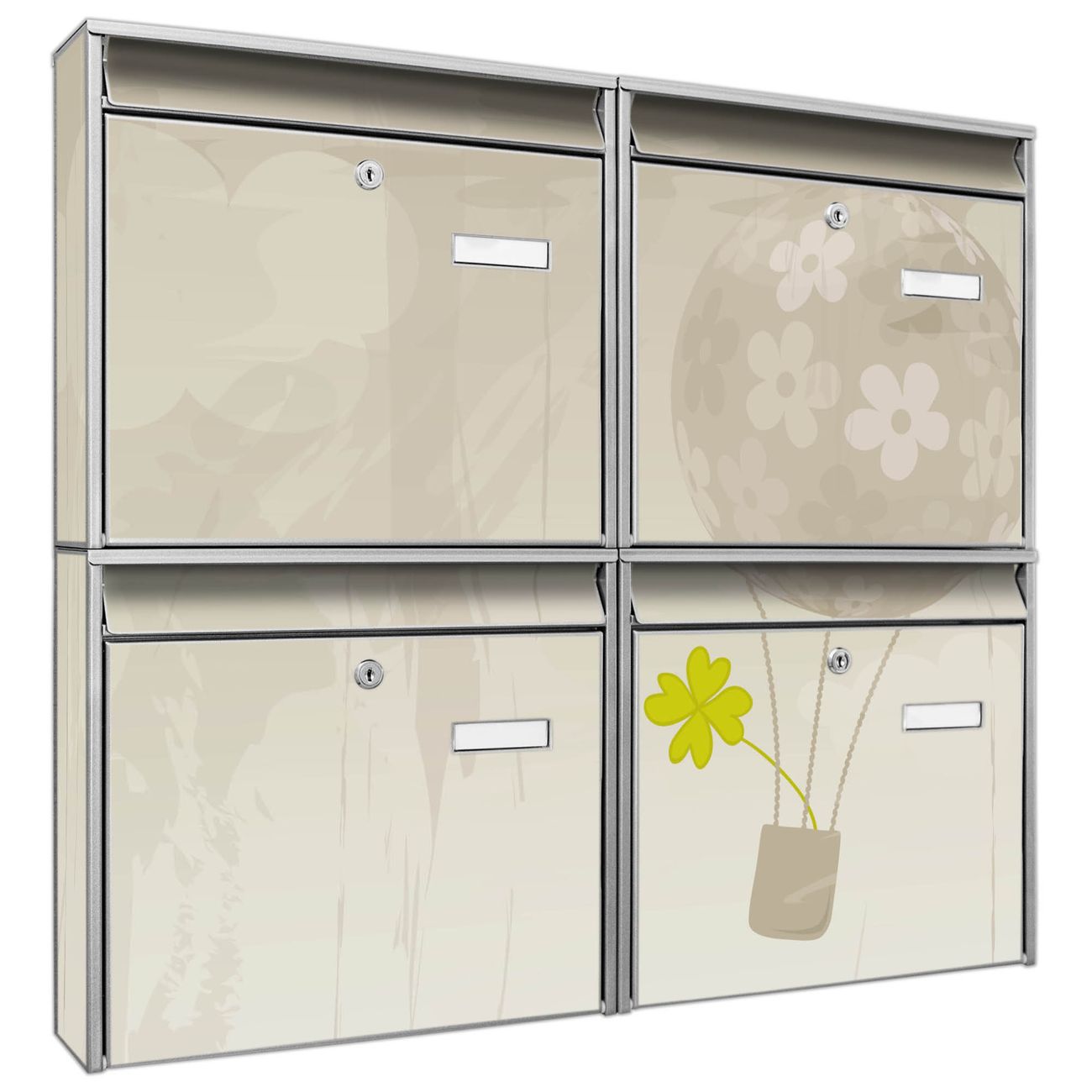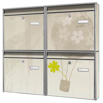 FUNKTION: Die Burg-Wächter Briefkastenanlage mit Motiv Flüchtiges Glück bietet Ihnen ausreichend Fassungsvermögen um auch A4 und C4 Sendungen zu empfangen. Das integrierte Namensschild lässt sich individuell beschriften. Wählen Sie aus den Grundfarben weiß, silber und schwarz. DESIGN: Die 4 Briefkästen haben ein ansprechendes und zeitloses Design, ohne dabei auf Funktionalität zu verzichten. Das Material ist sehr stabil, wetterfest und rostfrei. Durch das Motiv Flüchtiges Glück werden die Postkästen zu einem Blickfang. DETAILS: Die Postkästen bestehen aus verzinktem Stahl der zusätzlich mit Klarlack versiegelt wurde. Die Kästen sind gesamt 64,5cm hoch, 72,5cm breit und 10cm tief. Das Motiv besteht aus einer wetter- und UV-festen Folie, die Ihren Briefkasten zusätzlich vor Kratzern schützt. Die Postkästen werden mit Montagematerial, je einem Namensschild und je zwei Schlüsseln geliefert. NUTZEN: Das Briefkastenset eignet sich für die Wandmontage, die Größe bietet genügend Platz für Sendungen aller Art. Das zeitlose Design sowie die stabile Bauart bieten Ihnen einen treuen Begleiter für Ihre Post. BANJADO: