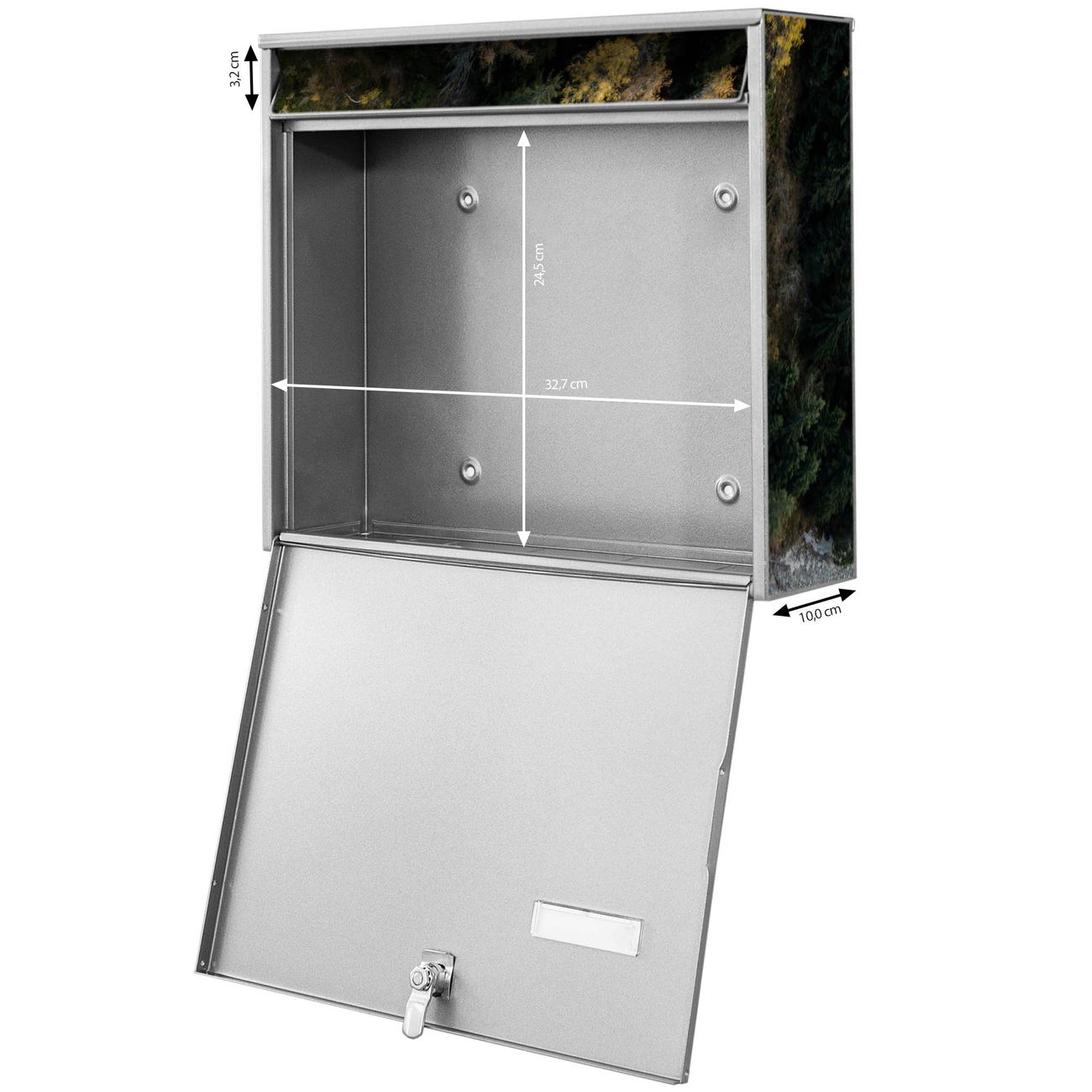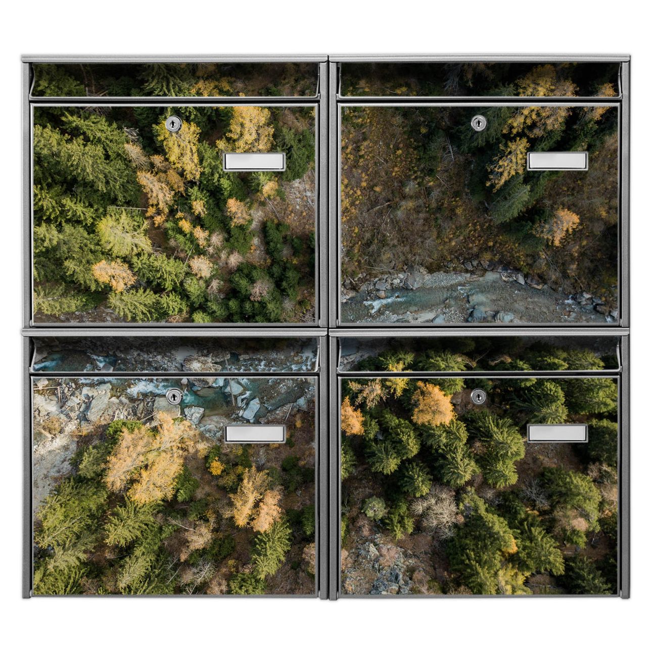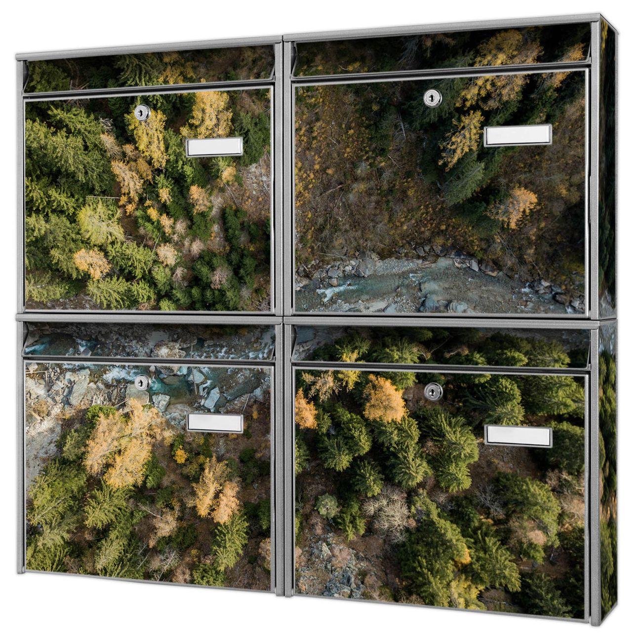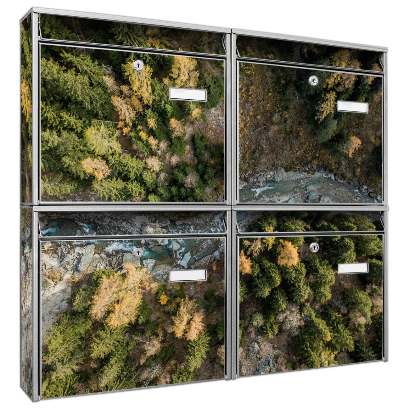 FUNKTION: Die Burg-Wächter Briefkastenanlage mit Motiv Fluss im Tal 2 bietet Ihnen ausreichend Fassungsvermögen um auch A4 und C4 Sendungen zu empfangen. Das integrierte Namensschild lässt sich individuell beschriften. Wählen Sie aus den Grundfarben weiß, silber und schwarz. DESIGN: Die 4 Briefkästen haben ein ansprechendes und zeitloses Design, ohne dabei auf Funktionalität zu verzichten. Das Material ist sehr stabil, wetterfest und rostfrei. Durch das Motiv Fluss im Tal 2 werden die Postkästen zu einem Blickfang. DETAILS: Die Postkästen bestehen aus verzinktem Stahl der zusätzlich mit Klarlack versiegelt wurde. Die Kästen sind gesamt 64,5cm hoch, 72,5cm breit und 10cm tief. Das Motiv besteht aus einer wetter- und UV-festen Folie, die Ihren Briefkasten zusätzlich vor Kratzern schützt. Die Postkästen werden mit Montagematerial, je einem Namensschild und je zwei Schlüsseln geliefert. NUTZEN: Das Briefkastenset eignet sich für die Wandmontage, die Größe bietet genügend Platz für Sendungen aller Art. Das zeitlose Design sowie die stabile Bauart bieten Ihnen einen treuen Begleiter für Ihre Post. BANJADO: