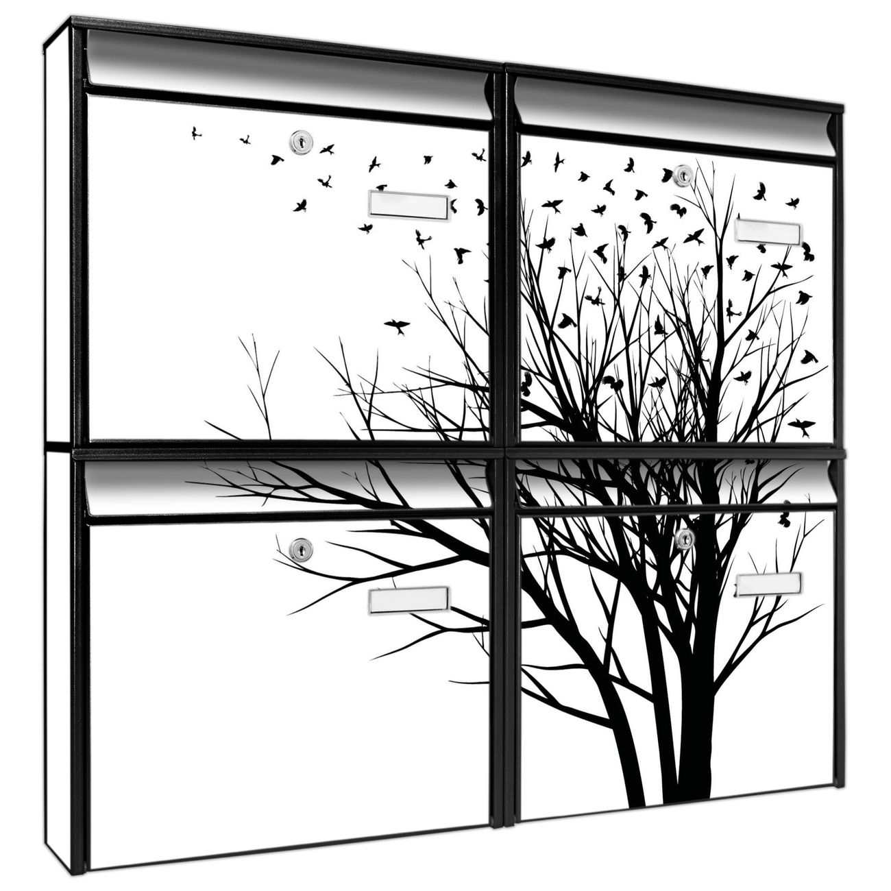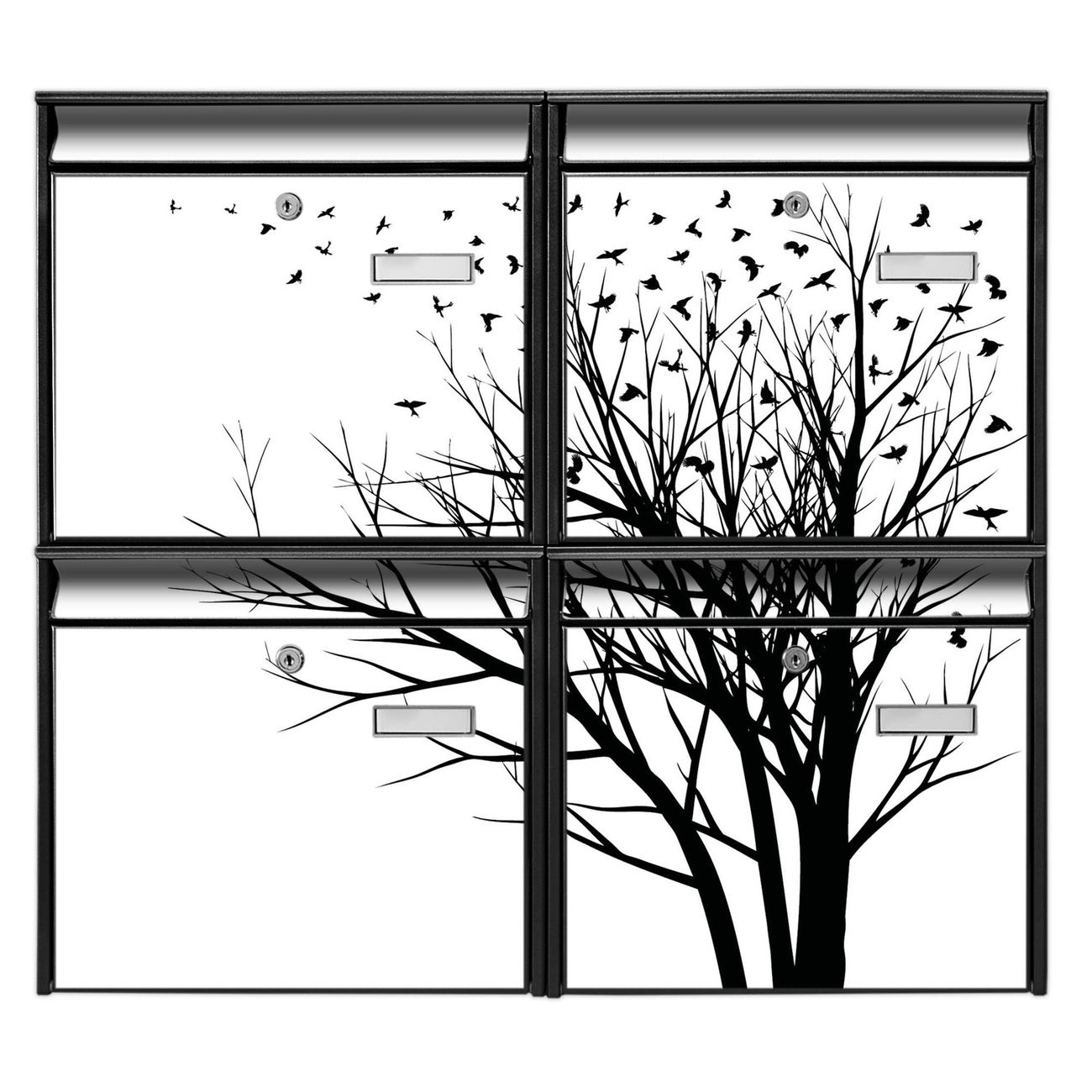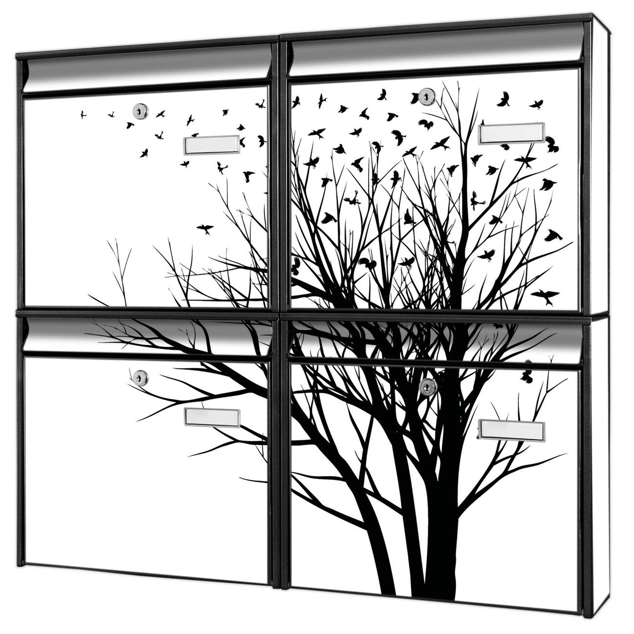 FUNKTION: Die Burg-Wächter Briefkastenanlage mit Motiv Fortfliegen bietet Ihnen ausreichend Fassungsvermögen um auch A4 und C4 Sendungen zu empfangen. Das integrierte Namensschild lässt sich individuell beschriften. Wählen Sie aus den Grundfarben weiß, silber und schwarz. DESIGN: Die 4 Briefkästen haben ein ansprechendes und zeitloses Design, ohne dabei auf Funktionalität zu verzichten. Das Material ist sehr stabil, wetterfest und rostfrei. Durch das Motiv Fortfliegen werden die Postkästen zu einem Blickfang. DETAILS: Die Postkästen bestehen aus verzinktem Stahl der zusätzlich mit Klarlack versiegelt wurde. Die Kästen sind gesamt 64,5cm hoch, 72,5cm breit und 10cm tief. Das Motiv besteht aus einer wetter- und UV-festen Folie, die Ihren Briefkasten zusätzlich vor Kratzern schützt. Die Postkästen werden mit Montagematerial, je einem Namensschild und je zwei Schlüsseln geliefert. NUTZEN: Das Briefkastenset eignet sich für die Wandmontage, die Größe bietet genügend Platz für Sendungen aller Art. Das zeitlose Design sowie die stabile Bauart bieten Ihnen einen treuen Begleiter für Ihre Post. BANJADO: