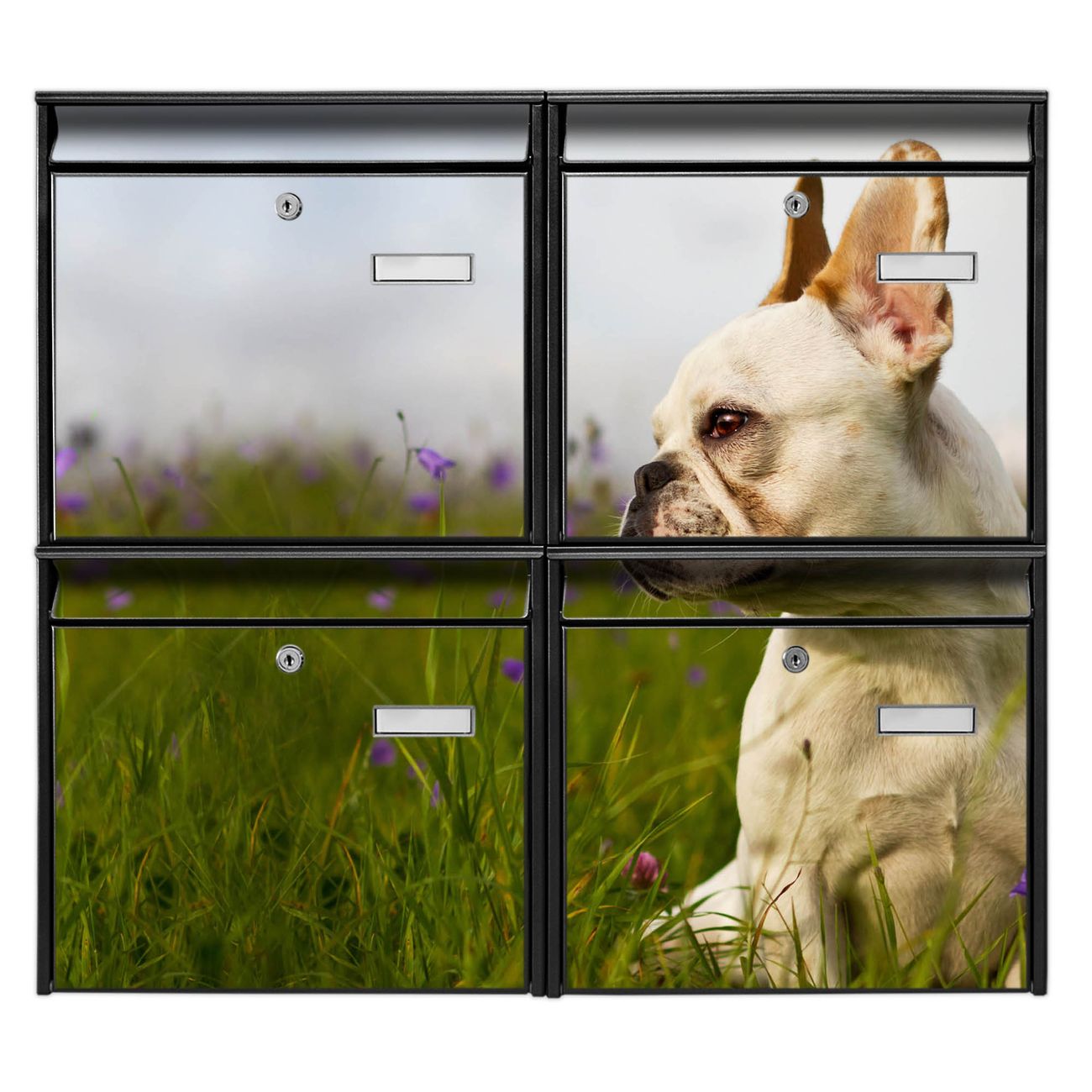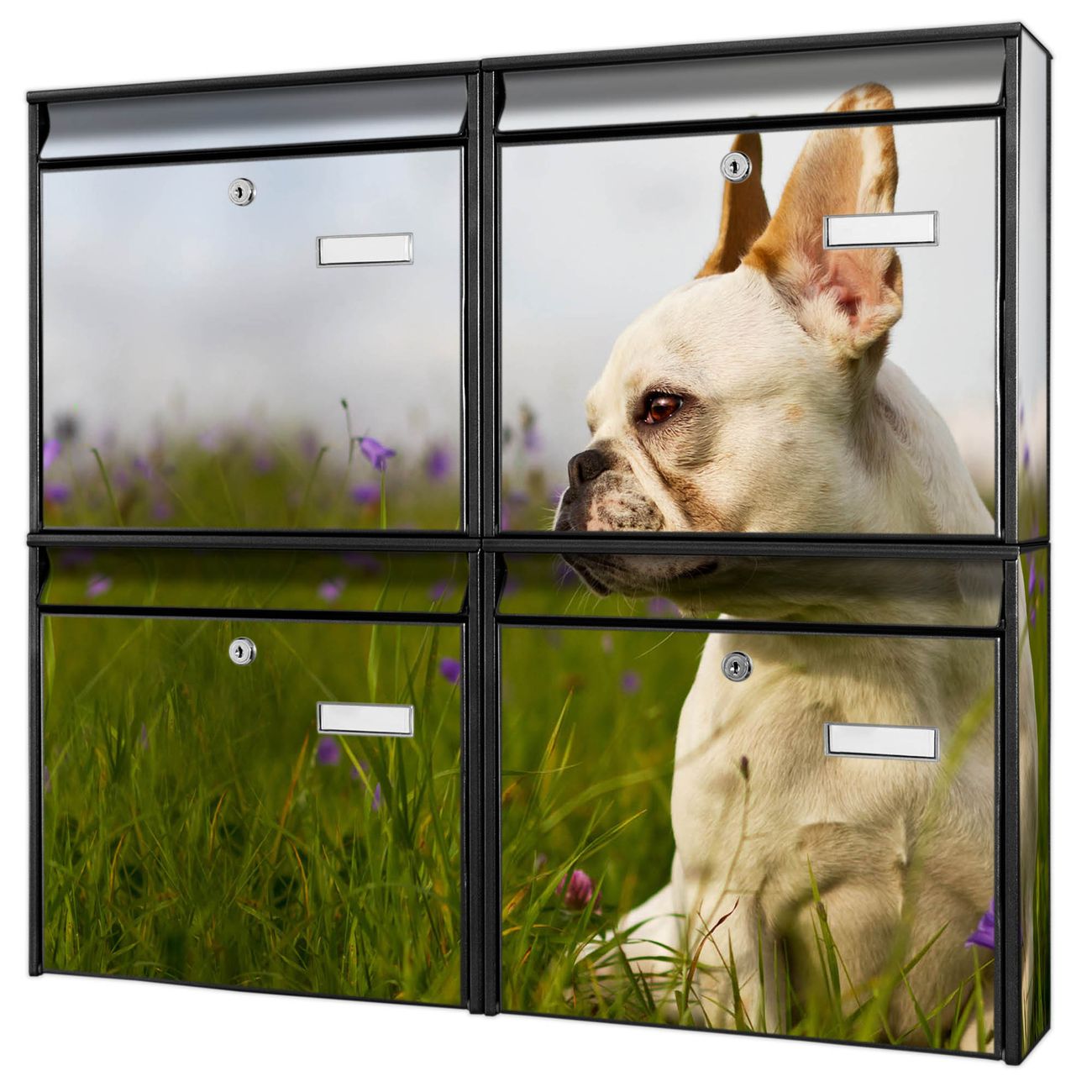 FUNKTION: Die Burg-Wächter Briefkastenanlage mit Motiv Französische Bulldogge bietet Ihnen ausreichend Fassungsvermögen um auch A4 und C4 Sendungen zu empfangen. Das integrierte Namensschild lässt sich individuell beschriften. Wählen Sie aus den Grundfarben weiß, silber und schwarz. DESIGN: Die 4 Briefkästen haben ein ansprechendes und zeitloses Design, ohne dabei auf Funktionalität zu verzichten. Das Material ist sehr stabil, wetterfest und rostfrei. Durch das Motiv Französische Bulldogge werden die Postkästen zu einem Blickfang. DETAILS: Die Postkästen bestehen aus verzinktem Stahl der zusätzlich mit Klarlack versiegelt wurde. Die Kästen sind gesamt 64,5cm hoch, 72,5cm breit und 10cm tief. Das Motiv besteht aus einer wetter- und UV-festen Folie, die Ihren Briefkasten zusätzlich vor Kratzern schützt. Die Postkästen werden mit Montagematerial, je einem Namensschild und je zwei Schlüsseln geliefert. NUTZEN: Das Briefkastenset eignet sich für die Wandmontage, die Größe bietet genügend Platz für Sendungen aller Art. Das zeitlose Design sowie die stabile Bauart bieten Ihnen einen treuen Begleiter für Ihre Post. BANJADO: