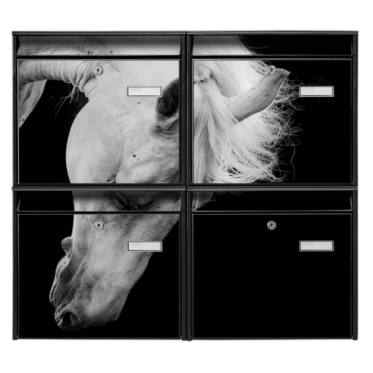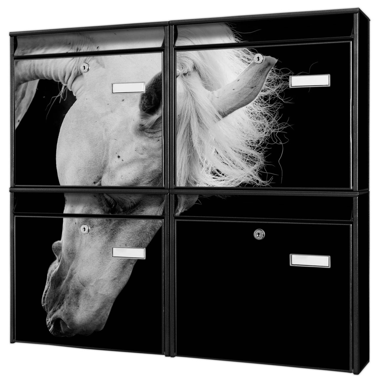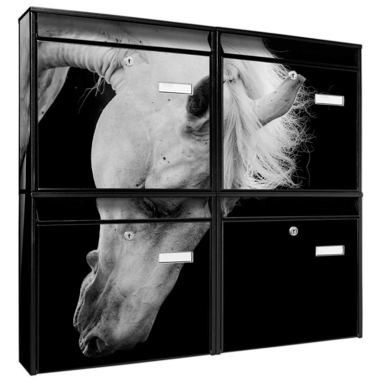 FUNKTION: Die Burg-Wächter Briefkastenanlage mit Motiv Frederik bietet Ihnen ausreichend Fassungsvermögen um auch A4 und C4 Sendungen zu empfangen. Das integrierte Namensschild lässt sich individuell beschriften. Wählen Sie aus den Grundfarben weiß, silber und schwarz. DESIGN: Die 4 Briefkästen haben ein ansprechendes und zeitloses Design, ohne dabei auf Funktionalität zu verzichten. Das Material ist sehr stabil, wetterfest und rostfrei. Durch das Motiv Frederik werden die Postkästen zu einem Blickfang. DETAILS: Die Postkästen bestehen aus verzinktem Stahl der zusätzlich mit Klarlack versiegelt wurde. Die Kästen sind gesamt 64,5cm hoch, 72,5cm breit und 10cm tief. Das Motiv besteht aus einer wetter- und UV-festen Folie, die Ihren Briefkasten zusätzlich vor Kratzern schützt. Die Postkästen werden mit Montagematerial, je einem Namensschild und je zwei Schlüsseln geliefert. NUTZEN: Das Briefkastenset eignet sich für die Wandmontage, die Größe bietet genügend Platz für Sendungen aller Art. Das zeitlose Design sowie die stabile Bauart bieten Ihnen einen treuen Begleiter für Ihre Post. BANJADO: