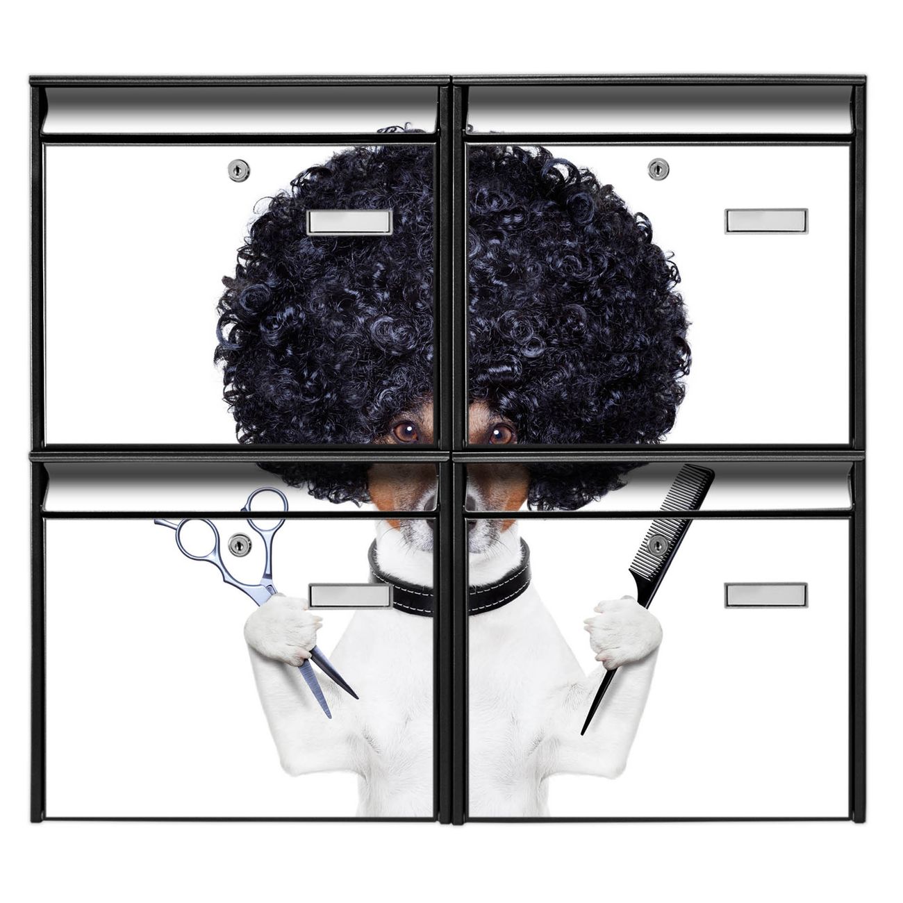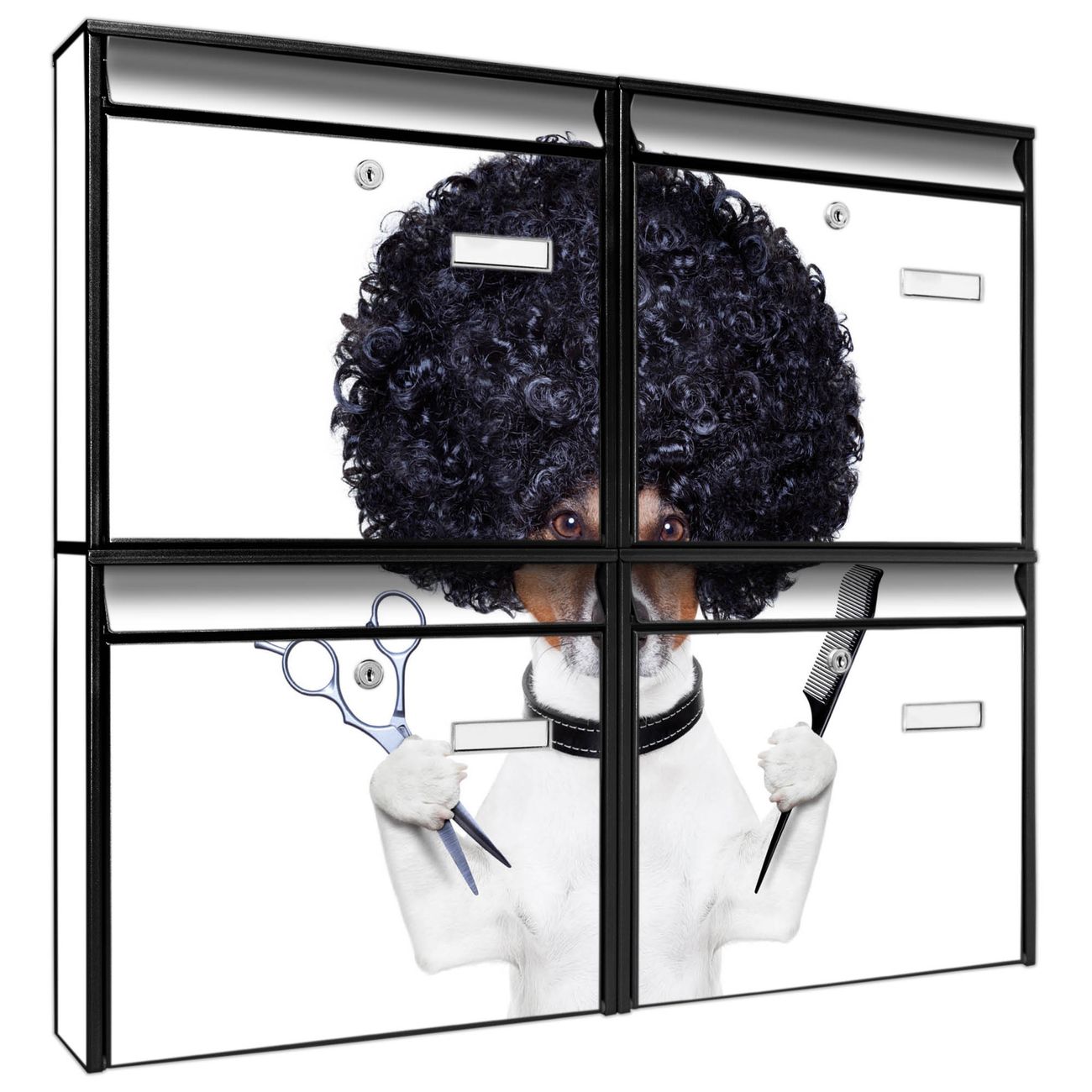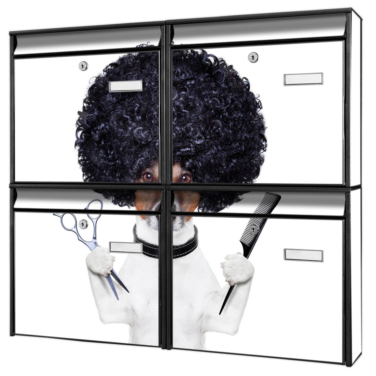 FUNKTION: Die Burg-Wächter Briefkastenanlage mit Motiv Friseur Jack Russel bietet Ihnen ausreichend Fassungsvermögen um auch A4 und C4 Sendungen zu empfangen. Das integrierte Namensschild lässt sich individuell beschriften. Wählen Sie aus den Grundfarben weiß, silber und schwarz. DESIGN: Die 4 Briefkästen haben ein ansprechendes und zeitloses Design, ohne dabei auf Funktionalität zu verzichten. Das Material ist sehr stabil, wetterfest und rostfrei. Durch das Motiv Friseur Jack Russel werden die Postkästen zu einem Blickfang. DETAILS: Die Postkästen bestehen aus verzinktem Stahl der zusätzlich mit Klarlack versiegelt wurde. Die Kästen sind gesamt 64,5cm hoch, 72,5cm breit und 10cm tief. Das Motiv besteht aus einer wetter- und UV-festen Folie, die Ihren Briefkasten zusätzlich vor Kratzern schützt. Die Postkästen werden mit Montagematerial, je einem Namensschild und je zwei Schlüsseln geliefert. NUTZEN: Das Briefkastenset eignet sich für die Wandmontage, die Größe bietet genügend Platz für Sendungen aller Art. Das zeitlose Design sowie die stabile Bauart bieten Ihnen einen treuen Begleiter für Ihre Post. BANJADO: