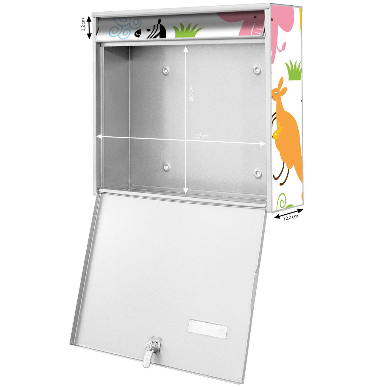 FUNKTION: Die Burg-Wächter Briefkastenanlage mit Motiv Fröhliche Tiere bietet Ihnen ausreichend Fassungsvermögen um auch A4 und C4 Sendungen zu empfangen. Das integrierte Namensschild lässt sich individuell beschriften. Wählen Sie aus den Grundfarben weiß, silber und schwarz. DESIGN: Die 4 Briefkästen haben ein ansprechendes und zeitloses Design, ohne dabei auf Funktionalität zu verzichten. Das Material ist sehr stabil, wetterfest und rostfrei. Durch das Motiv Fröhliche Tiere werden die Postkästen zu einem Blickfang. DETAILS: Die Postkästen bestehen aus verzinktem Stahl der zusätzlich mit Klarlack versiegelt wurde. Die Kästen sind gesamt 64,5cm hoch, 72,5cm breit und 10cm tief. Das Motiv besteht aus einer wetter- und UV-festen Folie, die Ihren Briefkasten zusätzlich vor Kratzern schützt. Die Postkästen werden mit Montagematerial, je einem Namensschild und je zwei Schlüsseln geliefert. NUTZEN: Das Briefkastenset eignet sich für die Wandmontage, die Größe bietet genügend Platz für Sendungen aller Art. Das zeitlose Design sowie die stabile Bauart bieten Ihnen einen treuen Begleiter für Ihre Post. BANJADO: