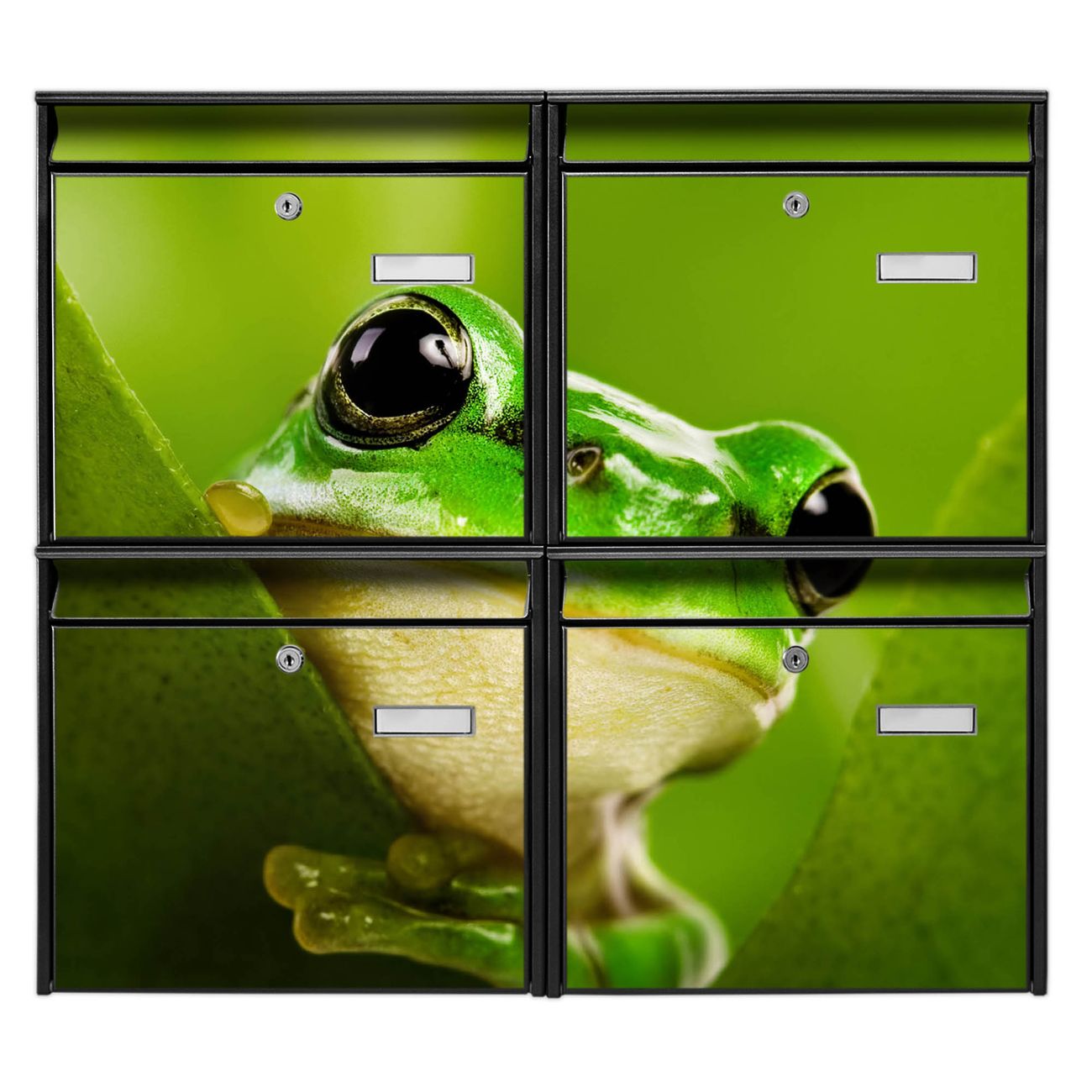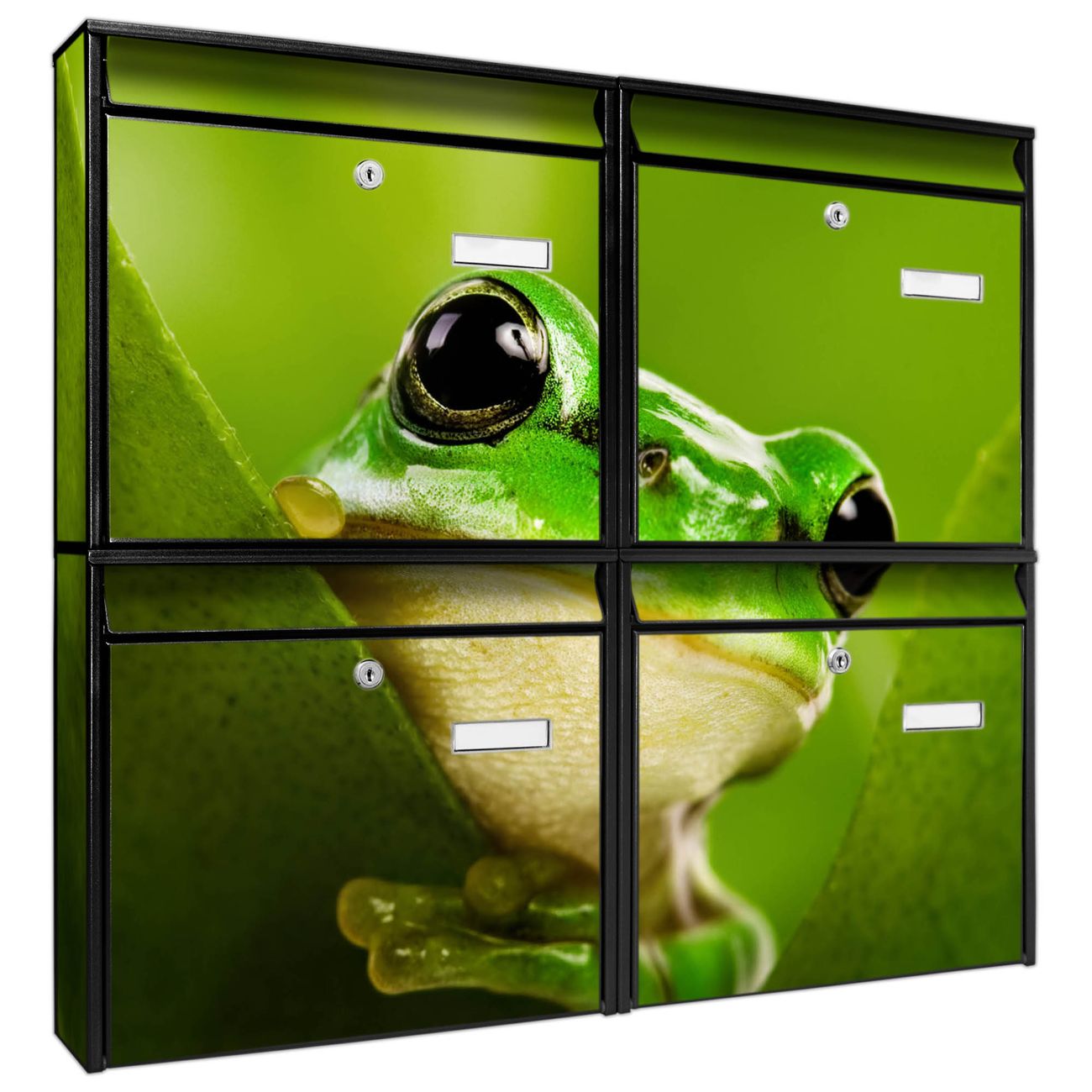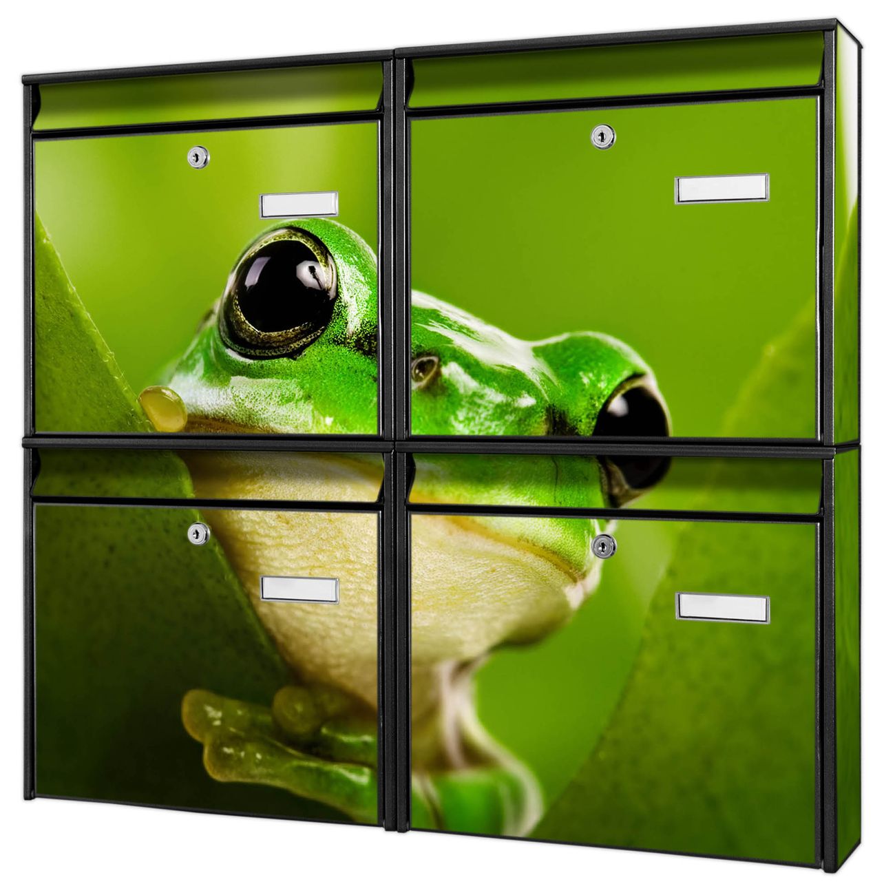 FUNKTION: Die Burg-Wächter Briefkastenanlage mit Motiv Frosch bietet Ihnen ausreichend Fassungsvermögen um auch A4 und C4 Sendungen zu empfangen. Das integrierte Namensschild lässt sich individuell beschriften. Wählen Sie aus den Grundfarben weiß, silber und schwarz. DESIGN: Die 4 Briefkästen haben ein ansprechendes und zeitloses Design, ohne dabei auf Funktionalität zu verzichten. Das Material ist sehr stabil, wetterfest und rostfrei. Durch das Motiv Frosch werden die Postkästen zu einem Blickfang. DETAILS: Die Postkästen bestehen aus verzinktem Stahl der zusätzlich mit Klarlack versiegelt wurde. Die Kästen sind gesamt 64,5cm hoch, 72,5cm breit und 10cm tief. Das Motiv besteht aus einer wetter- und UV-festen Folie, die Ihren Briefkasten zusätzlich vor Kratzern schützt. Die Postkästen werden mit Montagematerial, je einem Namensschild und je zwei Schlüsseln geliefert. NUTZEN: Das Briefkastenset eignet sich für die Wandmontage, die Größe bietet genügend Platz für Sendungen aller Art. Das zeitlose Design sowie die stabile Bauart bieten Ihnen einen treuen Begleiter für Ihre Post. BANJADO: