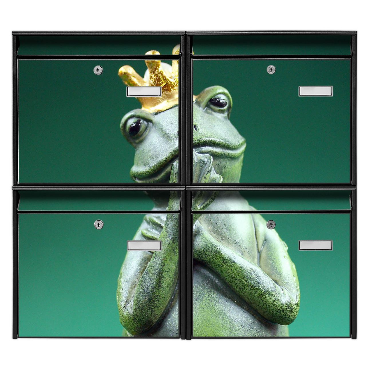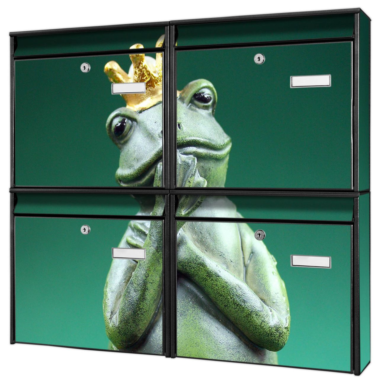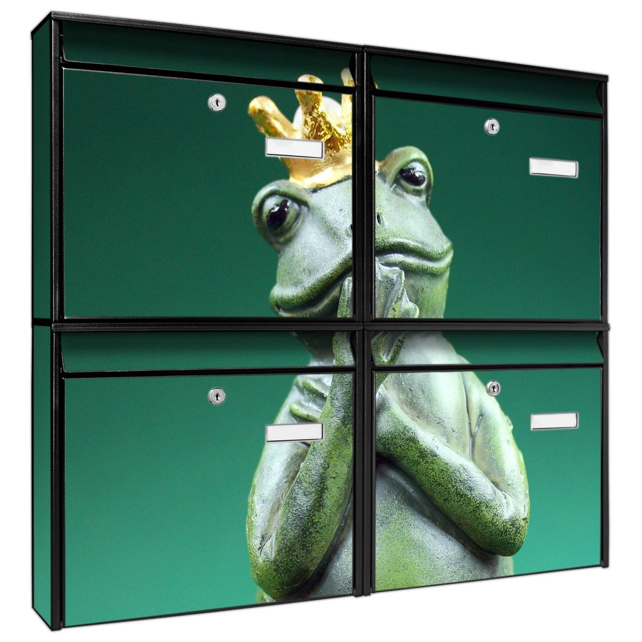 FUNKTION: Die Burg-Wächter Briefkastenanlage mit Motiv Froschkönig bietet Ihnen ausreichend Fassungsvermögen um auch A4 und C4 Sendungen zu empfangen. Das integrierte Namensschild lässt sich individuell beschriften. Wählen Sie aus den Grundfarben weiß, silber und schwarz. DESIGN: Die 4 Briefkästen haben ein ansprechendes und zeitloses Design, ohne dabei auf Funktionalität zu verzichten. Das Material ist sehr stabil, wetterfest und rostfrei. Durch das Motiv Froschkönig werden die Postkästen zu einem Blickfang. DETAILS: Die Postkästen bestehen aus verzinktem Stahl der zusätzlich mit Klarlack versiegelt wurde. Die Kästen sind gesamt 64,5cm hoch, 72,5cm breit und 10cm tief. Das Motiv besteht aus einer wetter- und UV-festen Folie, die Ihren Briefkasten zusätzlich vor Kratzern schützt. Die Postkästen werden mit Montagematerial, je einem Namensschild und je zwei Schlüsseln geliefert. NUTZEN: Das Briefkastenset eignet sich für die Wandmontage, die Größe bietet genügend Platz für Sendungen aller Art. Das zeitlose Design sowie die stabile Bauart bieten Ihnen einen treuen Begleiter für Ihre Post. BANJADO: