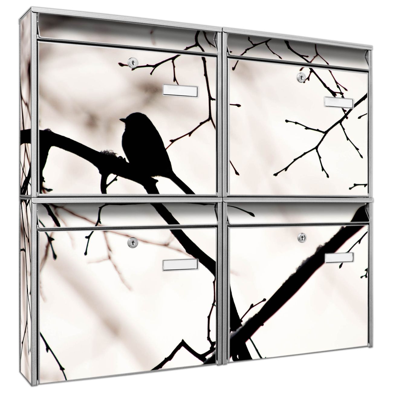FUNKTION: Die Burg-Wächter Briefkastenanlage mit Motiv Früher Vogel bietet Ihnen ausreichend Fassungsvermögen um auch A4 und C4 Sendungen zu empfangen. Das integrierte Namensschild lässt sich individuell beschriften. Wählen Sie aus den Grundfarben weiß, silber und schwarz. DESIGN: Die 4 Briefkästen haben ein ansprechendes und zeitloses Design, ohne dabei auf Funktionalität zu verzichten. Das Material ist sehr stabil, wetterfest und rostfrei. Durch das Motiv Früher Vogel werden die Postkästen zu einem Blickfang. DETAILS: Die Postkästen bestehen aus verzinktem Stahl der zusätzlich mit Klarlack versiegelt wurde. Die Kästen sind gesamt 64,5cm hoch, 72,5cm breit und 10cm tief. Das Motiv besteht aus einer wetter- und UV-festen Folie, die Ihren Briefkasten zusätzlich vor Kratzern schützt. Die Postkästen werden mit Montagematerial, je einem Namensschild und je zwei Schlüsseln geliefert. NUTZEN: Das Briefkastenset eignet sich für die Wandmontage, die Größe bietet genügend Platz für Sendungen aller Art. Das zeitlose Design sowie die stabile Bauart bieten Ihnen einen treuen Begleiter für Ihre Post. BANJADO:
