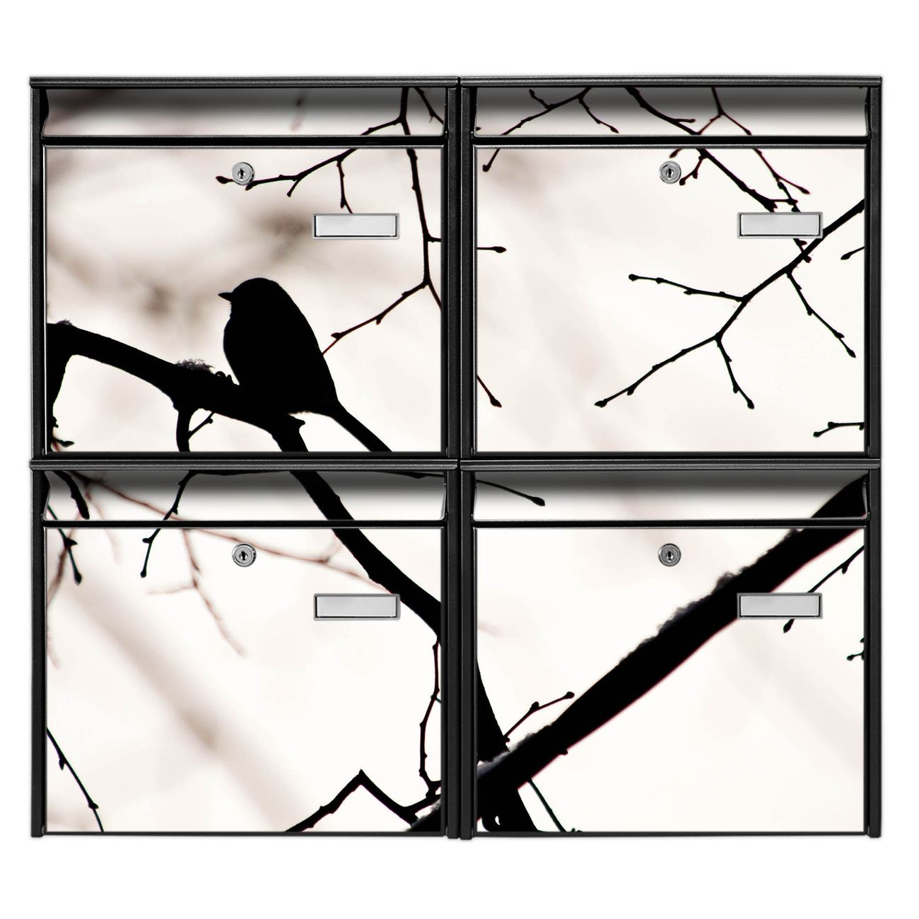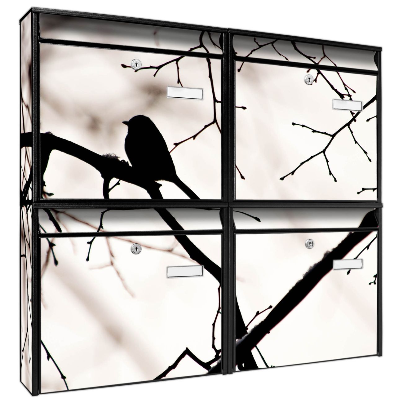 FUNKTION: Die Burg-Wächter Briefkastenanlage mit Motiv Früher Vogel bietet Ihnen ausreichend Fassungsvermögen um auch A4 und C4 Sendungen zu empfangen. Das integrierte Namensschild lässt sich individuell beschriften. Wählen Sie aus den Grundfarben weiß, silber und schwarz. DESIGN: Die 4 Briefkästen haben ein ansprechendes und zeitloses Design, ohne dabei auf Funktionalität zu verzichten. Das Material ist sehr stabil, wetterfest und rostfrei. Durch das Motiv Früher Vogel werden die Postkästen zu einem Blickfang. DETAILS: Die Postkästen bestehen aus verzinktem Stahl der zusätzlich mit Klarlack versiegelt wurde. Die Kästen sind gesamt 64,5cm hoch, 72,5cm breit und 10cm tief. Das Motiv besteht aus einer wetter- und UV-festen Folie, die Ihren Briefkasten zusätzlich vor Kratzern schützt. Die Postkästen werden mit Montagematerial, je einem Namensschild und je zwei Schlüsseln geliefert. NUTZEN: Das Briefkastenset eignet sich für die Wandmontage, die Größe bietet genügend Platz für Sendungen aller Art. Das zeitlose Design sowie die stabile Bauart bieten Ihnen einen treuen Begleiter für Ihre Post. BANJADO: