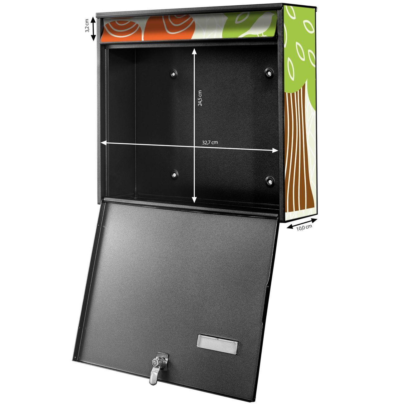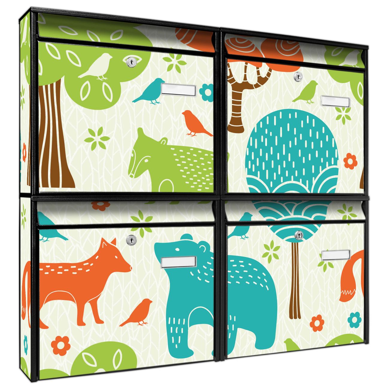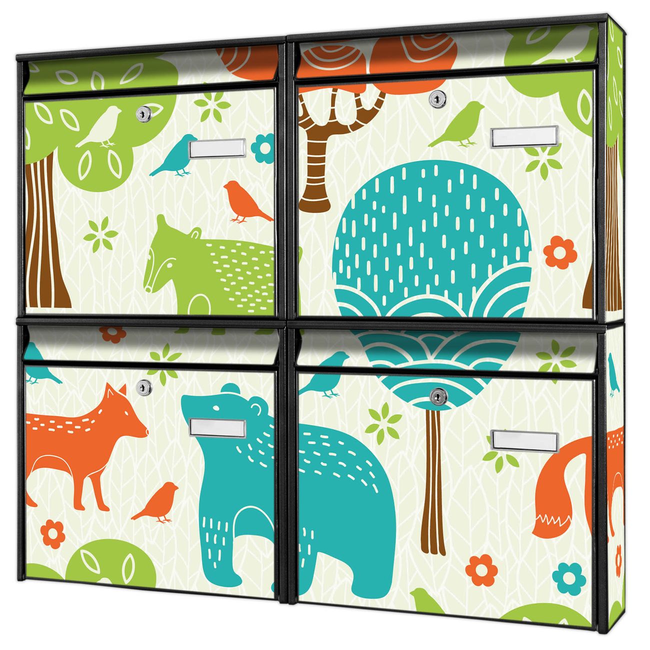 FUNKTION: Die Burg-Wächter Briefkastenanlage mit Motiv Fuchs Bär Wald bietet Ihnen ausreichend Fassungsvermögen um auch A4 und C4 Sendungen zu empfangen. Das integrierte Namensschild lässt sich individuell beschriften. Wählen Sie aus den Grundfarben weiß, silber und schwarz. DESIGN: Die 4 Briefkästen haben ein ansprechendes und zeitloses Design, ohne dabei auf Funktionalität zu verzichten. Das Material ist sehr stabil, wetterfest und rostfrei. Durch das Motiv Fuchs Bär Wald werden die Postkästen zu einem Blickfang. DETAILS: Die Postkästen bestehen aus verzinktem Stahl der zusätzlich mit Klarlack versiegelt wurde. Die Kästen sind gesamt 64,5cm hoch, 72,5cm breit und 10cm tief. Das Motiv besteht aus einer wetter- und UV-festen Folie, die Ihren Briefkasten zusätzlich vor Kratzern schützt. Die Postkästen werden mit Montagematerial, je einem Namensschild und je zwei Schlüsseln geliefert. NUTZEN: Das Briefkastenset eignet sich für die Wandmontage, die Größe bietet genügend Platz für Sendungen aller Art. Das zeitlose Design sowie die stabile Bauart bieten Ihnen einen treuen Begleiter für Ihre Post. BANJADO: