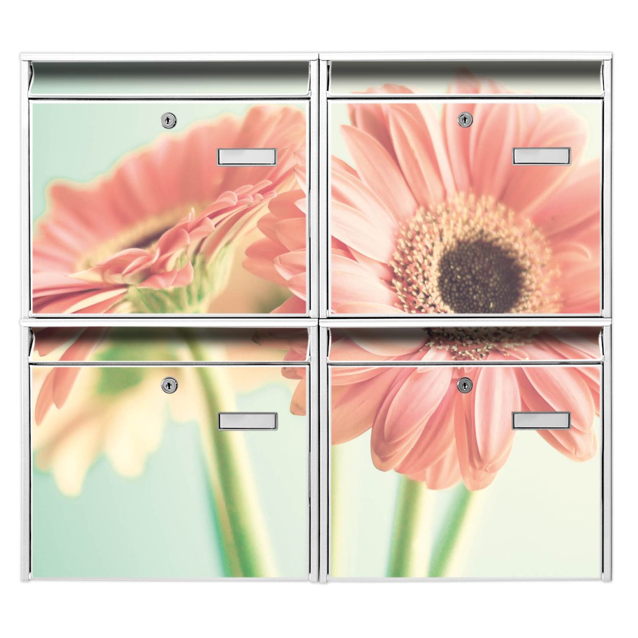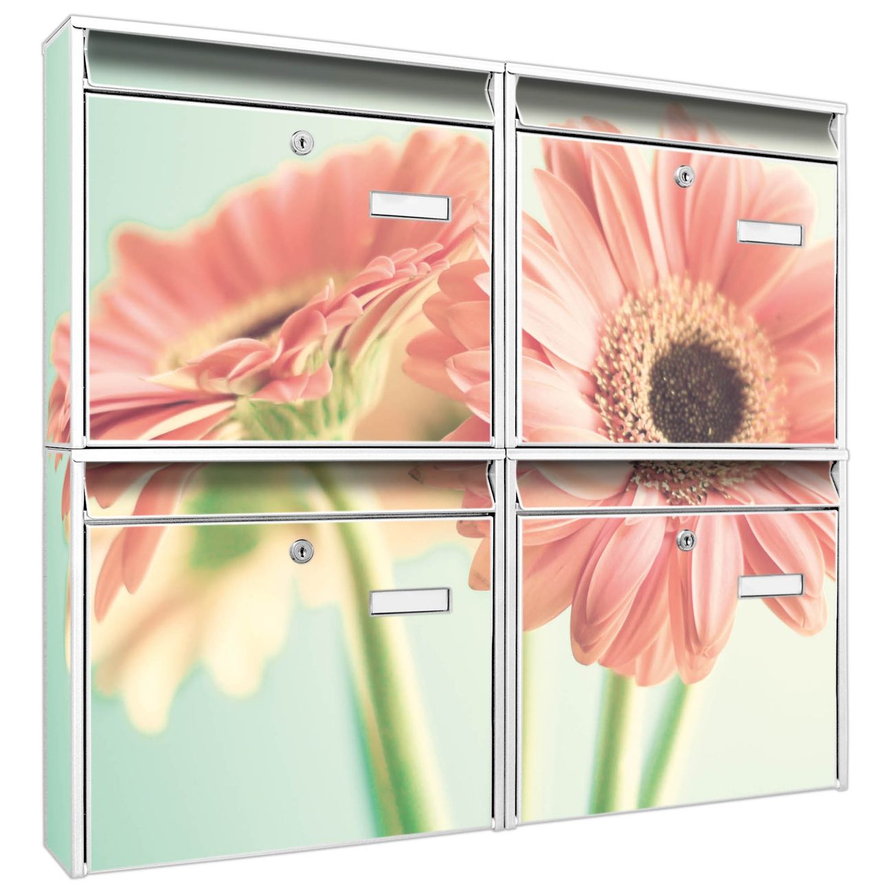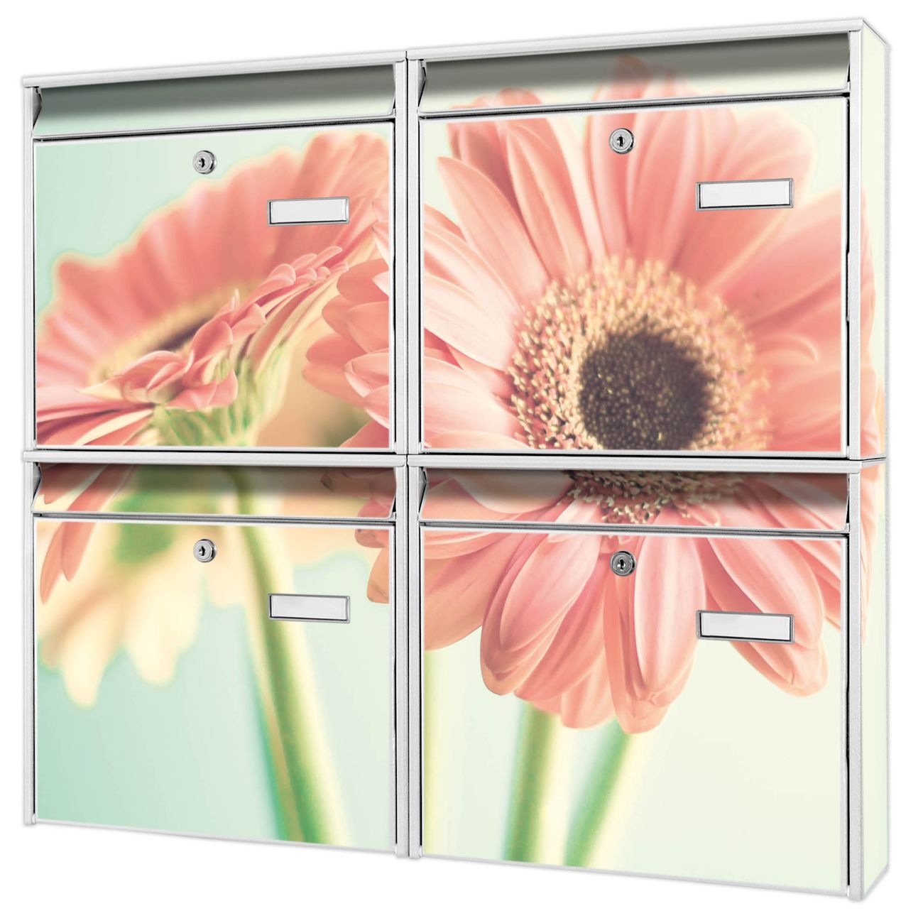 FUNKTION: Die Burg-Wächter Briefkastenanlage mit Motiv Fünf Gerbera bietet Ihnen ausreichend Fassungsvermögen um auch A4 und C4 Sendungen zu empfangen. Das integrierte Namensschild lässt sich individuell beschriften. Wählen Sie aus den Grundfarben weiß, silber und schwarz. DESIGN: Die 4 Briefkästen haben ein ansprechendes und zeitloses Design, ohne dabei auf Funktionalität zu verzichten. Das Material ist sehr stabil, wetterfest und rostfrei. Durch das Motiv Fünf Gerbera werden die Postkästen zu einem Blickfang. DETAILS: Die Postkästen bestehen aus verzinktem Stahl der zusätzlich mit Klarlack versiegelt wurde. Die Kästen sind gesamt 64,5cm hoch, 72,5cm breit und 10cm tief. Das Motiv besteht aus einer wetter- und UV-festen Folie, die Ihren Briefkasten zusätzlich vor Kratzern schützt. Die Postkästen werden mit Montagematerial, je einem Namensschild und je zwei Schlüsseln geliefert. NUTZEN: Das Briefkastenset eignet sich für die Wandmontage, die Größe bietet genügend Platz für Sendungen aller Art. Das zeitlose Design sowie die stabile Bauart bieten Ihnen einen treuen Begleiter für Ihre Post. BANJADO: