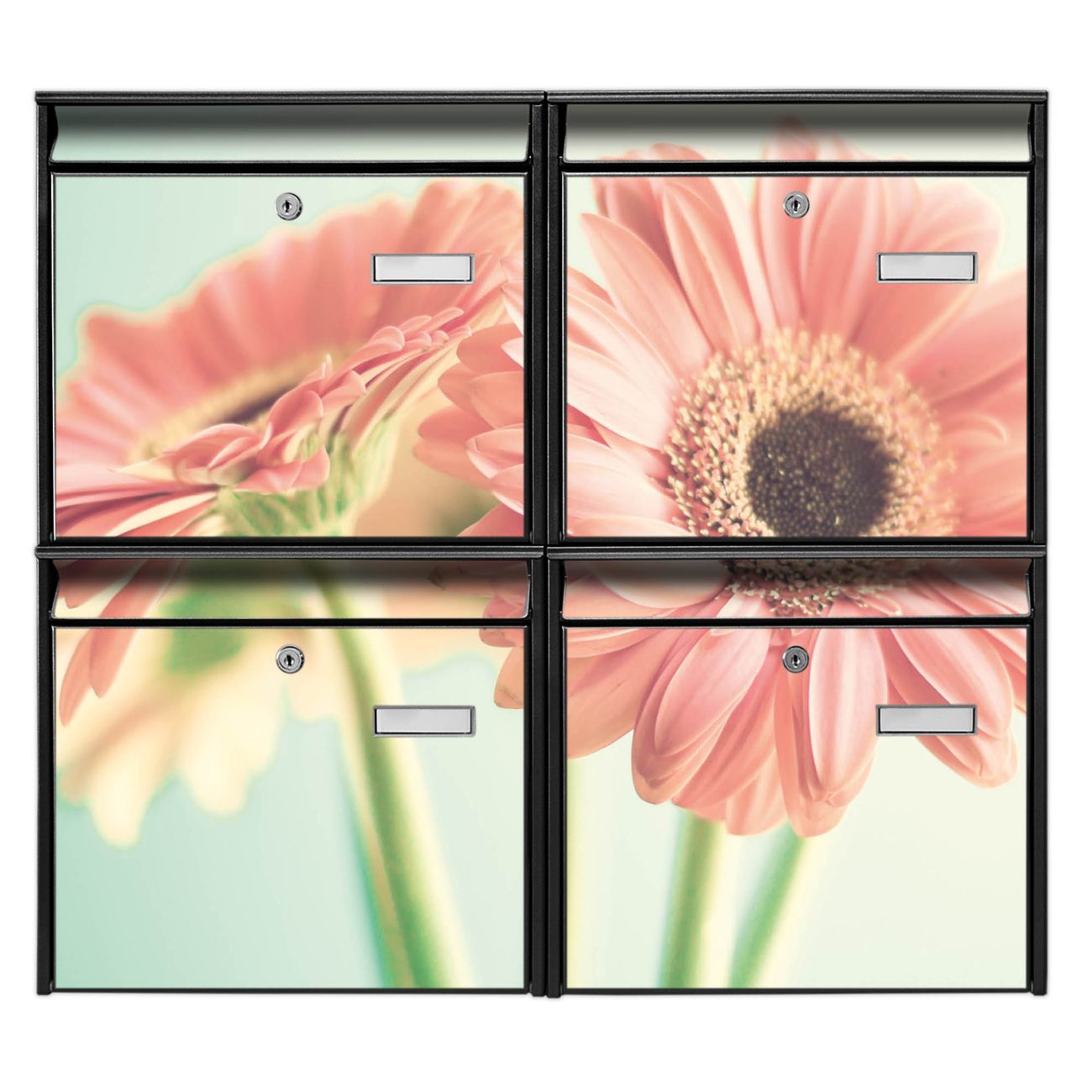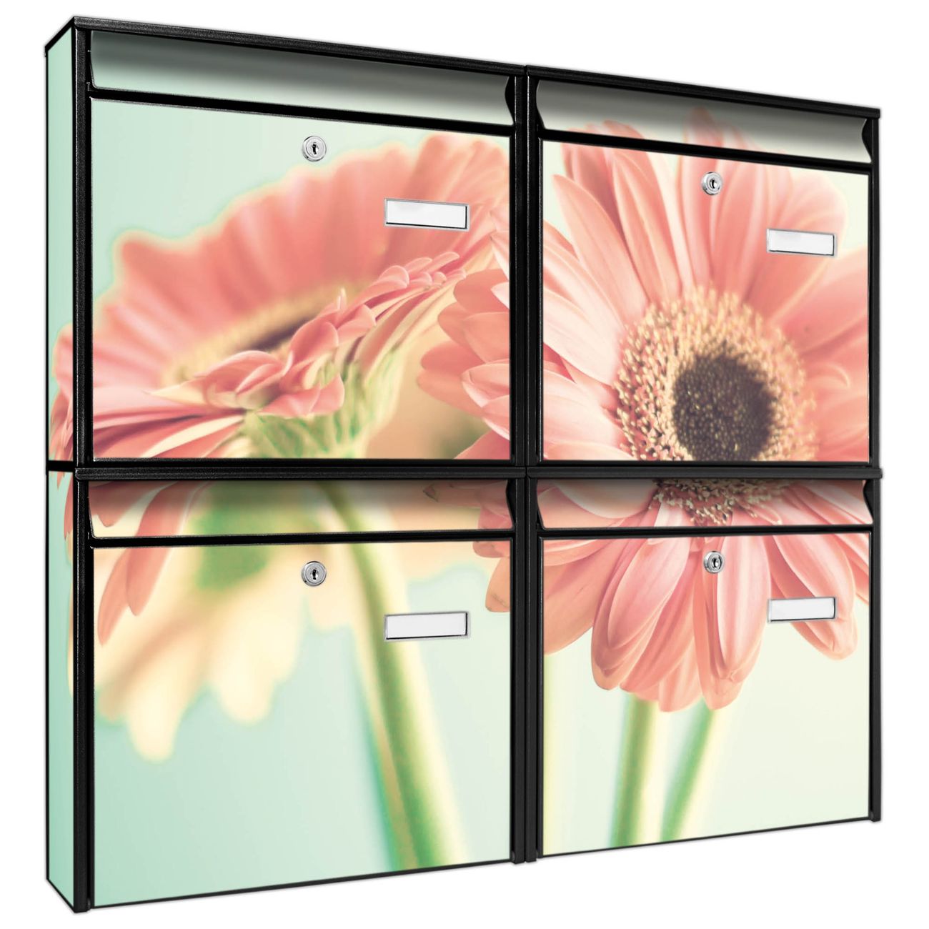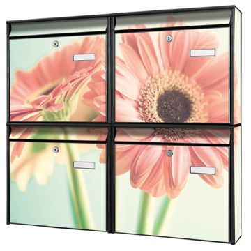 FUNKTION: Die Burg-Wächter Briefkastenanlage mit Motiv Fünf Gerbera bietet Ihnen ausreichend Fassungsvermögen um auch A4 und C4 Sendungen zu empfangen. Das integrierte Namensschild lässt sich individuell beschriften. Wählen Sie aus den Grundfarben weiß, silber und schwarz. DESIGN: Die 4 Briefkästen haben ein ansprechendes und zeitloses Design, ohne dabei auf Funktionalität zu verzichten. Das Material ist sehr stabil, wetterfest und rostfrei. Durch das Motiv Fünf Gerbera werden die Postkästen zu einem Blickfang. DETAILS: Die Postkästen bestehen aus verzinktem Stahl der zusätzlich mit Klarlack versiegelt wurde. Die Kästen sind gesamt 64,5cm hoch, 72,5cm breit und 10cm tief. Das Motiv besteht aus einer wetter- und UV-festen Folie, die Ihren Briefkasten zusätzlich vor Kratzern schützt. Die Postkästen werden mit Montagematerial, je einem Namensschild und je zwei Schlüsseln geliefert. NUTZEN: Das Briefkastenset eignet sich für die Wandmontage, die Größe bietet genügend Platz für Sendungen aller Art. Das zeitlose Design sowie die stabile Bauart bieten Ihnen einen treuen Begleiter für Ihre Post. BANJADO: