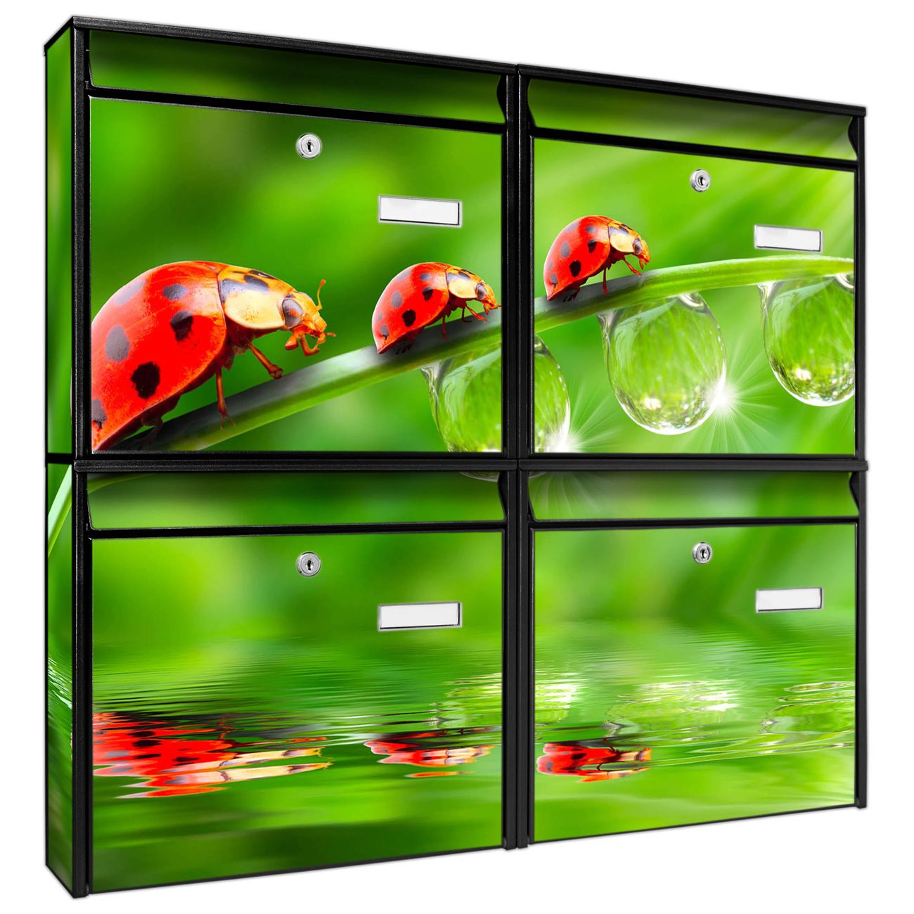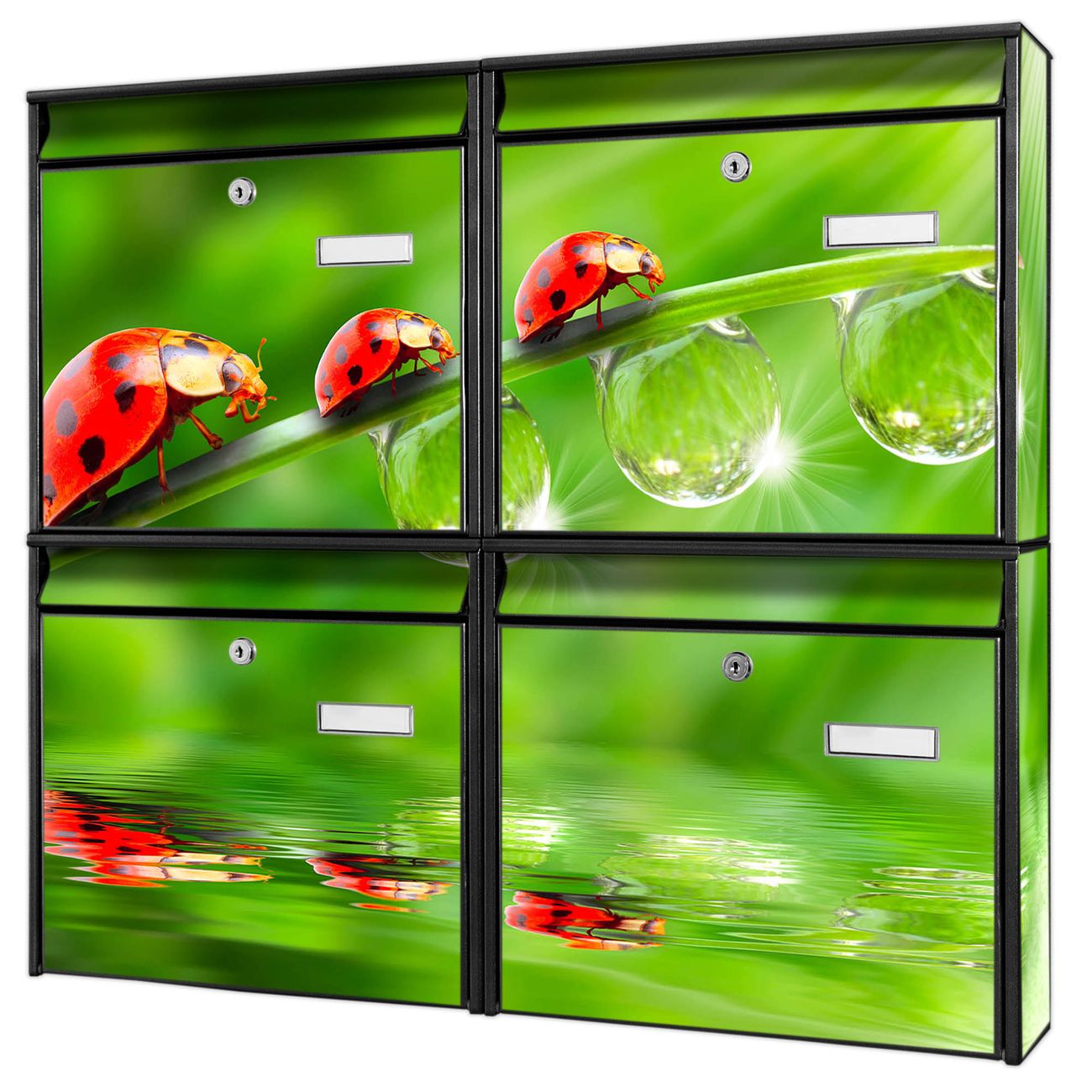 FUNKTION: Die Burg-Wächter Briefkastenanlage mit Motiv Für Jeden Einen bietet Ihnen ausreichend Fassungsvermögen um auch A4 und C4 Sendungen zu empfangen. Das integrierte Namensschild lässt sich individuell beschriften. Wählen Sie aus den Grundfarben weiß, silber und schwarz. DESIGN: Die 4 Briefkästen haben ein ansprechendes und zeitloses Design, ohne dabei auf Funktionalität zu verzichten. Das Material ist sehr stabil, wetterfest und rostfrei. Durch das Motiv Für Jeden Einen werden die Postkästen zu einem Blickfang. DETAILS: Die Postkästen bestehen aus verzinktem Stahl der zusätzlich mit Klarlack versiegelt wurde. Die Kästen sind gesamt 64,5cm hoch, 72,5cm breit und 10cm tief. Das Motiv besteht aus einer wetter- und UV-festen Folie, die Ihren Briefkasten zusätzlich vor Kratzern schützt. Die Postkästen werden mit Montagematerial, je einem Namensschild und je zwei Schlüsseln geliefert. NUTZEN: Das Briefkastenset eignet sich für die Wandmontage, die Größe bietet genügend Platz für Sendungen aller Art. Das zeitlose Design sowie die stabile Bauart bieten Ihnen einen treuen Begleiter für Ihre Post. BANJADO: