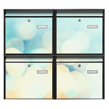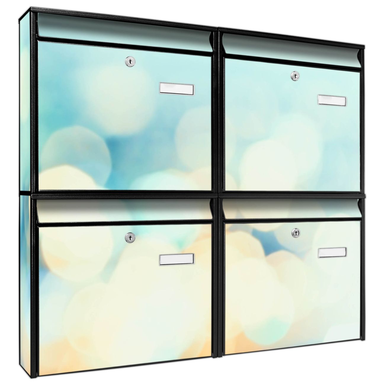 FUNKTION: Die Burg-Wächter Briefkastenanlage mit Motiv Funkelnde Lichter bietet Ihnen ausreichend Fassungsvermögen um auch A4 und C4 Sendungen zu empfangen. Das integrierte Namensschild lässt sich individuell beschriften. Wählen Sie aus den Grundfarben weiß, silber und schwarz. DESIGN: Die 4 Briefkästen haben ein ansprechendes und zeitloses Design, ohne dabei auf Funktionalität zu verzichten. Das Material ist sehr stabil, wetterfest und rostfrei. Durch das Motiv Funkelnde Lichter werden die Postkästen zu einem Blickfang. DETAILS: Die Postkästen bestehen aus verzinktem Stahl der zusätzlich mit Klarlack versiegelt wurde. Die Kästen sind gesamt 64,5cm hoch, 72,5cm breit und 10cm tief. Das Motiv besteht aus einer wetter- und UV-festen Folie, die Ihren Briefkasten zusätzlich vor Kratzern schützt. Die Postkästen werden mit Montagematerial, je einem Namensschild und je zwei Schlüsseln geliefert. NUTZEN: Das Briefkastenset eignet sich für die Wandmontage, die Größe bietet genügend Platz für Sendungen aller Art. Das zeitlose Design sowie die stabile Bauart bieten Ihnen einen treuen Begleiter für Ihre Post. BANJADO: