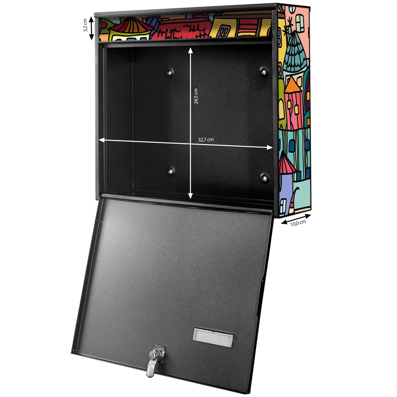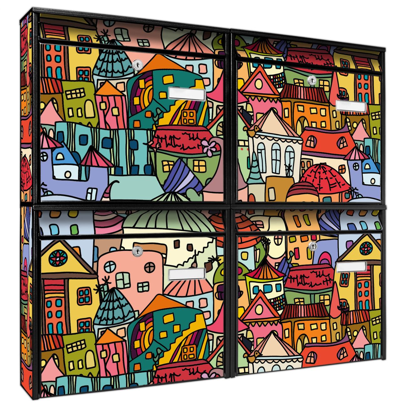 FUNKTION: Die Burg-Wächter Briefkastenanlage mit Motiv Funky Town bietet Ihnen ausreichend Fassungsvermögen um auch A4 und C4 Sendungen zu empfangen. Das integrierte Namensschild lässt sich individuell beschriften. Wählen Sie aus den Grundfarben weiß, silber und schwarz. DESIGN: Die 4 Briefkästen haben ein ansprechendes und zeitloses Design, ohne dabei auf Funktionalität zu verzichten. Das Material ist sehr stabil, wetterfest und rostfrei. Durch das Motiv Funky Town werden die Postkästen zu einem Blickfang. DETAILS: Die Postkästen bestehen aus verzinktem Stahl der zusätzlich mit Klarlack versiegelt wurde. Die Kästen sind gesamt 64,5cm hoch, 72,5cm breit und 10cm tief. Das Motiv besteht aus einer wetter- und UV-festen Folie, die Ihren Briefkasten zusätzlich vor Kratzern schützt. Die Postkästen werden mit Montagematerial, je einem Namensschild und je zwei Schlüsseln geliefert. NUTZEN: Das Briefkastenset eignet sich für die Wandmontage, die Größe bietet genügend Platz für Sendungen aller Art. Das zeitlose Design sowie die stabile Bauart bieten Ihnen einen treuen Begleiter für Ihre Post. BANJADO: