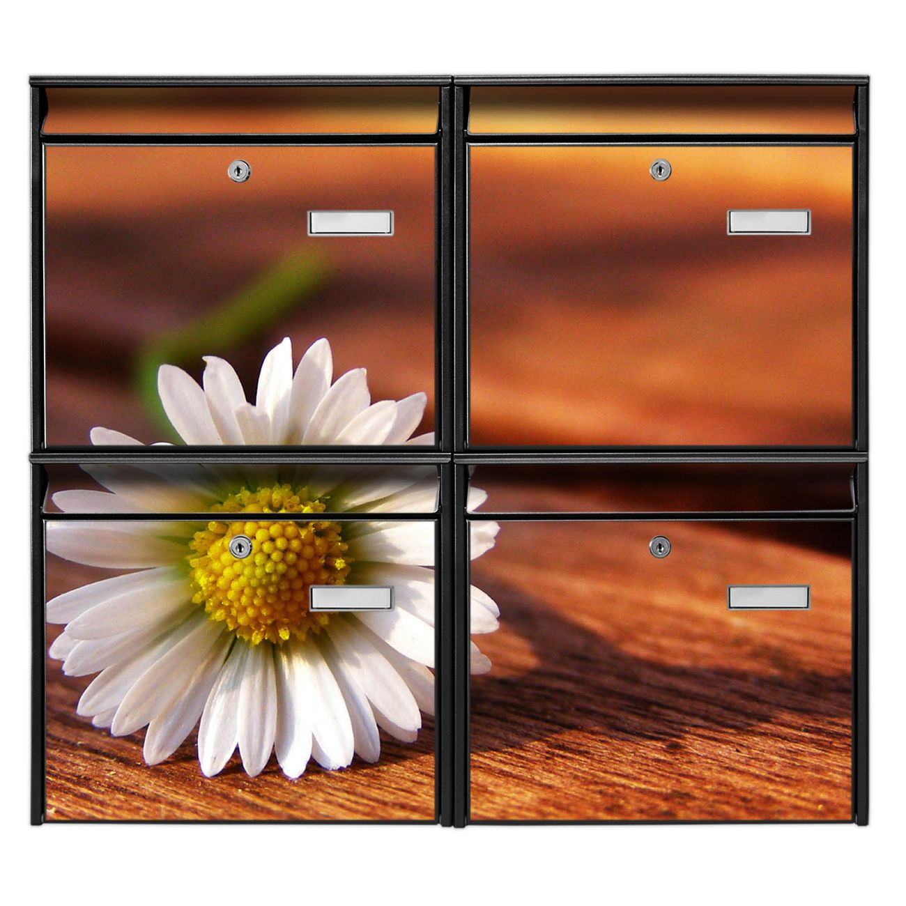 FUNKTION: Die Burg-Wächter Briefkastenanlage mit Motiv Gänseblümchen bietet Ihnen ausreichend Fassungsvermögen um auch A4 und C4 Sendungen zu empfangen. Das integrierte Namensschild lässt sich individuell beschriften. Wählen Sie aus den Grundfarben weiß, silber und schwarz. DESIGN: Die 4 Briefkästen haben ein ansprechendes und zeitloses Design, ohne dabei auf Funktionalität zu verzichten. Das Material ist sehr stabil, wetterfest und rostfrei. Durch das Motiv Gänseblümchen werden die Postkästen zu einem Blickfang. DETAILS: Die Postkästen bestehen aus verzinktem Stahl der zusätzlich mit Klarlack versiegelt wurde. Die Kästen sind gesamt 64,5cm hoch, 72,5cm breit und 10cm tief. Das Motiv besteht aus einer wetter- und UV-festen Folie, die Ihren Briefkasten zusätzlich vor Kratzern schützt. Die Postkästen werden mit Montagematerial, je einem Namensschild und je zwei Schlüsseln geliefert. NUTZEN: Das Briefkastenset eignet sich für die Wandmontage, die Größe bietet genügend Platz für Sendungen aller Art. Das zeitlose Design sowie die stabile Bauart bieten Ihnen einen treuen Begleiter für Ihre Post. BANJADO: