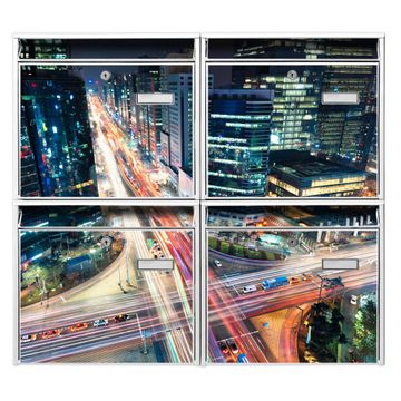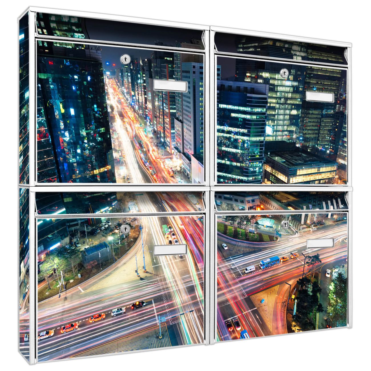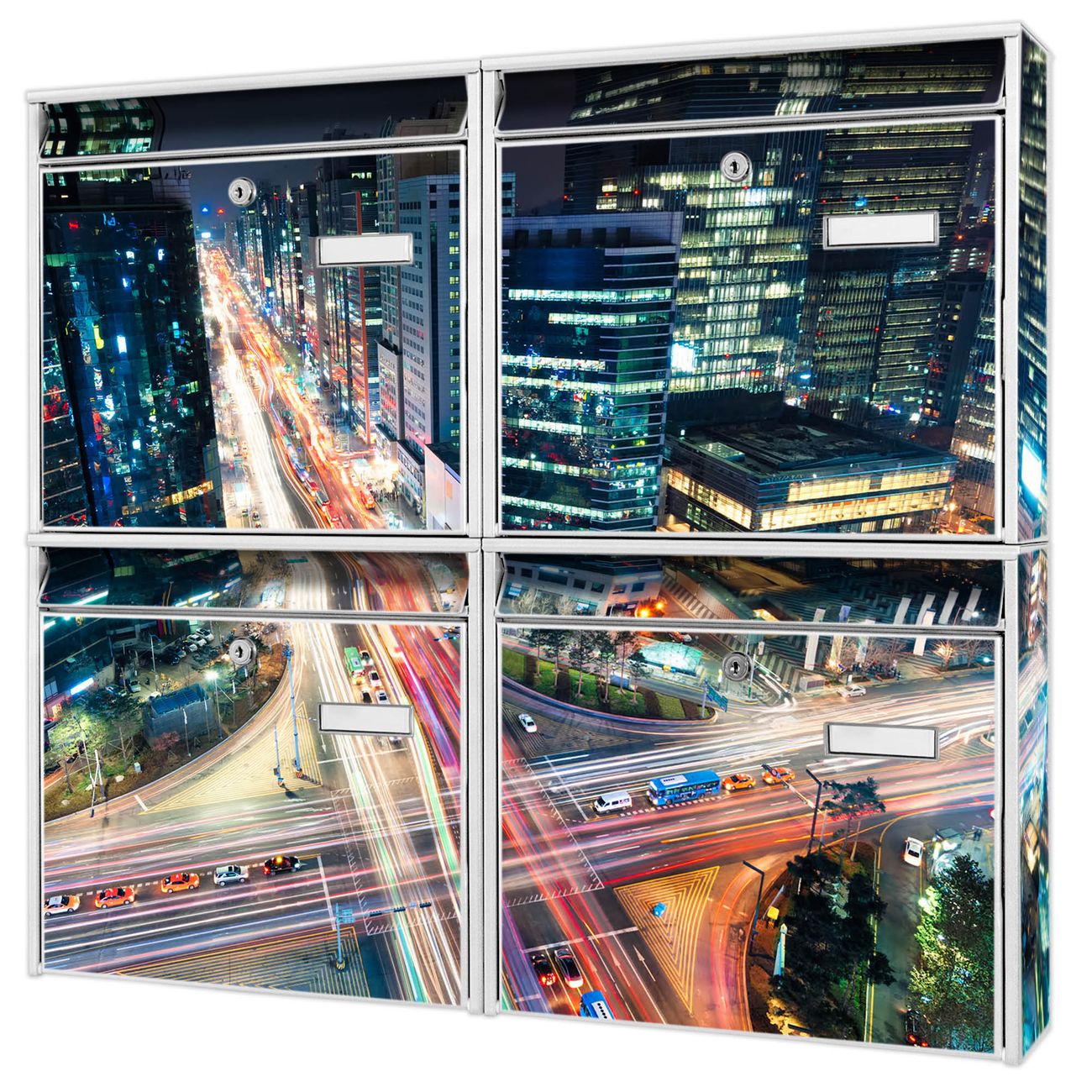 FUNKTION: Die Burg-Wächter Briefkastenanlage mit Motiv Gangnam Bei Nacht bietet Ihnen ausreichend Fassungsvermögen um auch A4 und C4 Sendungen zu empfangen. Das integrierte Namensschild lässt sich individuell beschriften. Wählen Sie aus den Grundfarben weiß, silber und schwarz. DESIGN: Die 4 Briefkästen haben ein ansprechendes und zeitloses Design, ohne dabei auf Funktionalität zu verzichten. Das Material ist sehr stabil, wetterfest und rostfrei. Durch das Motiv Gangnam Bei Nacht werden die Postkästen zu einem Blickfang. DETAILS: Die Postkästen bestehen aus verzinktem Stahl der zusätzlich mit Klarlack versiegelt wurde. Die Kästen sind gesamt 64,5cm hoch, 72,5cm breit und 10cm tief. Das Motiv besteht aus einer wetter- und UV-festen Folie, die Ihren Briefkasten zusätzlich vor Kratzern schützt. Die Postkästen werden mit Montagematerial, je einem Namensschild und je zwei Schlüsseln geliefert. NUTZEN: Das Briefkastenset eignet sich für die Wandmontage, die Größe bietet genügend Platz für Sendungen aller Art. Das zeitlose Design sowie die stabile Bauart bieten Ihnen einen treuen Begleiter für Ihre Post. BANJADO:
