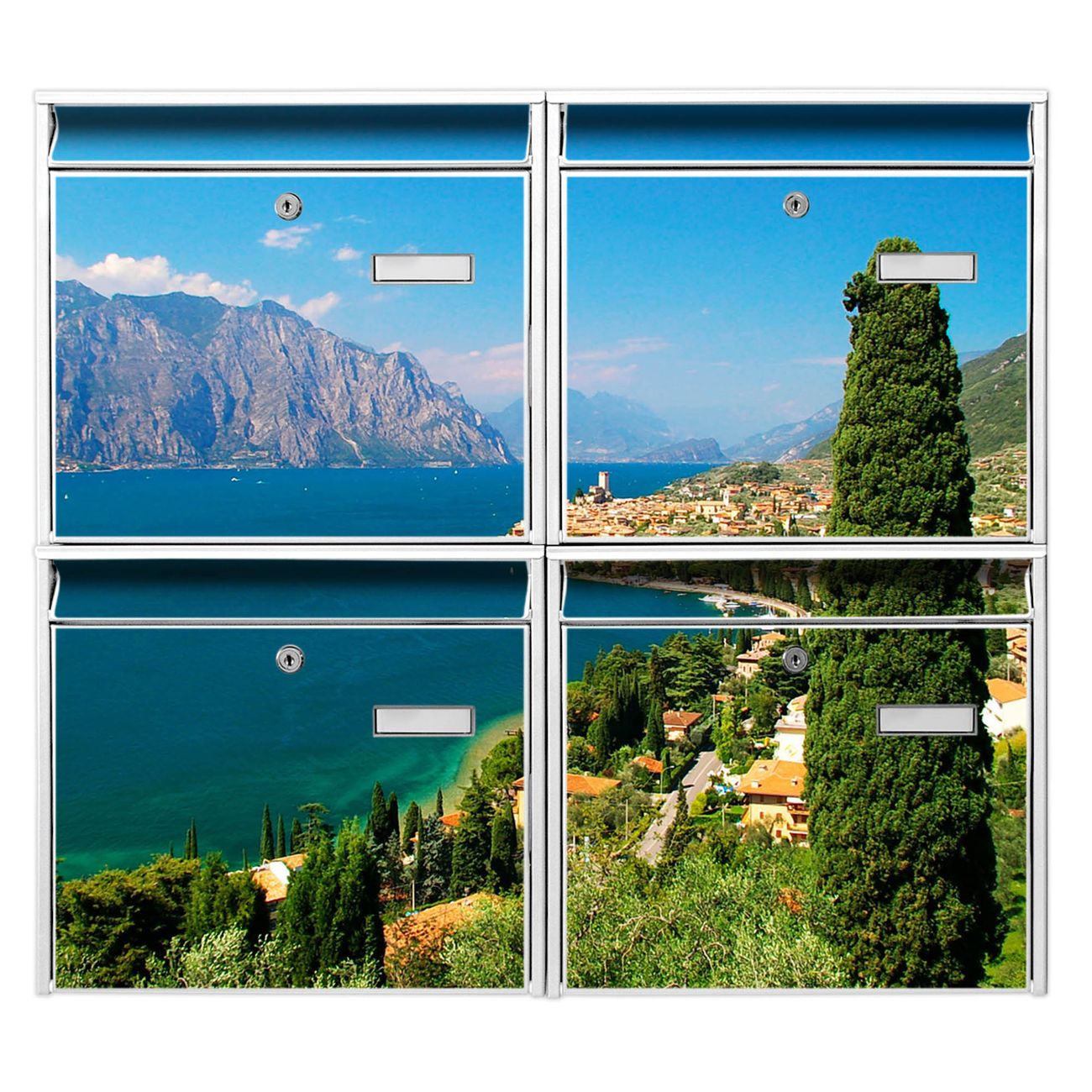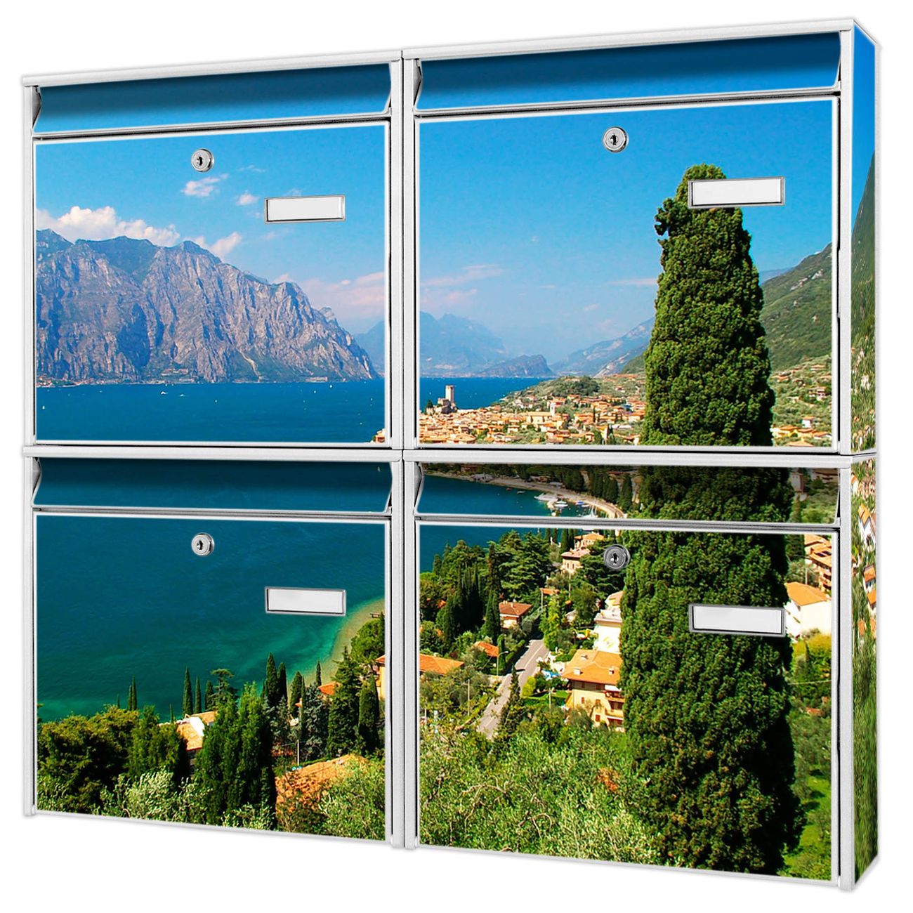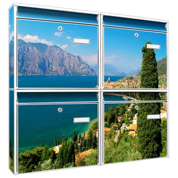 FUNKTION: Die Burg-Wächter Briefkastenanlage mit Motiv Gardasee bietet Ihnen ausreichend Fassungsvermögen um auch A4 und C4 Sendungen zu empfangen. Das integrierte Namensschild lässt sich individuell beschriften. Wählen Sie aus den Grundfarben weiß, silber und schwarz. DESIGN: Die 4 Briefkästen haben ein ansprechendes und zeitloses Design, ohne dabei auf Funktionalität zu verzichten. Das Material ist sehr stabil, wetterfest und rostfrei. Durch das Motiv Gardasee werden die Postkästen zu einem Blickfang. DETAILS: Die Postkästen bestehen aus verzinktem Stahl der zusätzlich mit Klarlack versiegelt wurde. Die Kästen sind gesamt 64,5cm hoch, 72,5cm breit und 10cm tief. Das Motiv besteht aus einer wetter- und UV-festen Folie, die Ihren Briefkasten zusätzlich vor Kratzern schützt. Die Postkästen werden mit Montagematerial, je einem Namensschild und je zwei Schlüsseln geliefert. NUTZEN: Das Briefkastenset eignet sich für die Wandmontage, die Größe bietet genügend Platz für Sendungen aller Art. Das zeitlose Design sowie die stabile Bauart bieten Ihnen einen treuen Begleiter für Ihre Post. BANJADO: