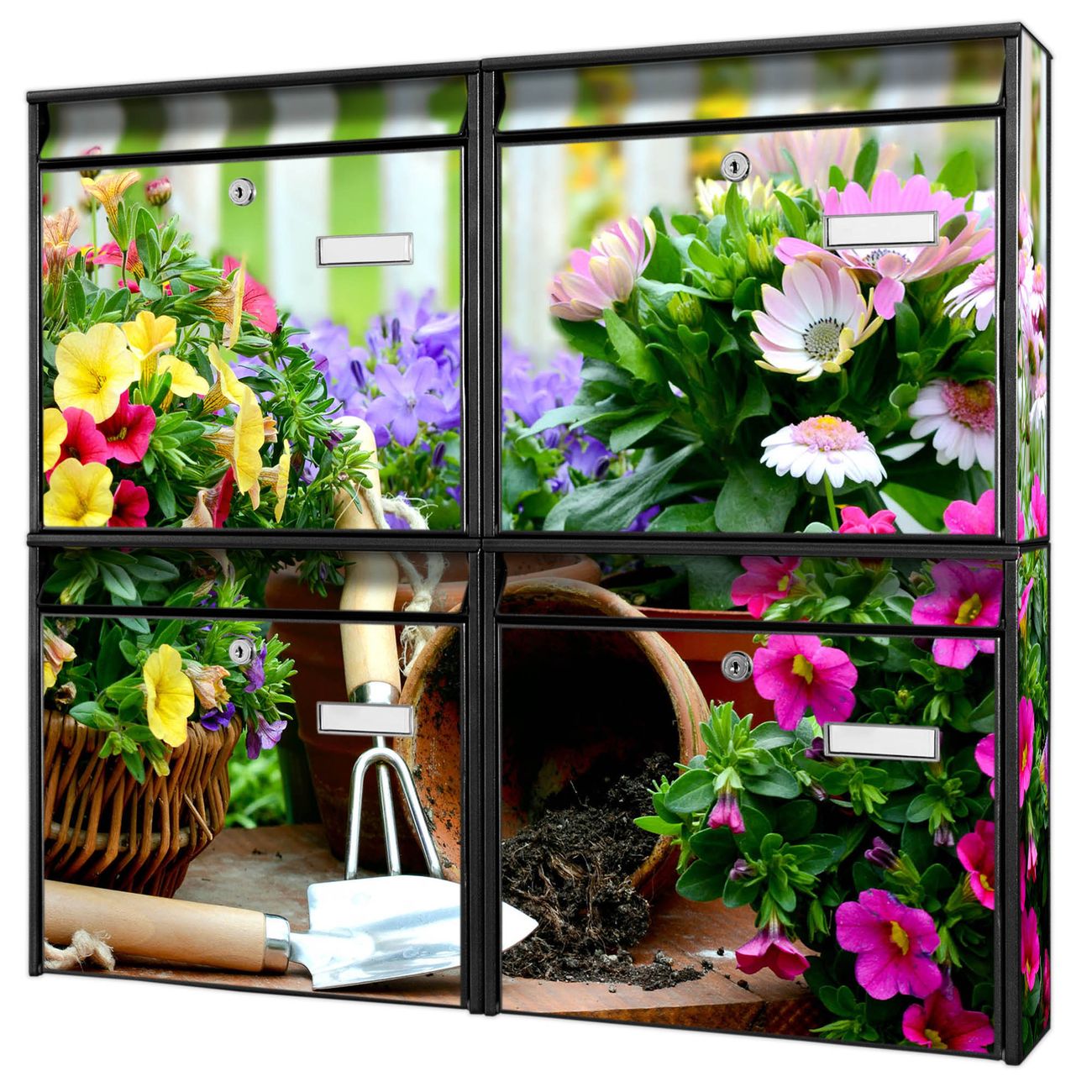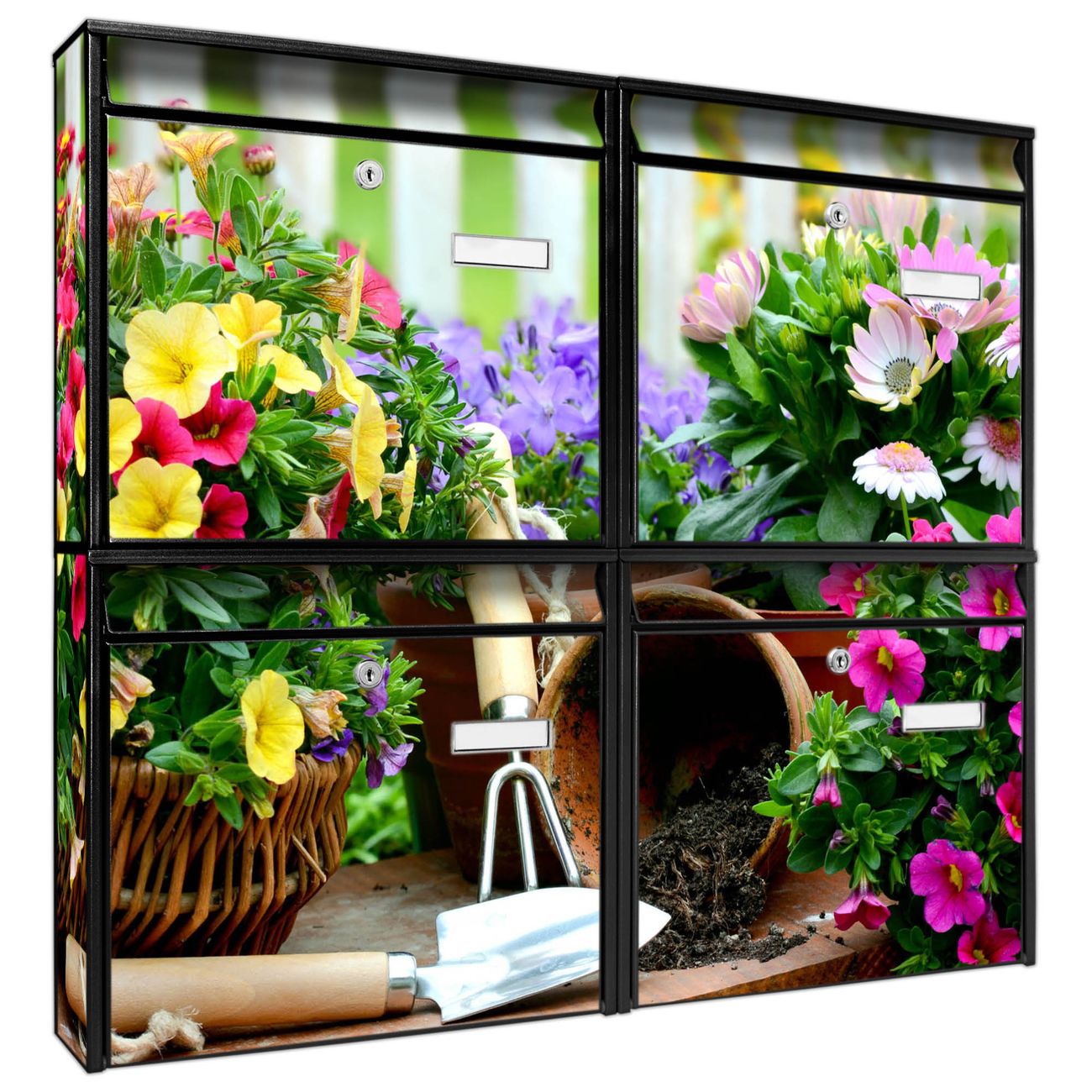 FUNKTION: Die Burg-Wächter Briefkastenanlage mit Motiv Gartenfreude bietet Ihnen ausreichend Fassungsvermögen um auch A4 und C4 Sendungen zu empfangen. Das integrierte Namensschild lässt sich individuell beschriften. Wählen Sie aus den Grundfarben weiß, silber und schwarz. DESIGN: Die 4 Briefkästen haben ein ansprechendes und zeitloses Design, ohne dabei auf Funktionalität zu verzichten. Das Material ist sehr stabil, wetterfest und rostfrei. Durch das Motiv Gartenfreude werden die Postkästen zu einem Blickfang. DETAILS: Die Postkästen bestehen aus verzinktem Stahl der zusätzlich mit Klarlack versiegelt wurde. Die Kästen sind gesamt 64,5cm hoch, 72,5cm breit und 10cm tief. Das Motiv besteht aus einer wetter- und UV-festen Folie, die Ihren Briefkasten zusätzlich vor Kratzern schützt. Die Postkästen werden mit Montagematerial, je einem Namensschild und je zwei Schlüsseln geliefert. NUTZEN: Das Briefkastenset eignet sich für die Wandmontage, die Größe bietet genügend Platz für Sendungen aller Art. Das zeitlose Design sowie die stabile Bauart bieten Ihnen einen treuen Begleiter für Ihre Post. BANJADO: