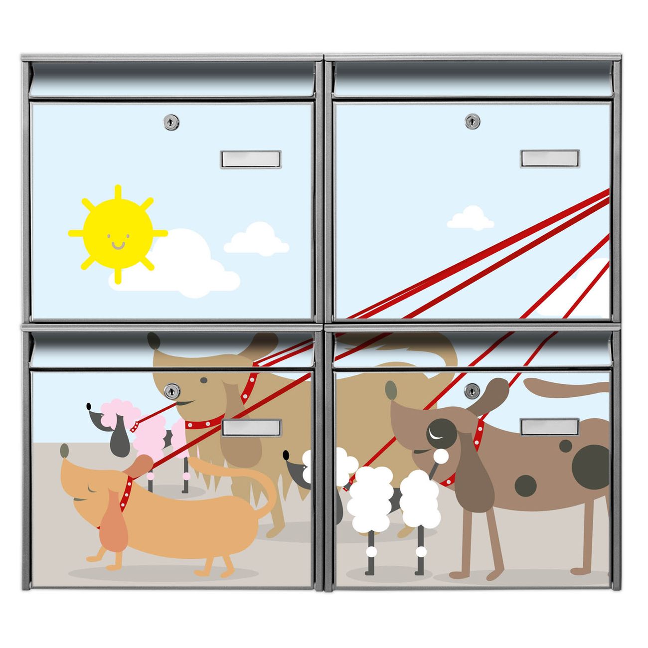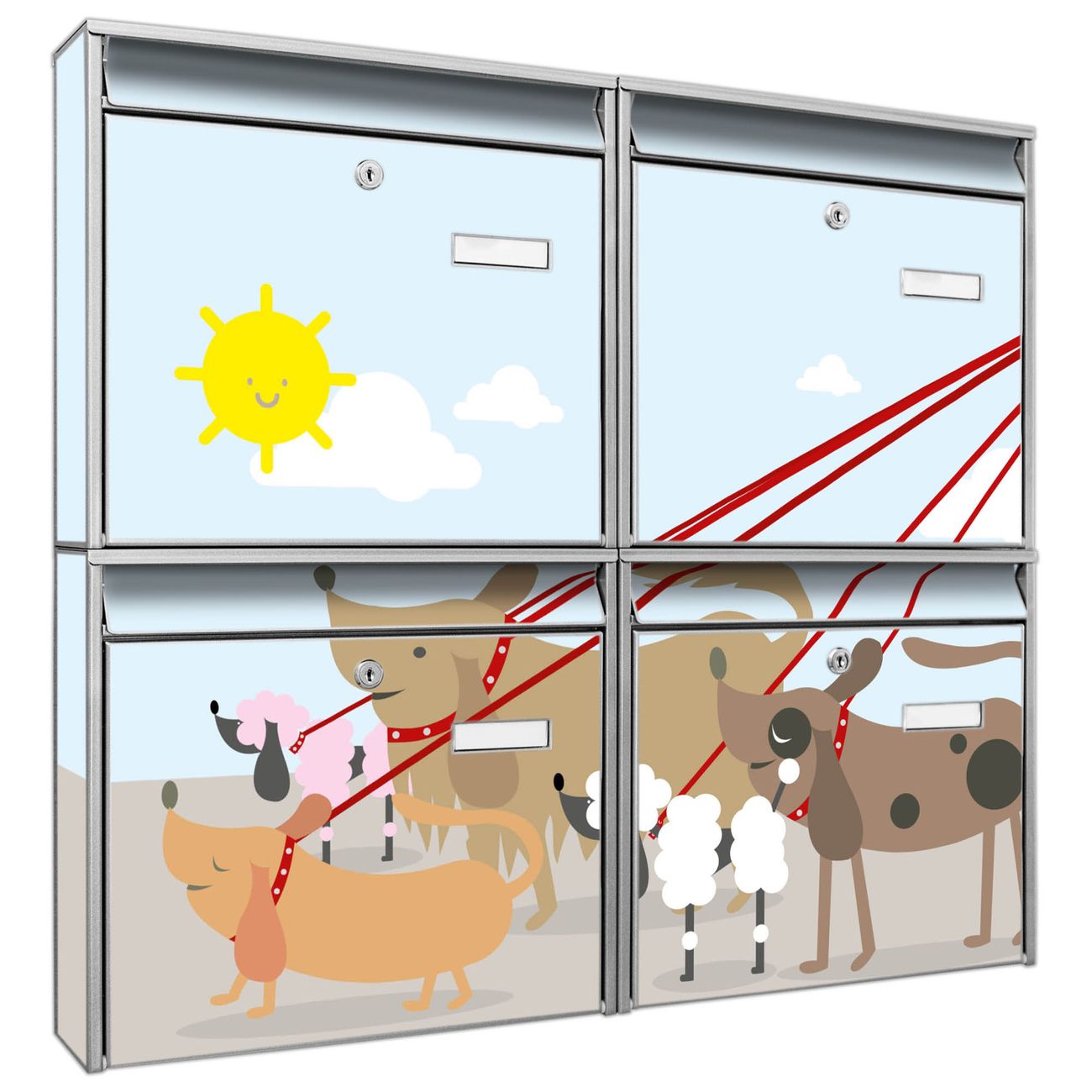 FUNKTION: Die Burg-Wächter Briefkastenanlage mit Motiv Gassi Gehen bietet Ihnen ausreichend Fassungsvermögen um auch A4 und C4 Sendungen zu empfangen. Das integrierte Namensschild lässt sich individuell beschriften. Wählen Sie aus den Grundfarben weiß, silber und schwarz. DESIGN: Die 4 Briefkästen haben ein ansprechendes und zeitloses Design, ohne dabei auf Funktionalität zu verzichten. Das Material ist sehr stabil, wetterfest und rostfrei. Durch das Motiv Gassi Gehen werden die Postkästen zu einem Blickfang. DETAILS: Die Postkästen bestehen aus verzinktem Stahl der zusätzlich mit Klarlack versiegelt wurde. Die Kästen sind gesamt 64,5cm hoch, 72,5cm breit und 10cm tief. Das Motiv besteht aus einer wetter- und UV-festen Folie, die Ihren Briefkasten zusätzlich vor Kratzern schützt. Die Postkästen werden mit Montagematerial, je einem Namensschild und je zwei Schlüsseln geliefert. NUTZEN: Das Briefkastenset eignet sich für die Wandmontage, die Größe bietet genügend Platz für Sendungen aller Art. Das zeitlose Design sowie die stabile Bauart bieten Ihnen einen treuen Begleiter für Ihre Post. BANJADO: