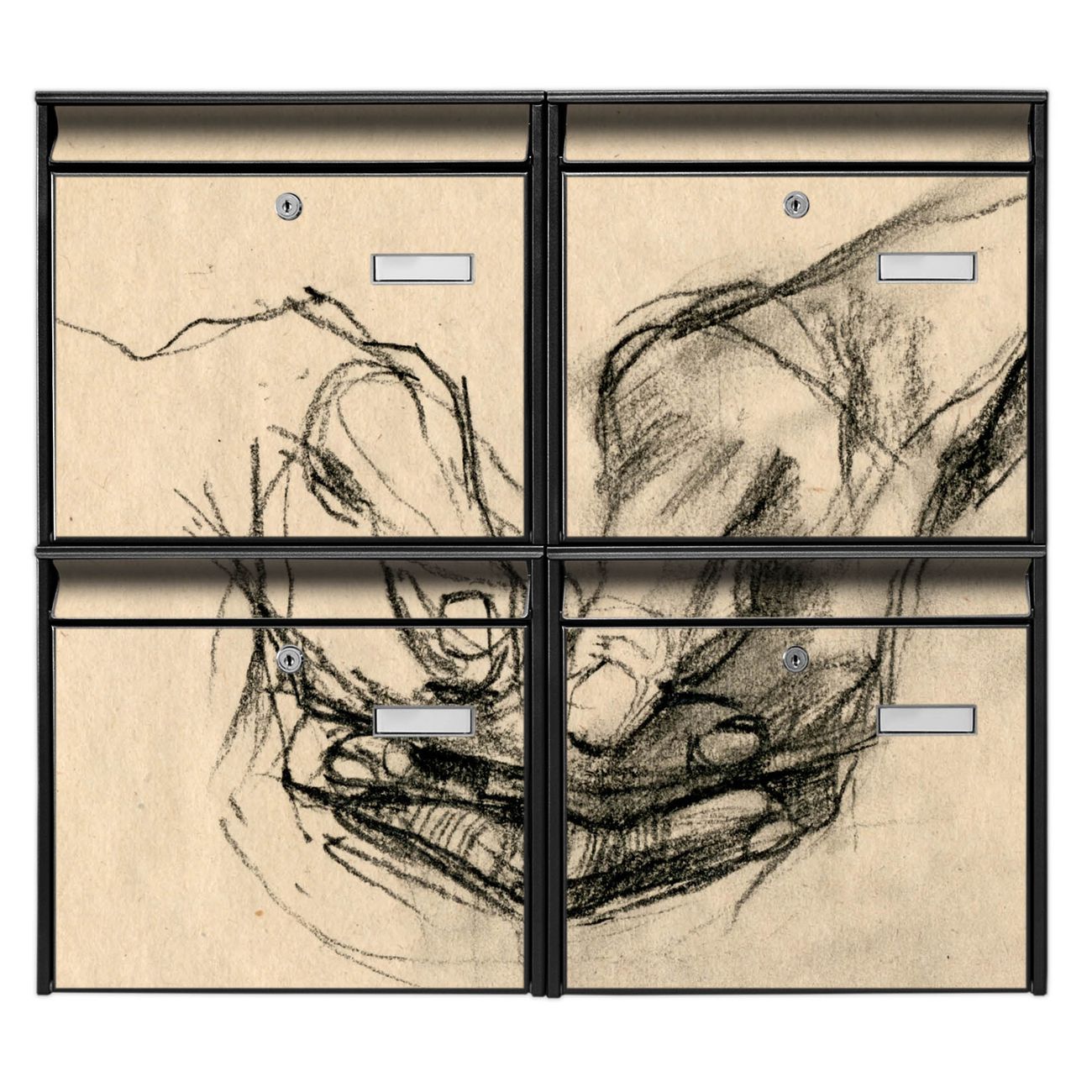 FUNKTION: Die Burg-Wächter Briefkastenanlage mit Motiv Gefaltete Hände bietet Ihnen ausreichend Fassungsvermögen um auch A4 und C4 Sendungen zu empfangen. Das integrierte Namensschild lässt sich individuell beschriften. Wählen Sie aus den Grundfarben weiß, silber und schwarz. DESIGN: Die 4 Briefkästen haben ein ansprechendes und zeitloses Design, ohne dabei auf Funktionalität zu verzichten. Das Material ist sehr stabil, wetterfest und rostfrei. Durch das Motiv Gefaltete Hände werden die Postkästen zu einem Blickfang. DETAILS: Die Postkästen bestehen aus verzinktem Stahl der zusätzlich mit Klarlack versiegelt wurde. Die Kästen sind gesamt 64,5cm hoch, 72,5cm breit und 10cm tief. Das Motiv besteht aus einer wetter- und UV-festen Folie, die Ihren Briefkasten zusätzlich vor Kratzern schützt. Die Postkästen werden mit Montagematerial, je einem Namensschild und je zwei Schlüsseln geliefert. NUTZEN: Das Briefkastenset eignet sich für die Wandmontage, die Größe bietet genügend Platz für Sendungen aller Art. Das zeitlose Design sowie die stabile Bauart bieten Ihnen einen treuen Begleiter für Ihre Post. BANJADO: