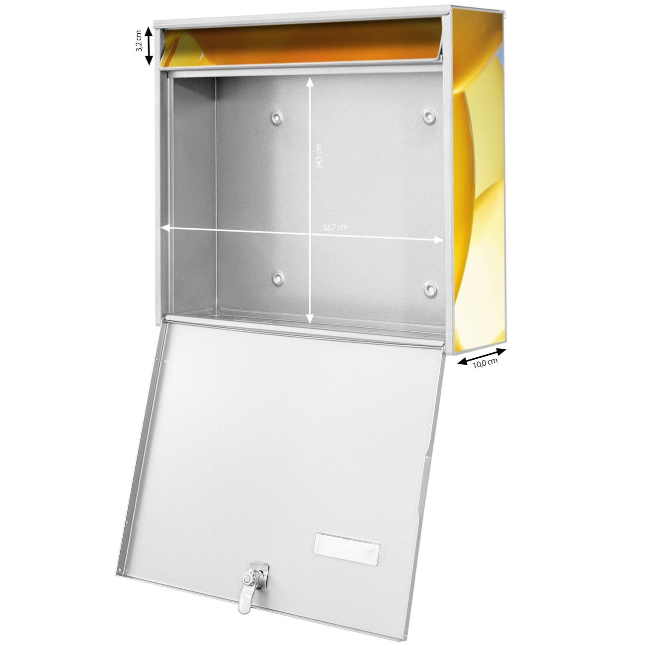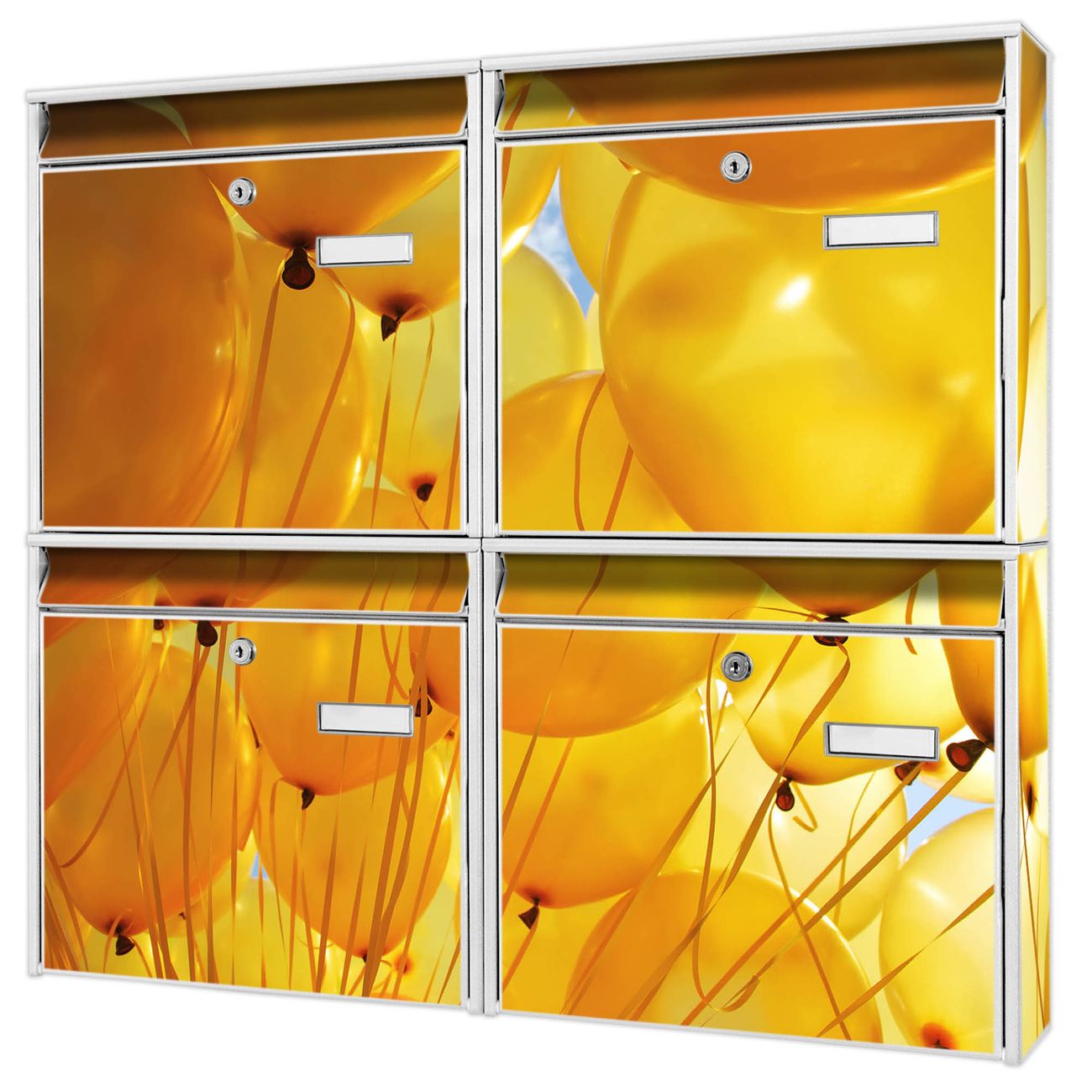FUNKTION: Die Burg-Wächter Briefkastenanlage mit Motiv Gelbe Luftballons bietet Ihnen ausreichend Fassungsvermögen um auch A4 und C4 Sendungen zu empfangen. Das integrierte Namensschild lässt sich individuell beschriften. Wählen Sie aus den Grundfarben weiß, silber und schwarz. DESIGN: Die 4 Briefkästen haben ein ansprechendes und zeitloses Design, ohne dabei auf Funktionalität zu verzichten. Das Material ist sehr stabil, wetterfest und rostfrei. Durch das Motiv Gelbe Luftballons werden die Postkästen zu einem Blickfang. DETAILS: Die Postkästen bestehen aus verzinktem Stahl der zusätzlich mit Klarlack versiegelt wurde. Die Kästen sind gesamt 64,5cm hoch, 72,5cm breit und 10cm tief. Das Motiv besteht aus einer wetter- und UV-festen Folie, die Ihren Briefkasten zusätzlich vor Kratzern schützt. Die Postkästen werden mit Montagematerial, je einem Namensschild und je zwei Schlüsseln geliefert. NUTZEN: Das Briefkastenset eignet sich für die Wandmontage, die Größe bietet genügend Platz für Sendungen aller Art. Das zeitlose Design sowie die stabile Bauart bieten Ihnen einen treuen Begleiter für Ihre Post. BANJADO: