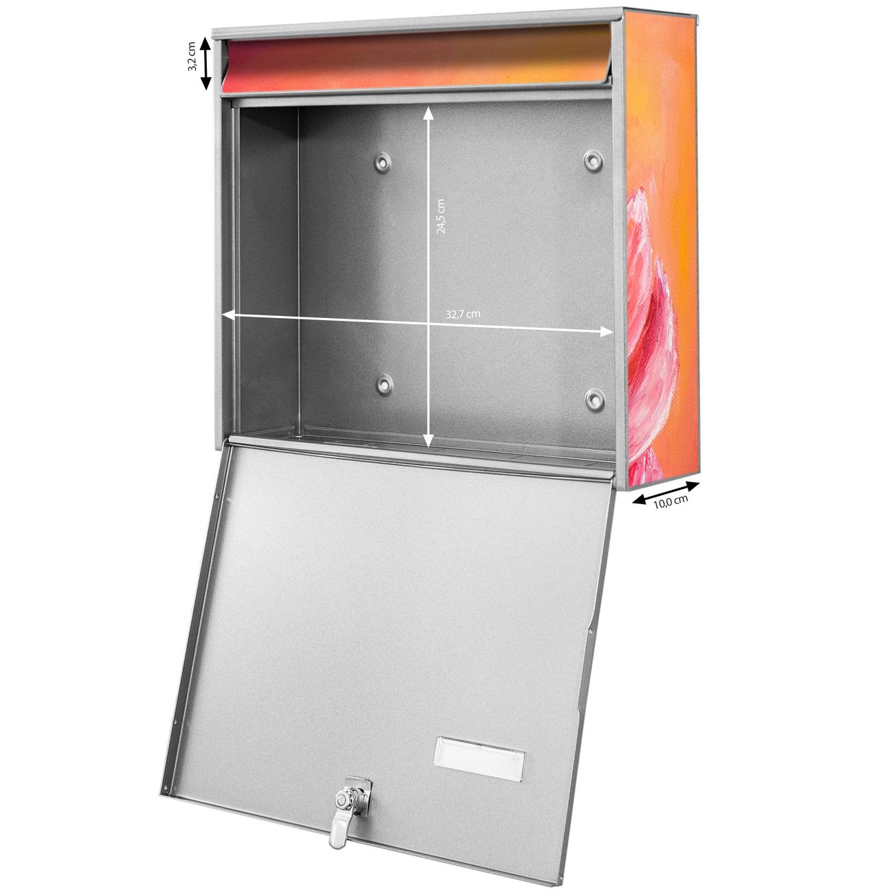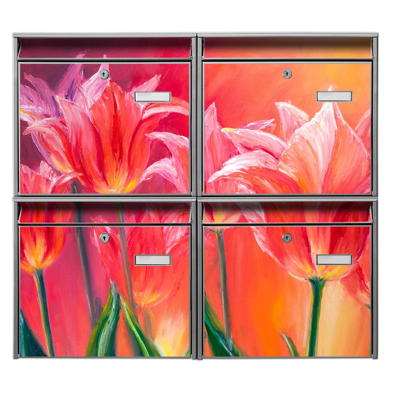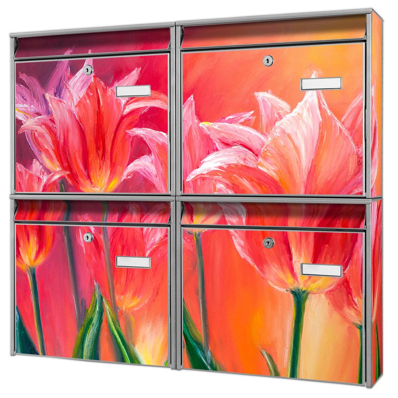 FUNKTION: Die Burg-Wächter Briefkastenanlage mit Motiv Gemalte Tulpen bietet Ihnen ausreichend Fassungsvermögen um auch A4 und C4 Sendungen zu empfangen. Das integrierte Namensschild lässt sich individuell beschriften. Wählen Sie aus den Grundfarben weiß, silber und schwarz. DESIGN: Die 4 Briefkästen haben ein ansprechendes und zeitloses Design, ohne dabei auf Funktionalität zu verzichten. Das Material ist sehr stabil, wetterfest und rostfrei. Durch das Motiv Gemalte Tulpen werden die Postkästen zu einem Blickfang. DETAILS: Die Postkästen bestehen aus verzinktem Stahl der zusätzlich mit Klarlack versiegelt wurde. Die Kästen sind gesamt 64,5cm hoch, 72,5cm breit und 10cm tief. Das Motiv besteht aus einer wetter- und UV-festen Folie, die Ihren Briefkasten zusätzlich vor Kratzern schützt. Die Postkästen werden mit Montagematerial, je einem Namensschild und je zwei Schlüsseln geliefert. NUTZEN: Das Briefkastenset eignet sich für die Wandmontage, die Größe bietet genügend Platz für Sendungen aller Art. Das zeitlose Design sowie die stabile Bauart bieten Ihnen einen treuen Begleiter für Ihre Post. BANJADO:
