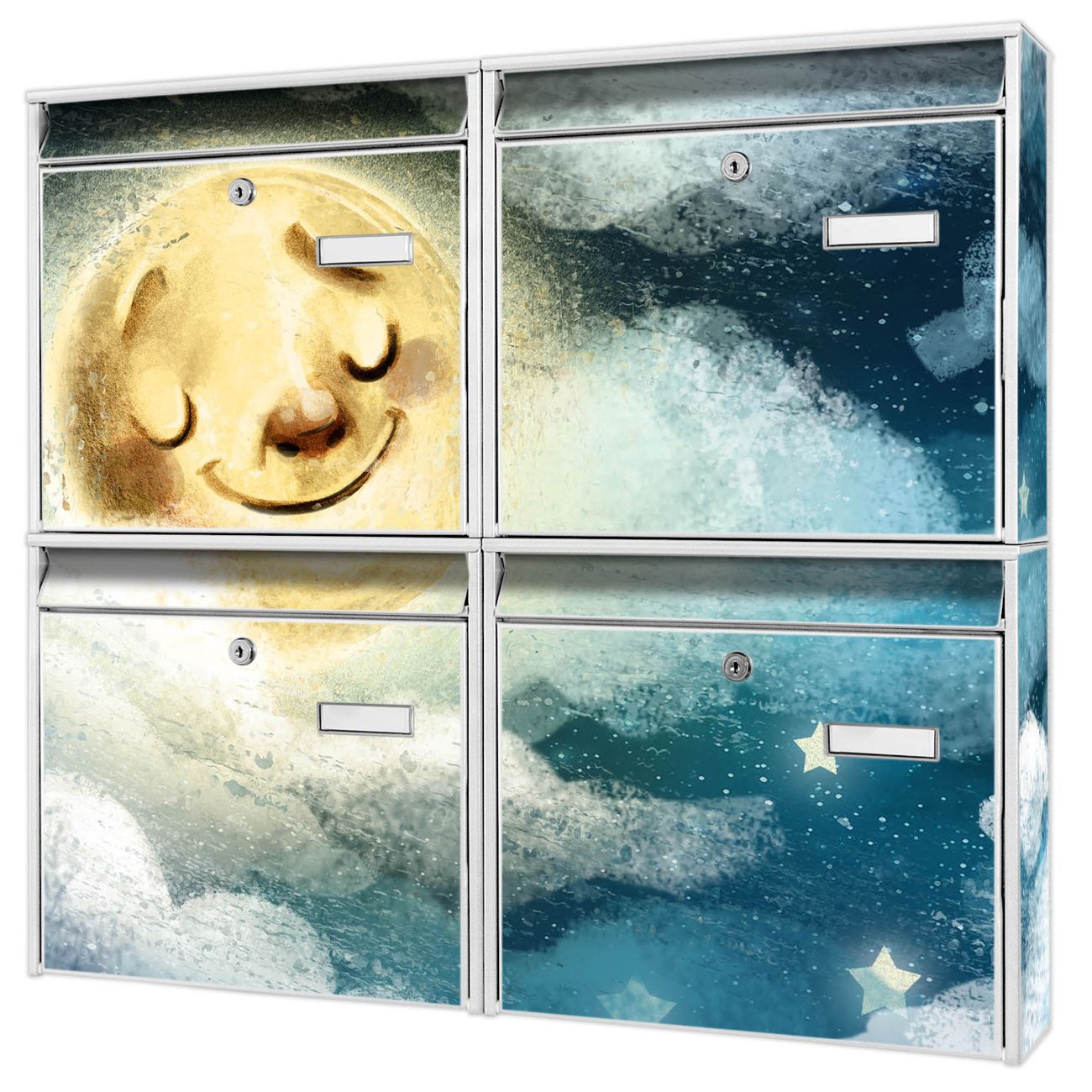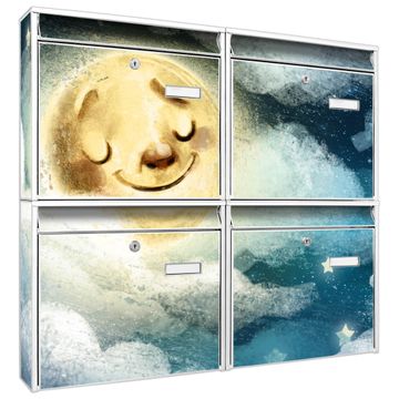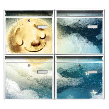 FUNKTION: Die Burg-Wächter Briefkastenanlage mit Motiv Glücksmond bietet Ihnen ausreichend Fassungsvermögen um auch A4 und C4 Sendungen zu empfangen. Das integrierte Namensschild lässt sich individuell beschriften. Wählen Sie aus den Grundfarben weiß, silber und schwarz. DESIGN: Die 4 Briefkästen haben ein ansprechendes und zeitloses Design, ohne dabei auf Funktionalität zu verzichten. Das Material ist sehr stabil, wetterfest und rostfrei. Durch das Motiv Glücksmond werden die Postkästen zu einem Blickfang. DETAILS: Die Postkästen bestehen aus verzinktem Stahl der zusätzlich mit Klarlack versiegelt wurde. Die Kästen sind gesamt 64,5cm hoch, 72,5cm breit und 10cm tief. Das Motiv besteht aus einer wetter- und UV-festen Folie, die Ihren Briefkasten zusätzlich vor Kratzern schützt. Die Postkästen werden mit Montagematerial, je einem Namensschild und je zwei Schlüsseln geliefert. NUTZEN: Das Briefkastenset eignet sich für die Wandmontage, die Größe bietet genügend Platz für Sendungen aller Art. Das zeitlose Design sowie die stabile Bauart bieten Ihnen einen treuen Begleiter für Ihre Post. BANJADO: