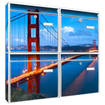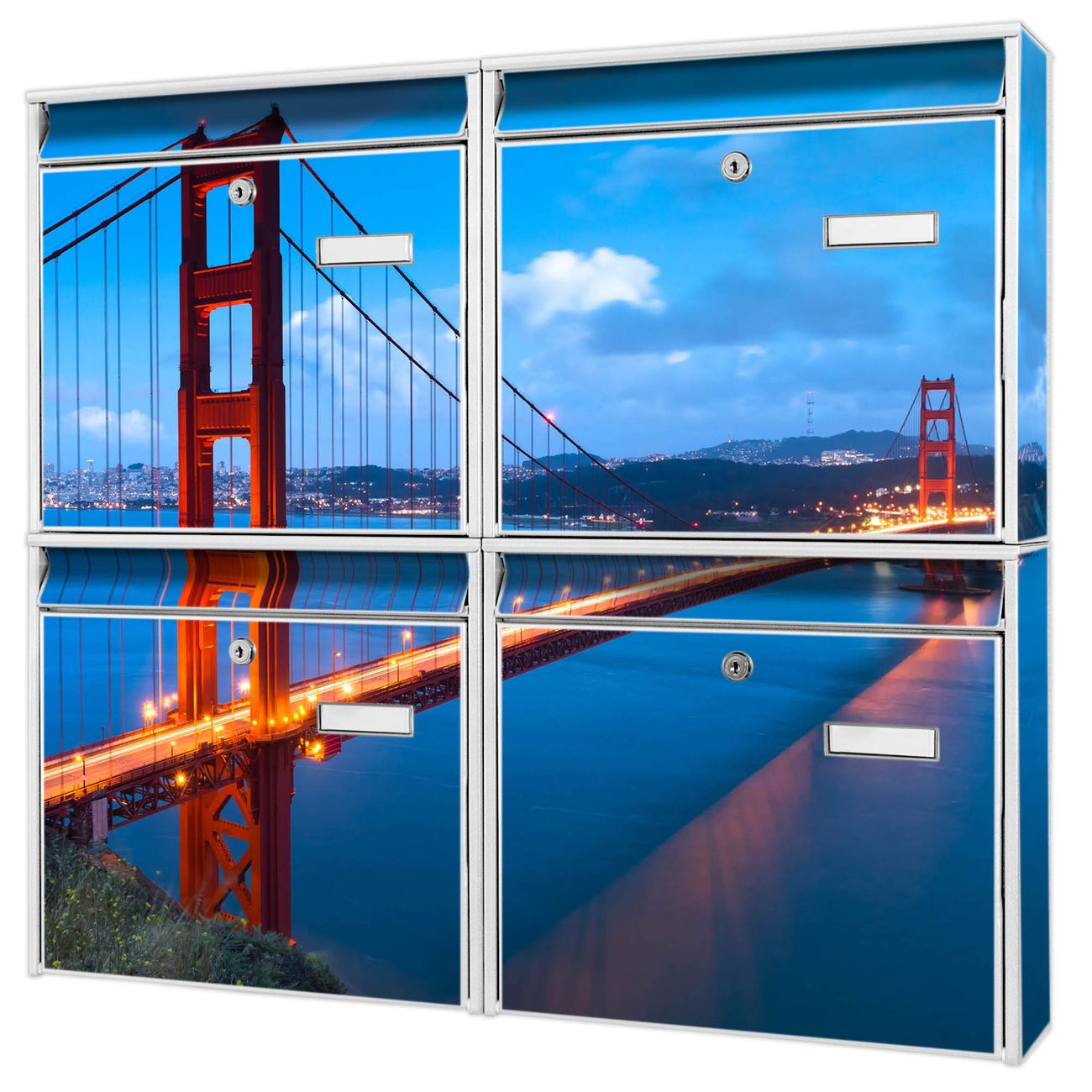 FUNKTION: Die Burg-Wächter Briefkastenanlage mit Motiv Golden Gate Bridge bietet Ihnen ausreichend Fassungsvermögen um auch A4 und C4 Sendungen zu empfangen. Das integrierte Namensschild lässt sich individuell beschriften. Wählen Sie aus den Grundfarben weiß, silber und schwarz. DESIGN: Die 4 Briefkästen haben ein ansprechendes und zeitloses Design, ohne dabei auf Funktionalität zu verzichten. Das Material ist sehr stabil, wetterfest und rostfrei. Durch das Motiv Golden Gate Bridge werden die Postkästen zu einem Blickfang. DETAILS: Die Postkästen bestehen aus verzinktem Stahl der zusätzlich mit Klarlack versiegelt wurde. Die Kästen sind gesamt 64,5cm hoch, 72,5cm breit und 10cm tief. Das Motiv besteht aus einer wetter- und UV-festen Folie, die Ihren Briefkasten zusätzlich vor Kratzern schützt. Die Postkästen werden mit Montagematerial, je einem Namensschild und je zwei Schlüsseln geliefert. NUTZEN: Das Briefkastenset eignet sich für die Wandmontage, die Größe bietet genügend Platz für Sendungen aller Art. Das zeitlose Design sowie die stabile Bauart bieten Ihnen einen treuen Begleiter für Ihre Post. BANJADO: