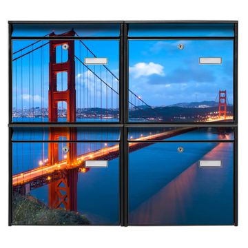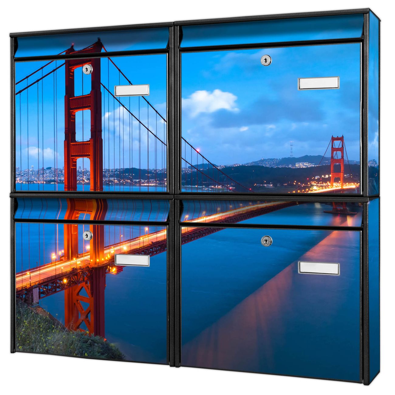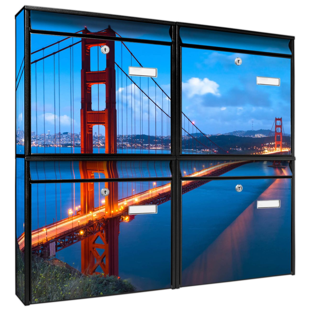 FUNKTION: Die Burg-Wächter Briefkastenanlage mit Motiv Golden Gate Bridge bietet Ihnen ausreichend Fassungsvermögen um auch A4 und C4 Sendungen zu empfangen. Das integrierte Namensschild lässt sich individuell beschriften. Wählen Sie aus den Grundfarben weiß, silber und schwarz. DESIGN: Die 4 Briefkästen haben ein ansprechendes und zeitloses Design, ohne dabei auf Funktionalität zu verzichten. Das Material ist sehr stabil, wetterfest und rostfrei. Durch das Motiv Golden Gate Bridge werden die Postkästen zu einem Blickfang. DETAILS: Die Postkästen bestehen aus verzinktem Stahl der zusätzlich mit Klarlack versiegelt wurde. Die Kästen sind gesamt 64,5cm hoch, 72,5cm breit und 10cm tief. Das Motiv besteht aus einer wetter- und UV-festen Folie, die Ihren Briefkasten zusätzlich vor Kratzern schützt. Die Postkästen werden mit Montagematerial, je einem Namensschild und je zwei Schlüsseln geliefert. NUTZEN: Das Briefkastenset eignet sich für die Wandmontage, die Größe bietet genügend Platz für Sendungen aller Art. Das zeitlose Design sowie die stabile Bauart bieten Ihnen einen treuen Begleiter für Ihre Post. BANJADO: