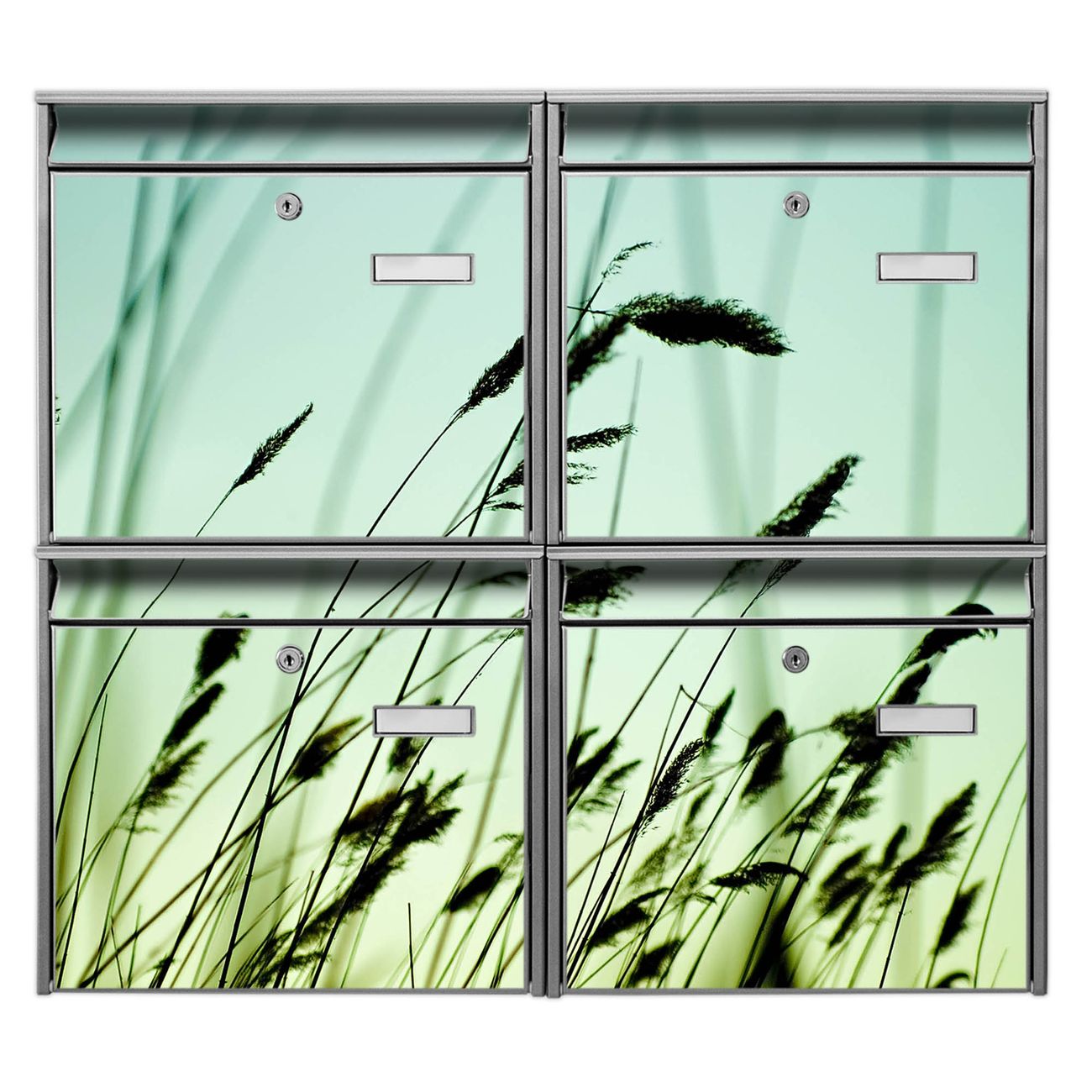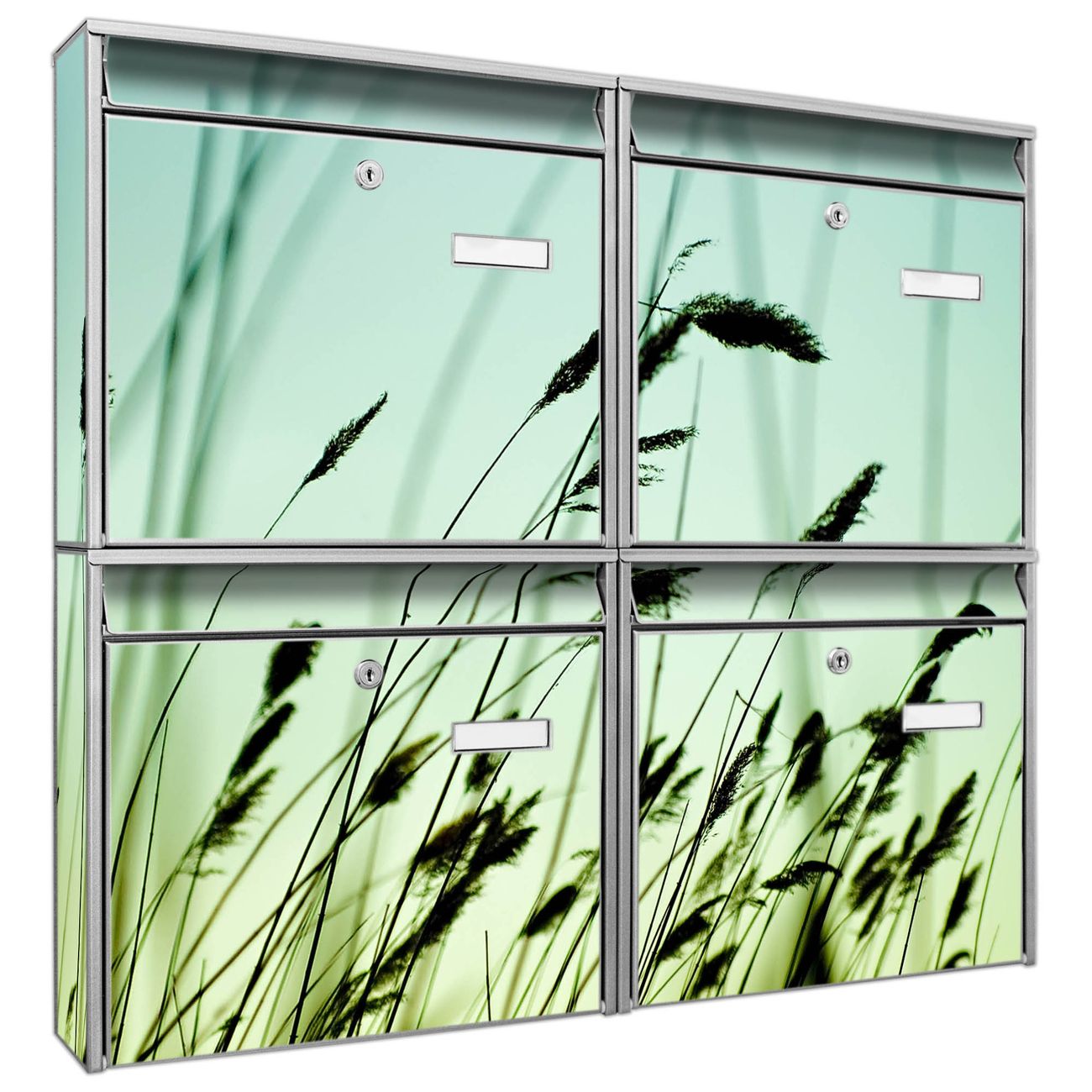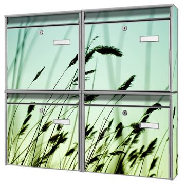 FUNKTION: Die Burg-Wächter Briefkastenanlage mit Motiv Gräser bietet Ihnen ausreichend Fassungsvermögen um auch A4 und C4 Sendungen zu empfangen. Das integrierte Namensschild lässt sich individuell beschriften. Wählen Sie aus den Grundfarben weiß, silber und schwarz. DESIGN: Die 4 Briefkästen haben ein ansprechendes und zeitloses Design, ohne dabei auf Funktionalität zu verzichten. Das Material ist sehr stabil, wetterfest und rostfrei. Durch das Motiv Gräser werden die Postkästen zu einem Blickfang. DETAILS: Die Postkästen bestehen aus verzinktem Stahl der zusätzlich mit Klarlack versiegelt wurde. Die Kästen sind gesamt 64,5cm hoch, 72,5cm breit und 10cm tief. Das Motiv besteht aus einer wetter- und UV-festen Folie, die Ihren Briefkasten zusätzlich vor Kratzern schützt. Die Postkästen werden mit Montagematerial, je einem Namensschild und je zwei Schlüsseln geliefert. NUTZEN: Das Briefkastenset eignet sich für die Wandmontage, die Größe bietet genügend Platz für Sendungen aller Art. Das zeitlose Design sowie die stabile Bauart bieten Ihnen einen treuen Begleiter für Ihre Post. BANJADO: