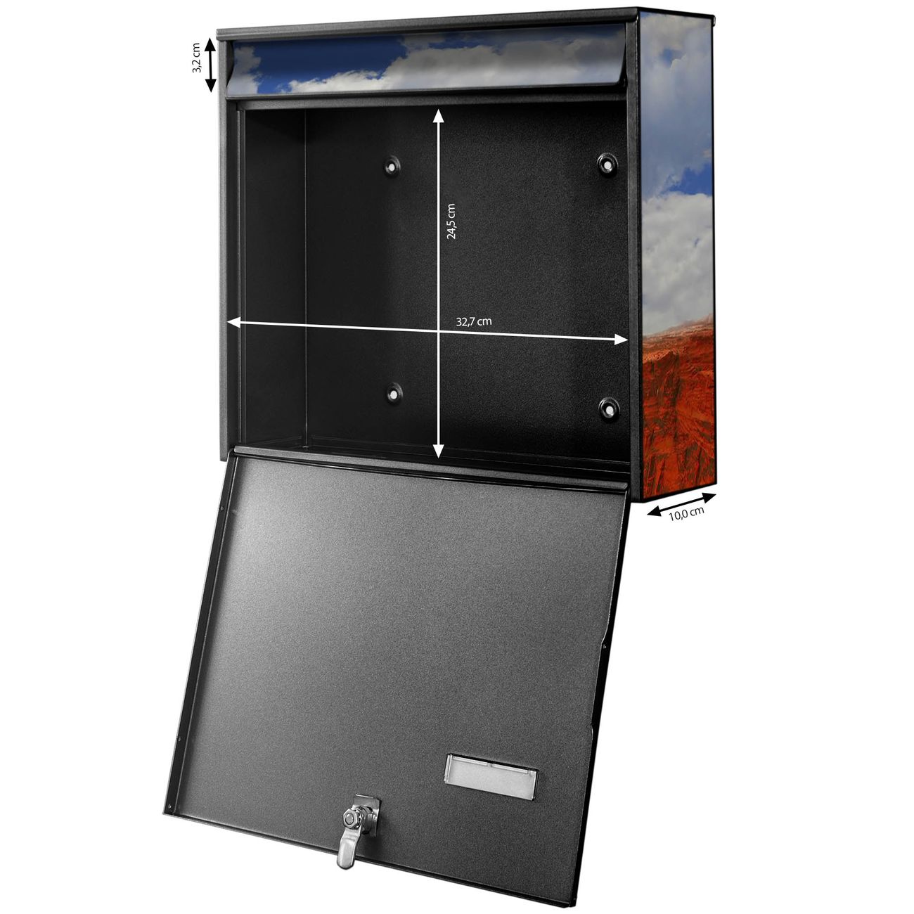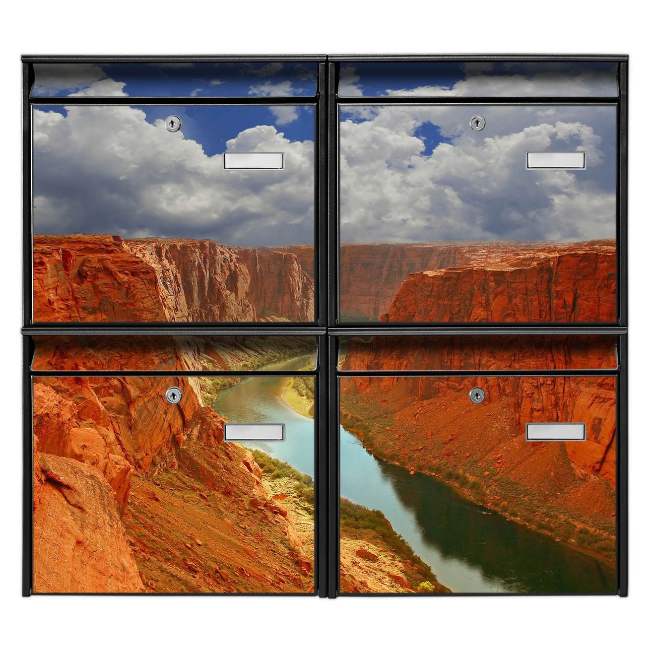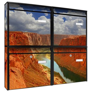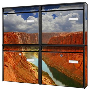 FUNKTION: Die Burg-Wächter Briefkastenanlage mit Motiv Grand Canyon bietet Ihnen ausreichend Fassungsvermögen um auch A4 und C4 Sendungen zu empfangen. Das integrierte Namensschild lässt sich individuell beschriften. Wählen Sie aus den Grundfarben weiß, silber und schwarz. DESIGN: Die 4 Briefkästen haben ein ansprechendes und zeitloses Design, ohne dabei auf Funktionalität zu verzichten. Das Material ist sehr stabil, wetterfest und rostfrei. Durch das Motiv Grand Canyon werden die Postkästen zu einem Blickfang. DETAILS: Die Postkästen bestehen aus verzinktem Stahl der zusätzlich mit Klarlack versiegelt wurde. Die Kästen sind gesamt 64,5cm hoch, 72,5cm breit und 10cm tief. Das Motiv besteht aus einer wetter- und UV-festen Folie, die Ihren Briefkasten zusätzlich vor Kratzern schützt. Die Postkästen werden mit Montagematerial, je einem Namensschild und je zwei Schlüsseln geliefert. NUTZEN: Das Briefkastenset eignet sich für die Wandmontage, die Größe bietet genügend Platz für Sendungen aller Art. Das zeitlose Design sowie die stabile Bauart bieten Ihnen einen treuen Begleiter für Ihre Post. BANJADO: