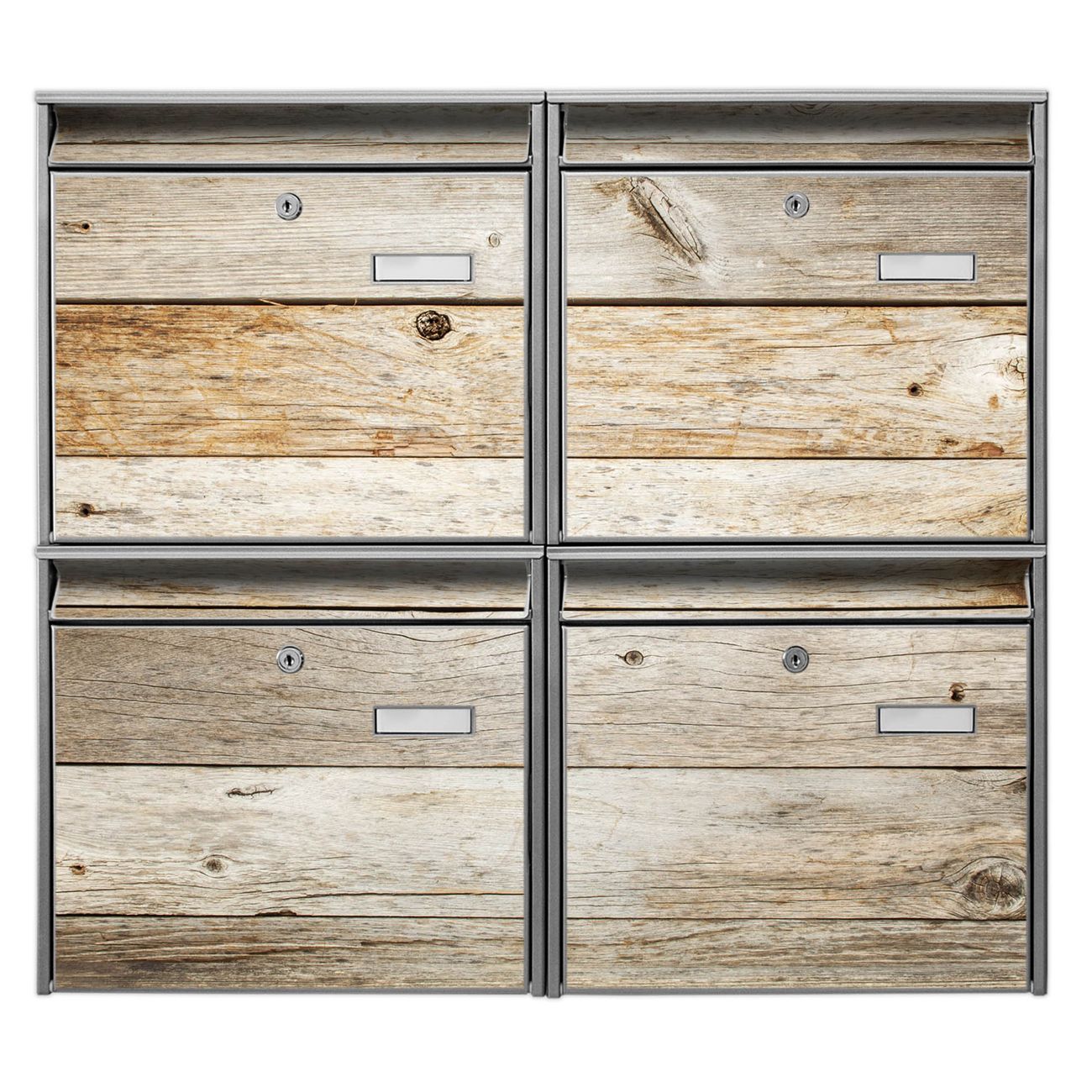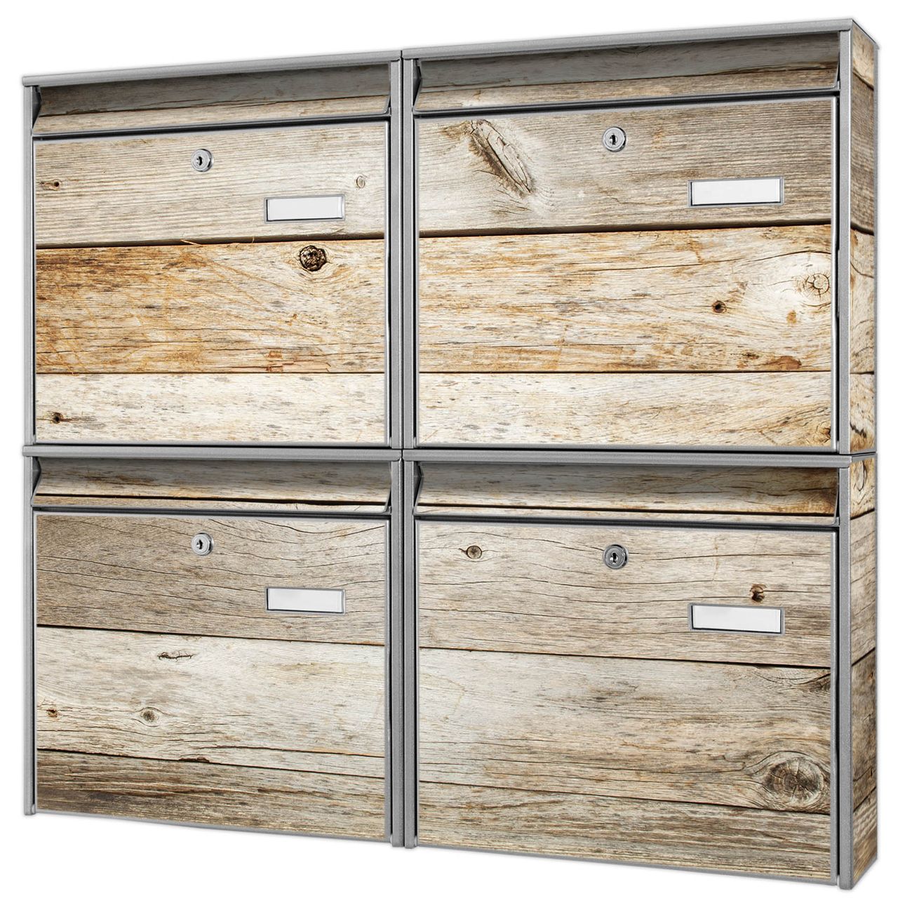 FUNKTION: Die Burg-Wächter Briefkastenanlage mit Motiv Graues Holz bietet Ihnen ausreichend Fassungsvermögen um auch A4 und C4 Sendungen zu empfangen. Das integrierte Namensschild lässt sich individuell beschriften. Wählen Sie aus den Grundfarben weiß, silber und schwarz. DESIGN: Die 4 Briefkästen haben ein ansprechendes und zeitloses Design, ohne dabei auf Funktionalität zu verzichten. Das Material ist sehr stabil, wetterfest und rostfrei. Durch das Motiv Graues Holz werden die Postkästen zu einem Blickfang. DETAILS: Die Postkästen bestehen aus verzinktem Stahl der zusätzlich mit Klarlack versiegelt wurde. Die Kästen sind gesamt 64,5cm hoch, 72,5cm breit und 10cm tief. Das Motiv besteht aus einer wetter- und UV-festen Folie, die Ihren Briefkasten zusätzlich vor Kratzern schützt. Die Postkästen werden mit Montagematerial, je einem Namensschild und je zwei Schlüsseln geliefert. NUTZEN: Das Briefkastenset eignet sich für die Wandmontage, die Größe bietet genügend Platz für Sendungen aller Art. Das zeitlose Design sowie die stabile Bauart bieten Ihnen einen treuen Begleiter für Ihre Post. BANJADO:
