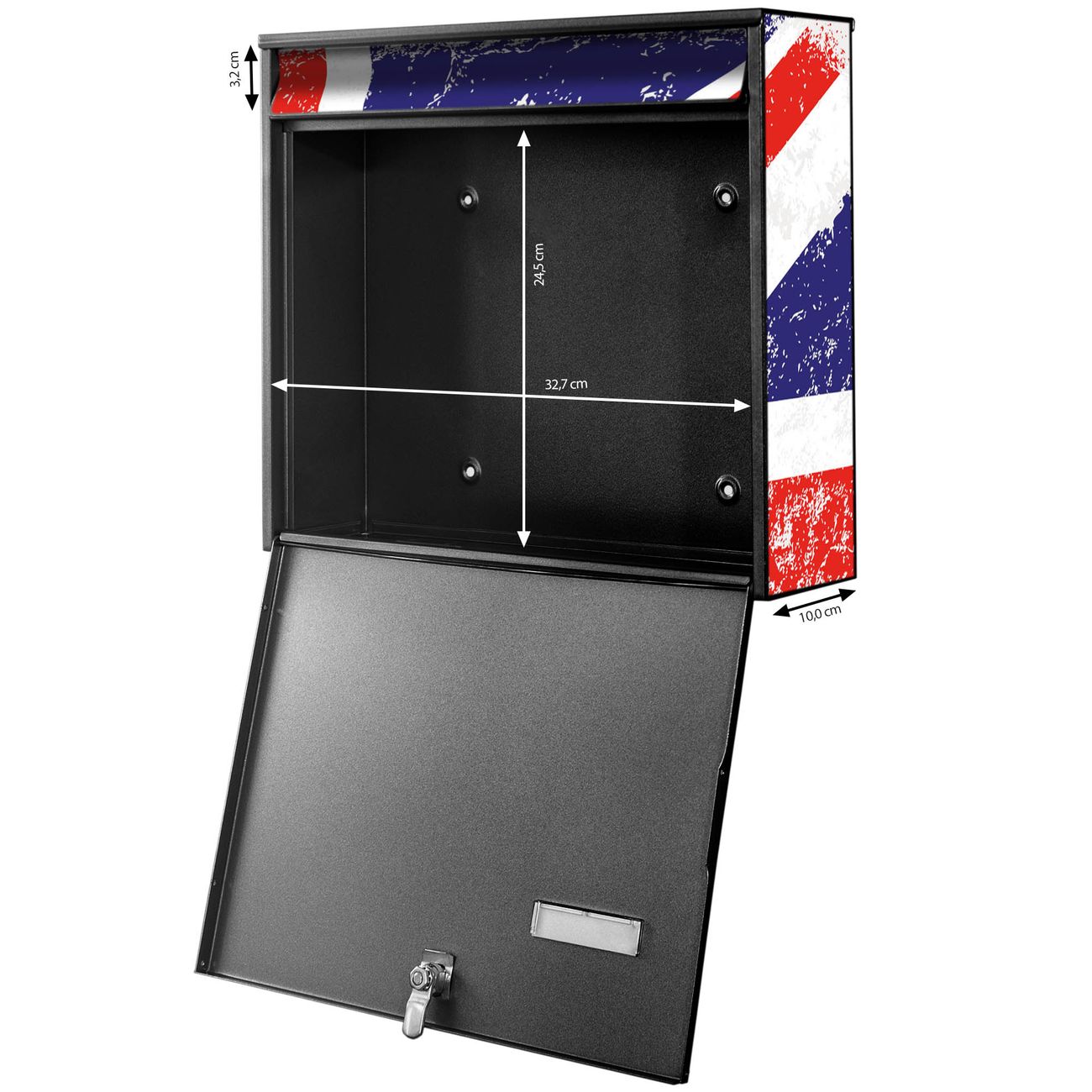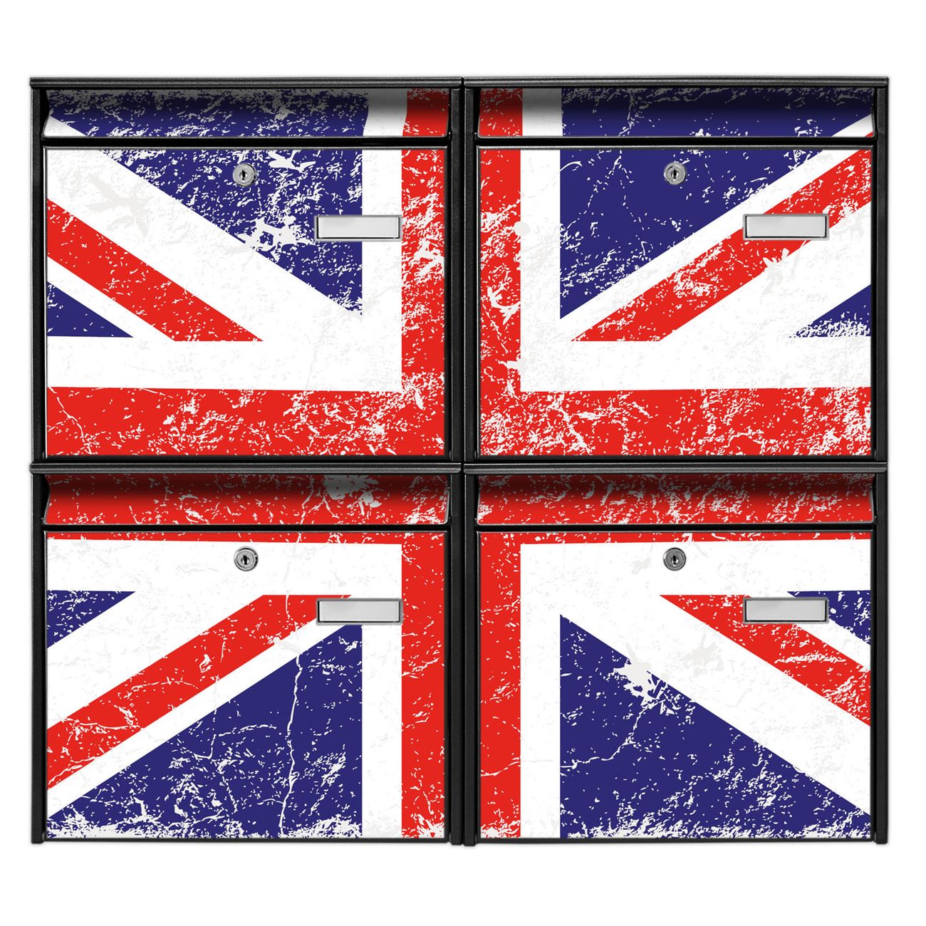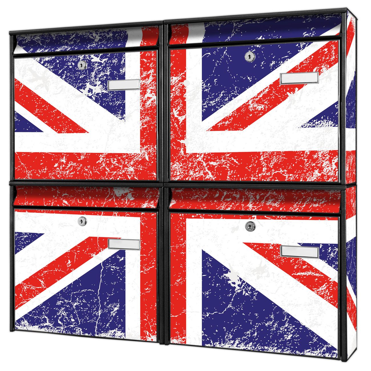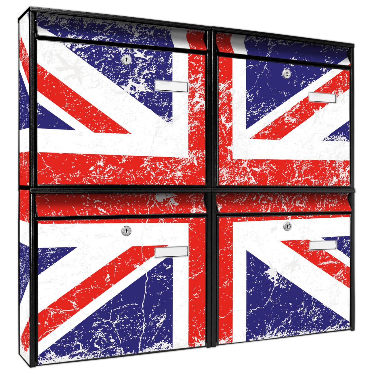 FUNKTION: Die Burg-Wächter Briefkastenanlage mit Motiv Great Britain bietet Ihnen ausreichend Fassungsvermögen um auch A4 und C4 Sendungen zu empfangen. Das integrierte Namensschild lässt sich individuell beschriften. Wählen Sie aus den Grundfarben weiß, silber und schwarz. DESIGN: Die 4 Briefkästen haben ein ansprechendes und zeitloses Design, ohne dabei auf Funktionalität zu verzichten. Das Material ist sehr stabil, wetterfest und rostfrei. Durch das Motiv Great Britain werden die Postkästen zu einem Blickfang. DETAILS: Die Postkästen bestehen aus verzinktem Stahl der zusätzlich mit Klarlack versiegelt wurde. Die Kästen sind gesamt 64,5cm hoch, 72,5cm breit und 10cm tief. Das Motiv besteht aus einer wetter- und UV-festen Folie, die Ihren Briefkasten zusätzlich vor Kratzern schützt. Die Postkästen werden mit Montagematerial, je einem Namensschild und je zwei Schlüsseln geliefert. NUTZEN: Das Briefkastenset eignet sich für die Wandmontage, die Größe bietet genügend Platz für Sendungen aller Art. Das zeitlose Design sowie die stabile Bauart bieten Ihnen einen treuen Begleiter für Ihre Post. BANJADO: