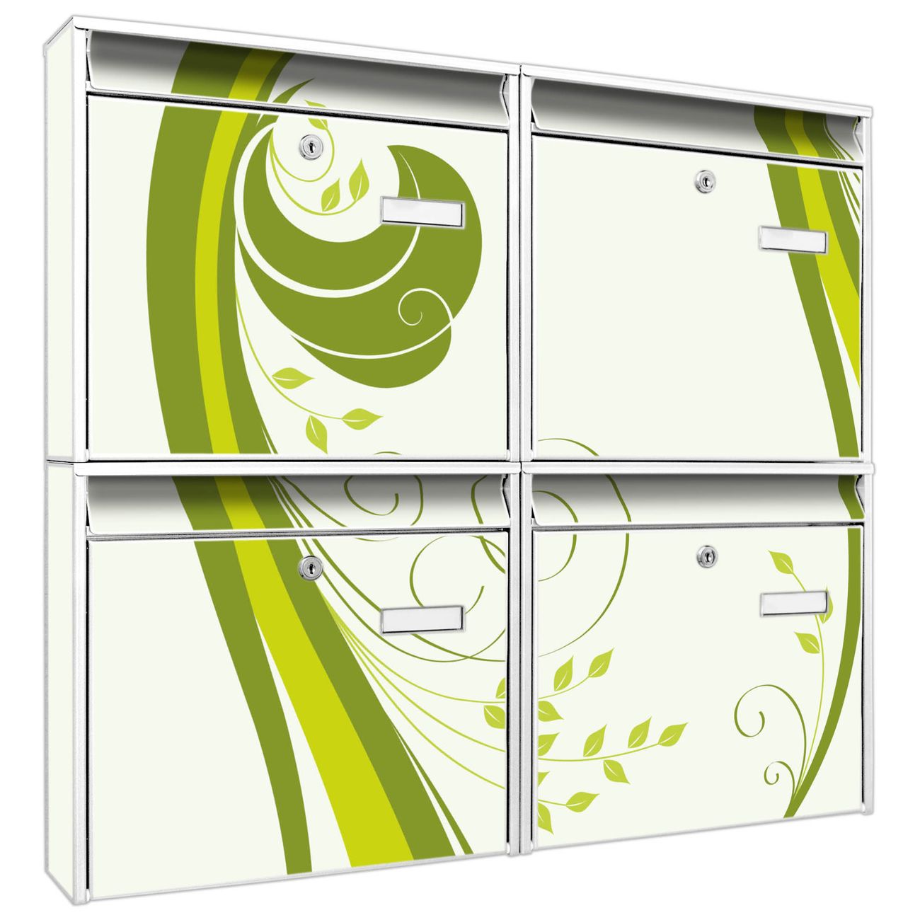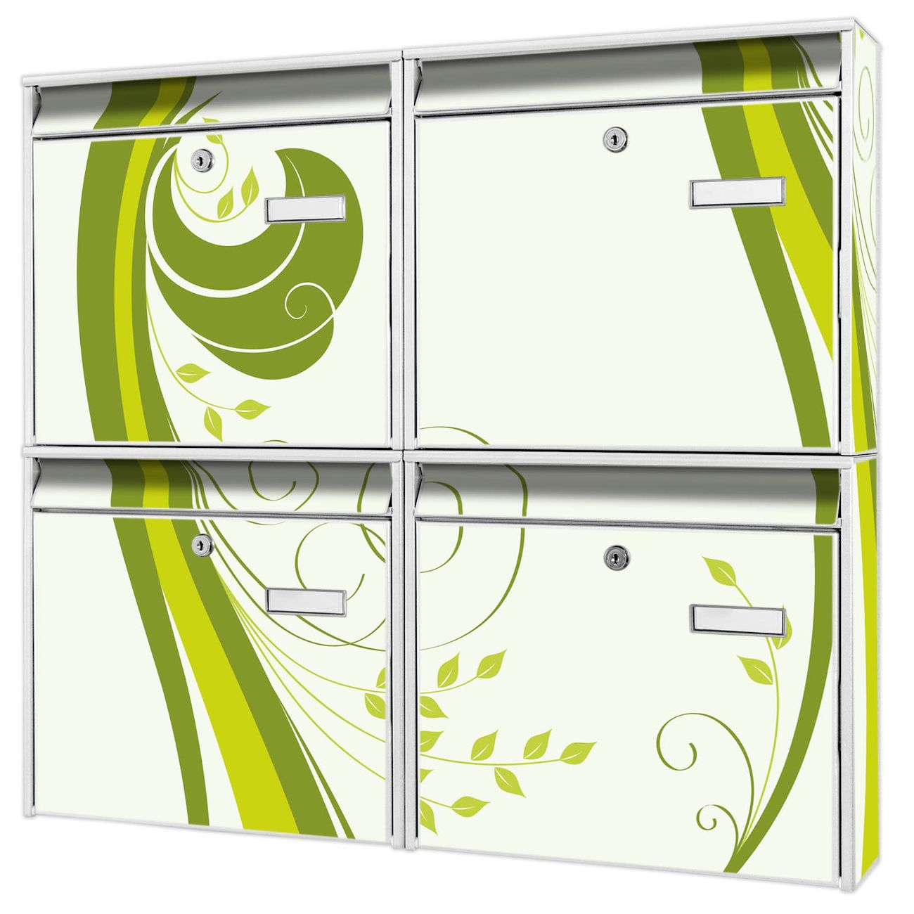 FUNKTION: Die Burg-Wächter Briefkastenanlage mit Motiv Green Swirl bietet Ihnen ausreichend Fassungsvermögen um auch A4 und C4 Sendungen zu empfangen. Das integrierte Namensschild lässt sich individuell beschriften. Wählen Sie aus den Grundfarben weiß, silber und schwarz. DESIGN: Die 4 Briefkästen haben ein ansprechendes und zeitloses Design, ohne dabei auf Funktionalität zu verzichten. Das Material ist sehr stabil, wetterfest und rostfrei. Durch das Motiv Green Swirl werden die Postkästen zu einem Blickfang. DETAILS: Die Postkästen bestehen aus verzinktem Stahl der zusätzlich mit Klarlack versiegelt wurde. Die Kästen sind gesamt 64,5cm hoch, 72,5cm breit und 10cm tief. Das Motiv besteht aus einer wetter- und UV-festen Folie, die Ihren Briefkasten zusätzlich vor Kratzern schützt. Die Postkästen werden mit Montagematerial, je einem Namensschild und je zwei Schlüsseln geliefert. NUTZEN: Das Briefkastenset eignet sich für die Wandmontage, die Größe bietet genügend Platz für Sendungen aller Art. Das zeitlose Design sowie die stabile Bauart bieten Ihnen einen treuen Begleiter für Ihre Post. BANJADO: