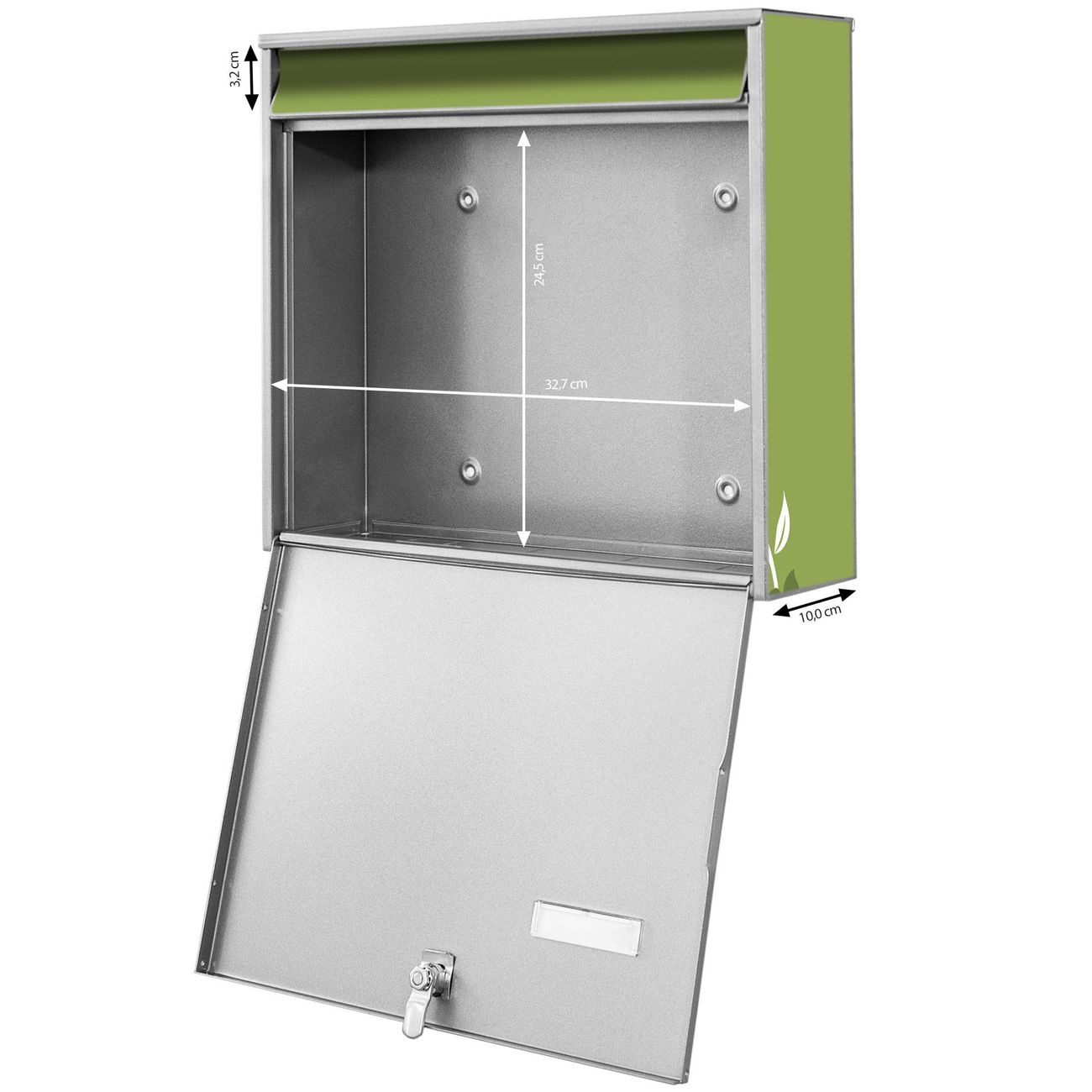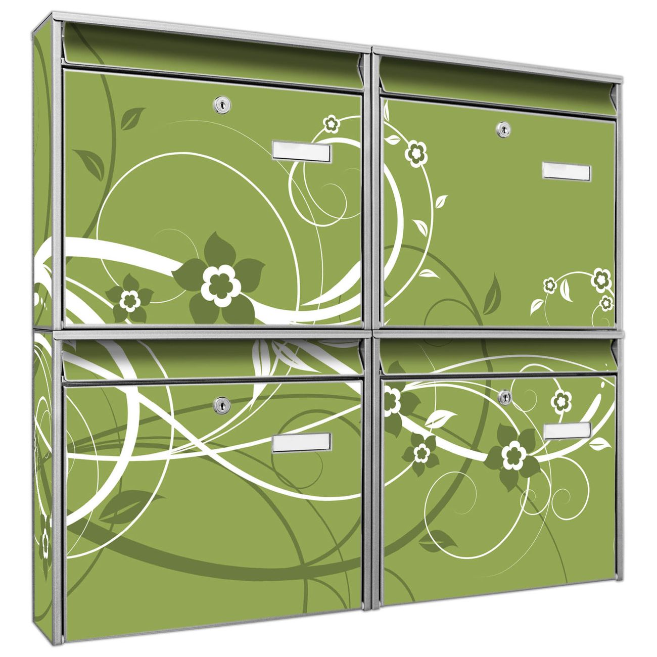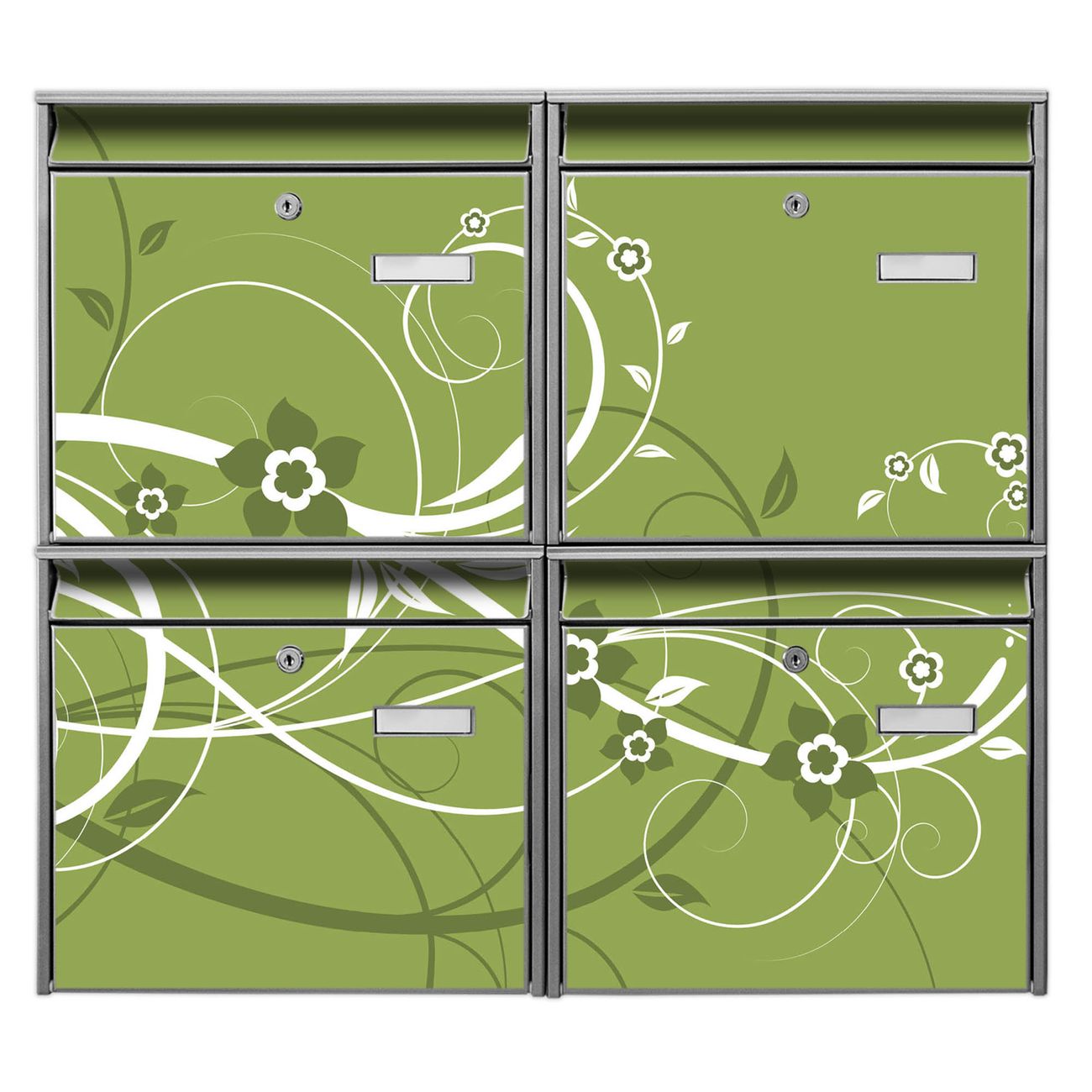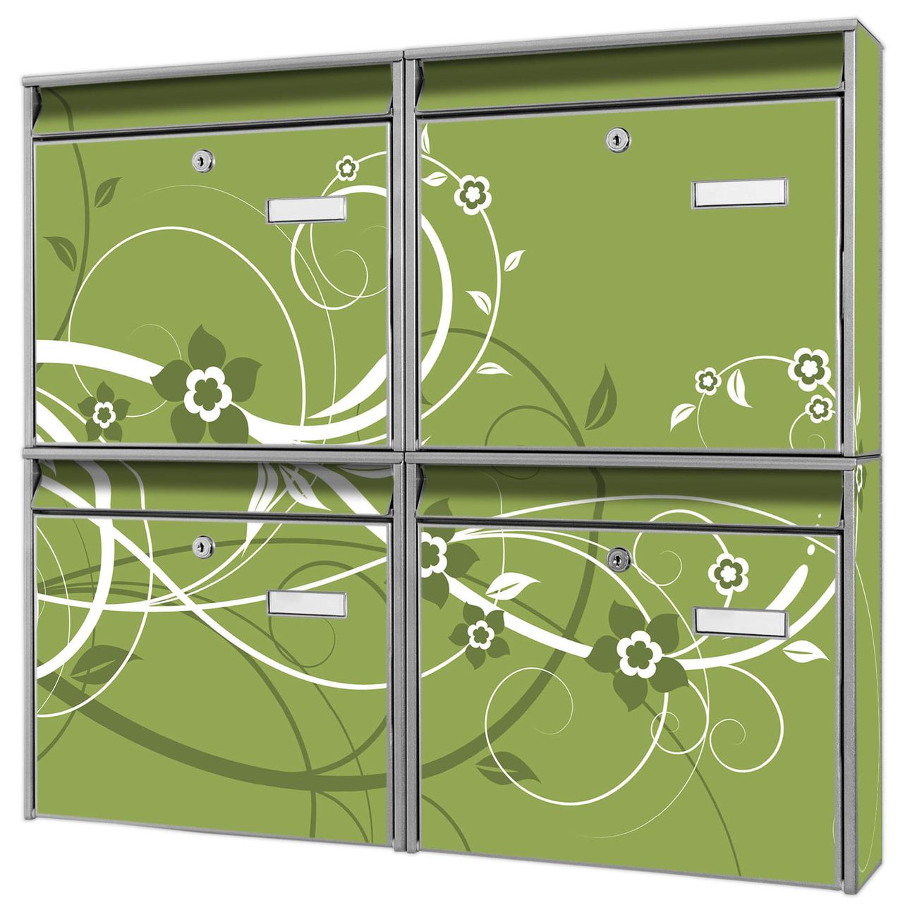 FUNKTION: Die Burg-Wächter Briefkastenanlage mit Motiv Grüne Blüten bietet Ihnen ausreichend Fassungsvermögen um auch A4 und C4 Sendungen zu empfangen. Das integrierte Namensschild lässt sich individuell beschriften. Wählen Sie aus den Grundfarben weiß, silber und schwarz. DESIGN: Die 4 Briefkästen haben ein ansprechendes und zeitloses Design, ohne dabei auf Funktionalität zu verzichten. Das Material ist sehr stabil, wetterfest und rostfrei. Durch das Motiv Grüne Blüten werden die Postkästen zu einem Blickfang. DETAILS: Die Postkästen bestehen aus verzinktem Stahl der zusätzlich mit Klarlack versiegelt wurde. Die Kästen sind gesamt 64,5cm hoch, 72,5cm breit und 10cm tief. Das Motiv besteht aus einer wetter- und UV-festen Folie, die Ihren Briefkasten zusätzlich vor Kratzern schützt. Die Postkästen werden mit Montagematerial, je einem Namensschild und je zwei Schlüsseln geliefert. NUTZEN: Das Briefkastenset eignet sich für die Wandmontage, die Größe bietet genügend Platz für Sendungen aller Art. Das zeitlose Design sowie die stabile Bauart bieten Ihnen einen treuen Begleiter für Ihre Post. BANJADO: