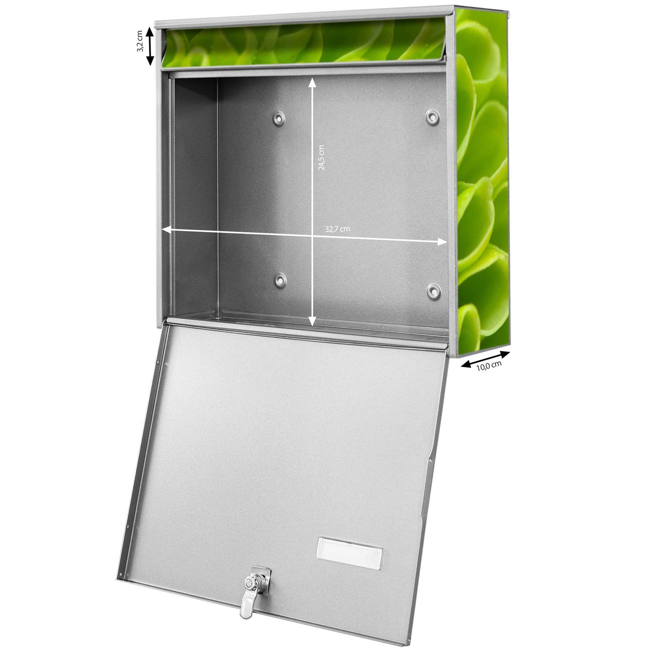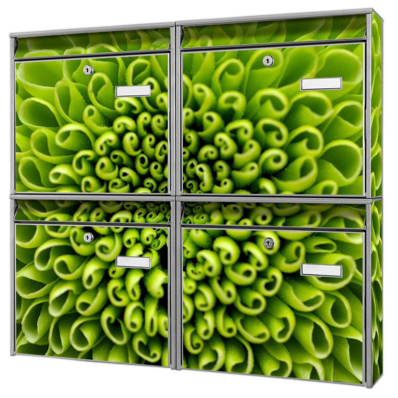 FUNKTION: Die Burg-Wächter Briefkastenanlage mit Motiv Grüne Chrysantheme bietet Ihnen ausreichend Fassungsvermögen um auch A4 und C4 Sendungen zu empfangen. Das integrierte Namensschild lässt sich individuell beschriften. Wählen Sie aus den Grundfarben weiß, silber und schwarz. DESIGN: Die 4 Briefkästen haben ein ansprechendes und zeitloses Design, ohne dabei auf Funktionalität zu verzichten. Das Material ist sehr stabil, wetterfest und rostfrei. Durch das Motiv Grüne Chrysantheme werden die Postkästen zu einem Blickfang. DETAILS: Die Postkästen bestehen aus verzinktem Stahl der zusätzlich mit Klarlack versiegelt wurde. Die Kästen sind gesamt 64,5cm hoch, 72,5cm breit und 10cm tief. Das Motiv besteht aus einer wetter- und UV-festen Folie, die Ihren Briefkasten zusätzlich vor Kratzern schützt. Die Postkästen werden mit Montagematerial, je einem Namensschild und je zwei Schlüsseln geliefert. NUTZEN: Das Briefkastenset eignet sich für die Wandmontage, die Größe bietet genügend Platz für Sendungen aller Art. Das zeitlose Design sowie die stabile Bauart bieten Ihnen einen treuen Begleiter für Ihre Post. BANJADO: