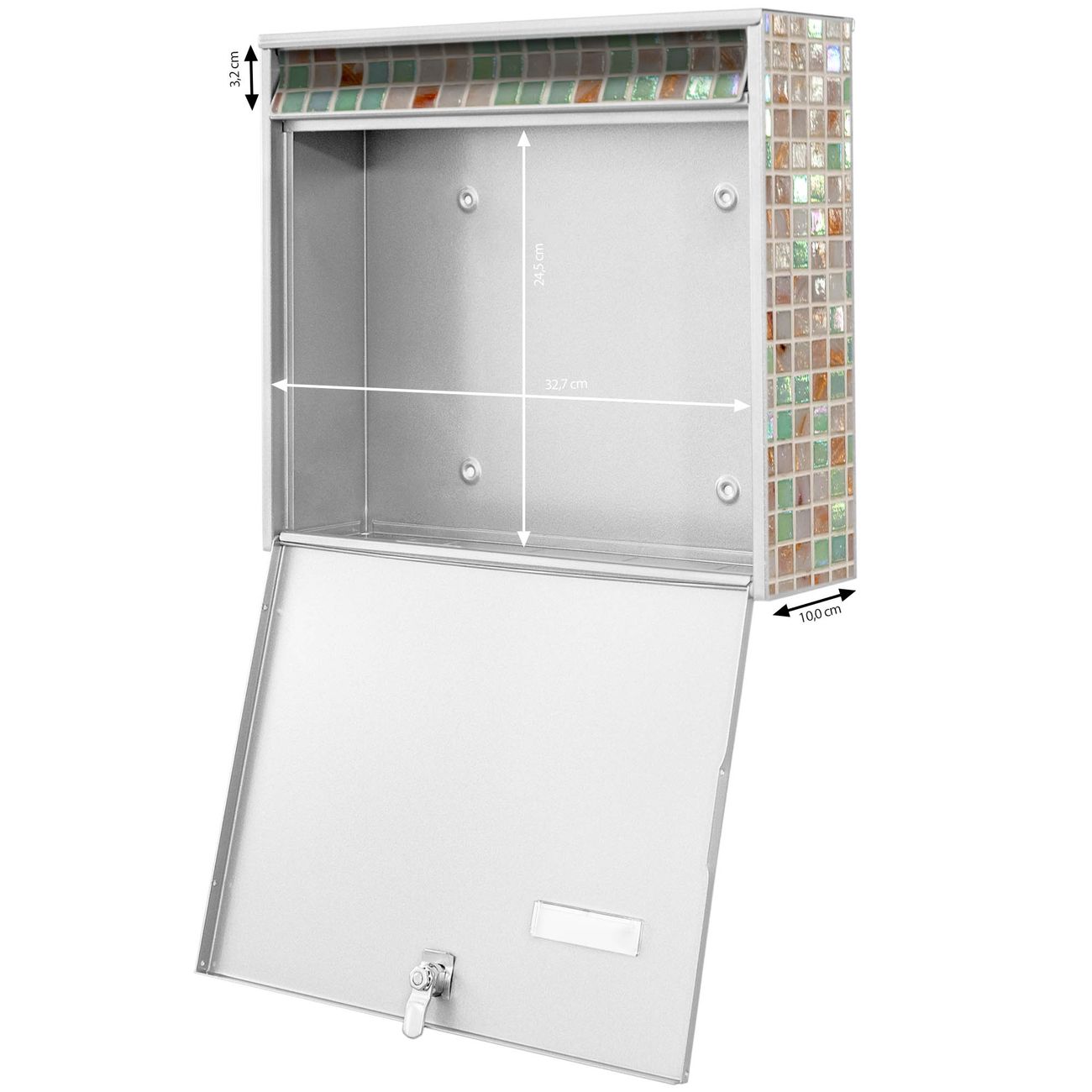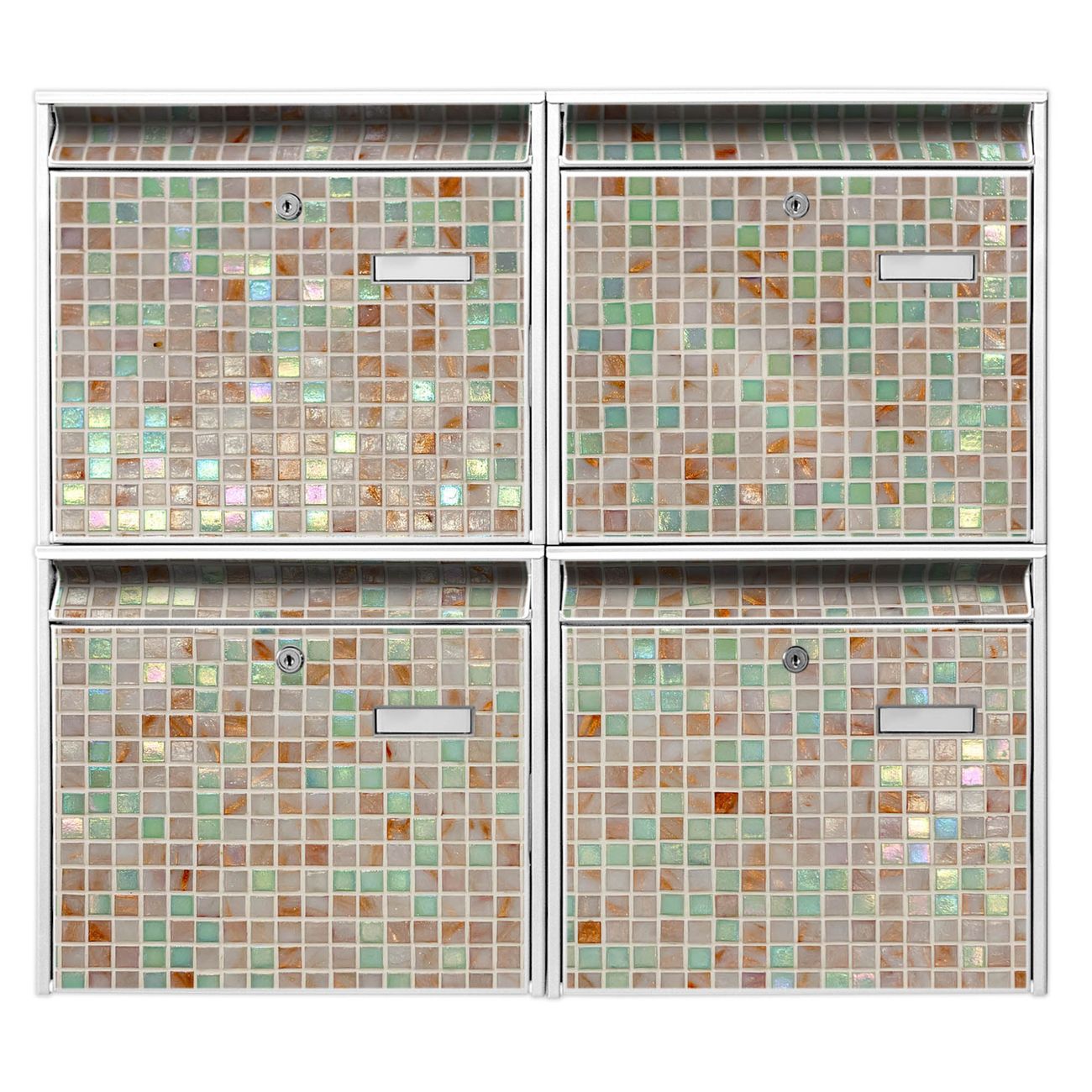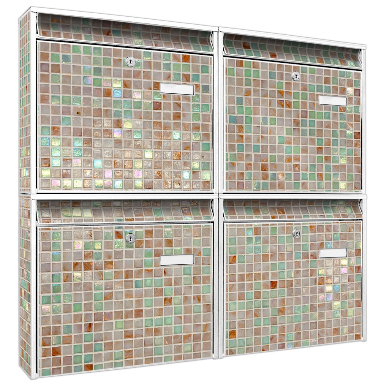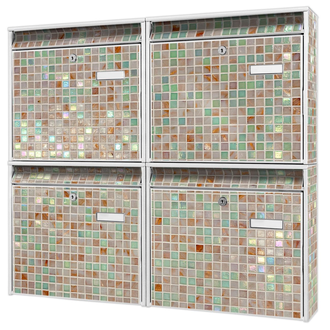 FUNKTION: Die Burg-Wächter Briefkastenanlage mit Motiv Grüne Fliesen bietet Ihnen ausreichend Fassungsvermögen um auch A4 und C4 Sendungen zu empfangen. Das integrierte Namensschild lässt sich individuell beschriften. Wählen Sie aus den Grundfarben weiß, silber und schwarz. DESIGN: Die 4 Briefkästen haben ein ansprechendes und zeitloses Design, ohne dabei auf Funktionalität zu verzichten. Das Material ist sehr stabil, wetterfest und rostfrei. Durch das Motiv Grüne Fliesen werden die Postkästen zu einem Blickfang. DETAILS: Die Postkästen bestehen aus verzinktem Stahl der zusätzlich mit Klarlack versiegelt wurde. Die Kästen sind gesamt 64,5cm hoch, 72,5cm breit und 10cm tief. Das Motiv besteht aus einer wetter- und UV-festen Folie, die Ihren Briefkasten zusätzlich vor Kratzern schützt. Die Postkästen werden mit Montagematerial, je einem Namensschild und je zwei Schlüsseln geliefert. NUTZEN: Das Briefkastenset eignet sich für die Wandmontage, die Größe bietet genügend Platz für Sendungen aller Art. Das zeitlose Design sowie die stabile Bauart bieten Ihnen einen treuen Begleiter für Ihre Post. BANJADO: