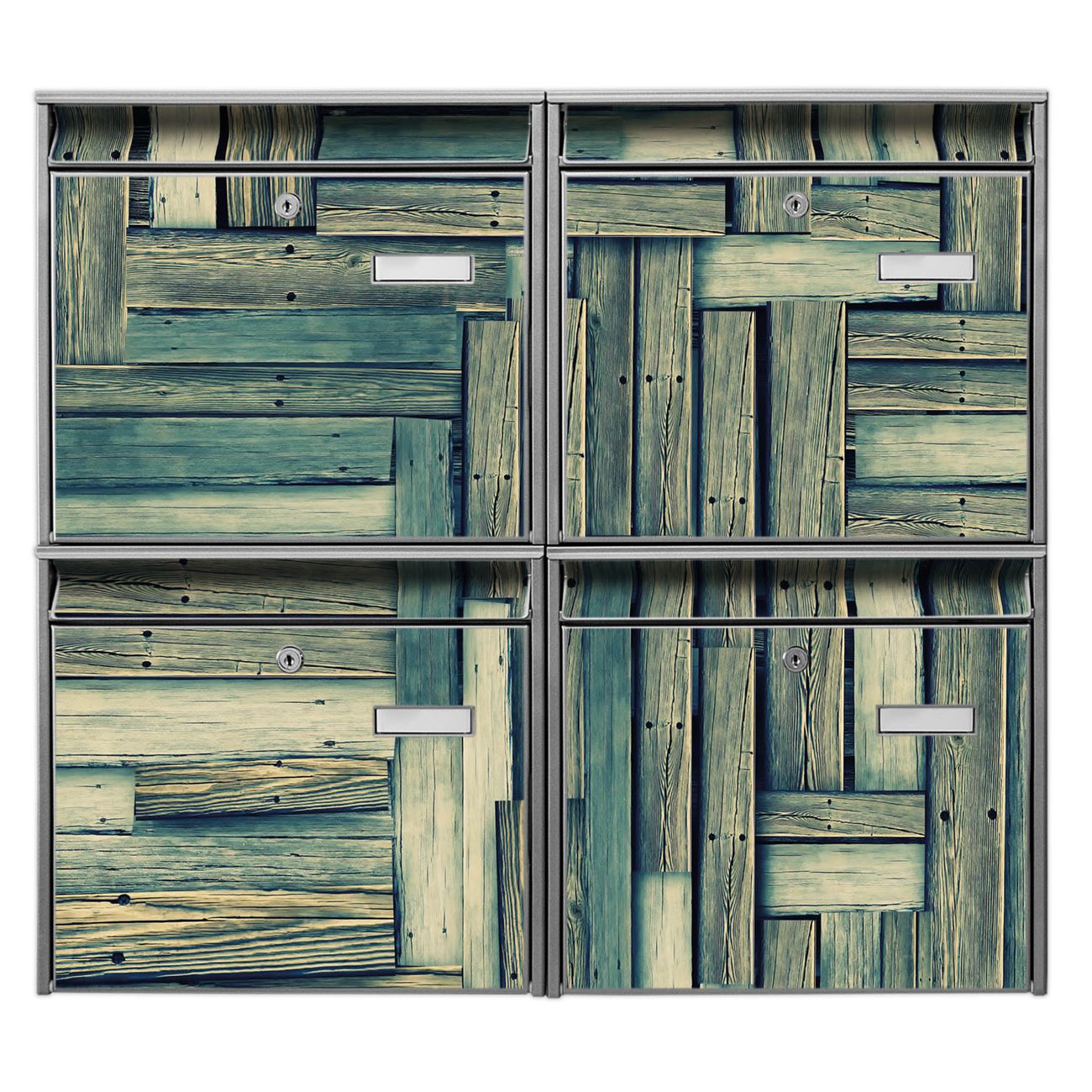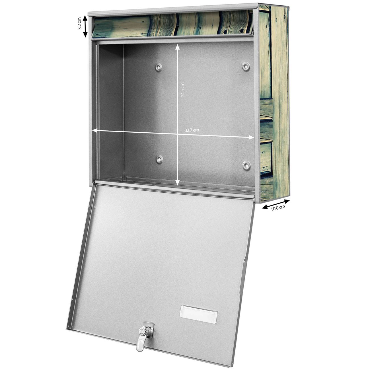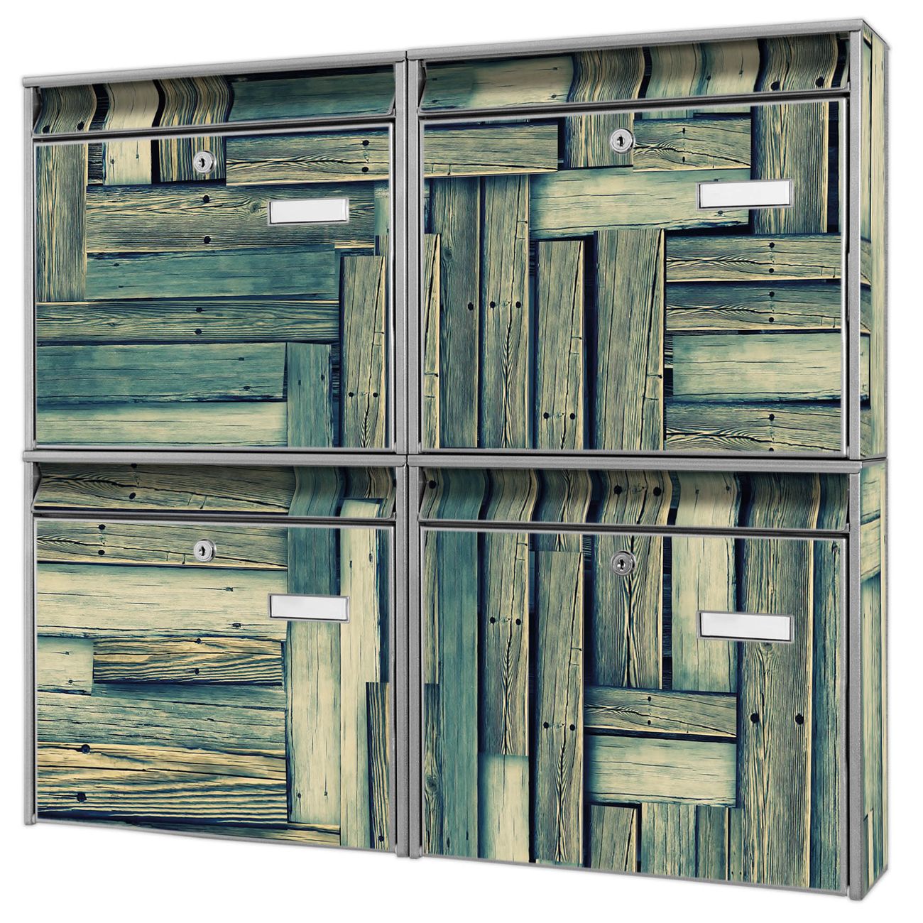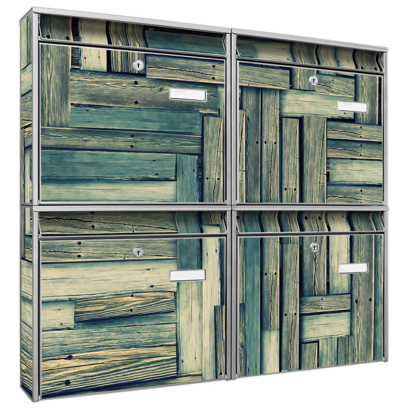 FUNKTION: Die Burg-Wächter Briefkastenanlage mit Motiv Grüne Planken bietet Ihnen ausreichend Fassungsvermögen um auch A4 und C4 Sendungen zu empfangen. Das integrierte Namensschild lässt sich individuell beschriften. Wählen Sie aus den Grundfarben weiß, silber und schwarz. DESIGN: Die 4 Briefkästen haben ein ansprechendes und zeitloses Design, ohne dabei auf Funktionalität zu verzichten. Das Material ist sehr stabil, wetterfest und rostfrei. Durch das Motiv Grüne Planken werden die Postkästen zu einem Blickfang. DETAILS: Die Postkästen bestehen aus verzinktem Stahl der zusätzlich mit Klarlack versiegelt wurde. Die Kästen sind gesamt 64,5cm hoch, 72,5cm breit und 10cm tief. Das Motiv besteht aus einer wetter- und UV-festen Folie, die Ihren Briefkasten zusätzlich vor Kratzern schützt. Die Postkästen werden mit Montagematerial, je einem Namensschild und je zwei Schlüsseln geliefert. NUTZEN: Das Briefkastenset eignet sich für die Wandmontage, die Größe bietet genügend Platz für Sendungen aller Art. Das zeitlose Design sowie die stabile Bauart bieten Ihnen einen treuen Begleiter für Ihre Post. BANJADO: