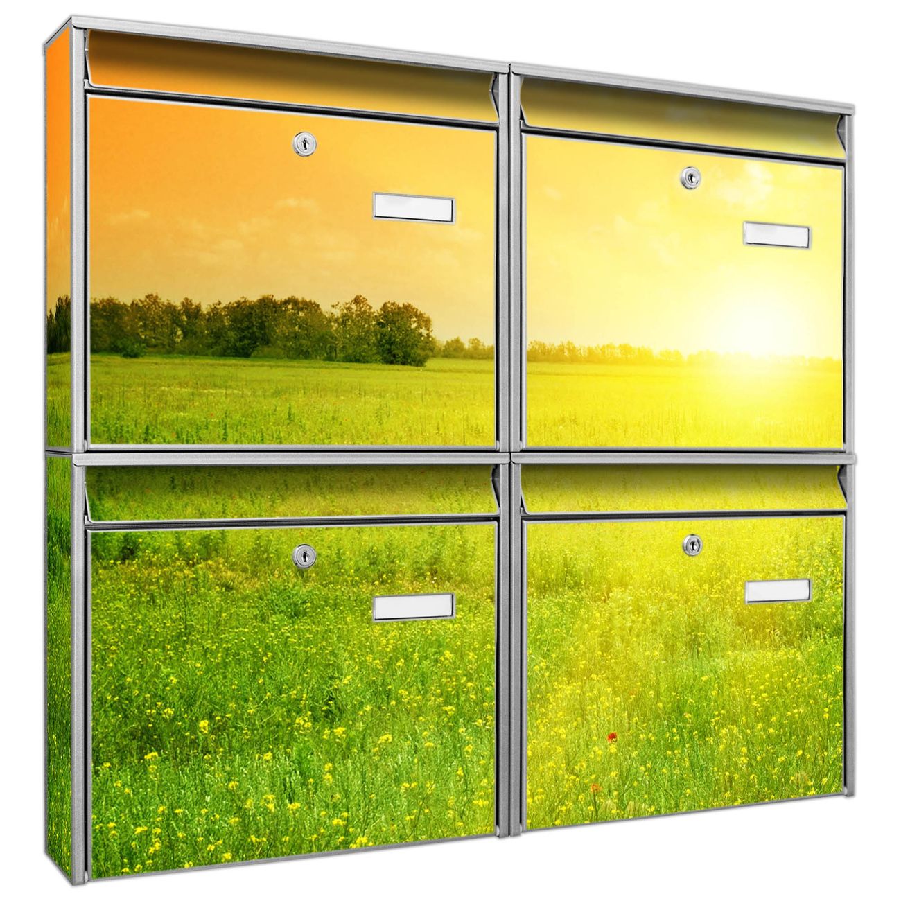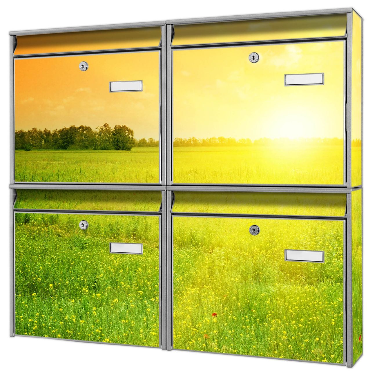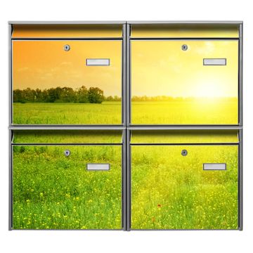 FUNKTION: Die Burg-Wächter Briefkastenanlage mit Motiv Guten Morgen 2 bietet Ihnen ausreichend Fassungsvermögen um auch A4 und C4 Sendungen zu empfangen. Das integrierte Namensschild lässt sich individuell beschriften. Wählen Sie aus den Grundfarben weiß, silber und schwarz. DESIGN: Die 4 Briefkästen haben ein ansprechendes und zeitloses Design, ohne dabei auf Funktionalität zu verzichten. Das Material ist sehr stabil, wetterfest und rostfrei. Durch das Motiv Guten Morgen 2 werden die Postkästen zu einem Blickfang. DETAILS: Die Postkästen bestehen aus verzinktem Stahl der zusätzlich mit Klarlack versiegelt wurde. Die Kästen sind gesamt 64,5cm hoch, 72,5cm breit und 10cm tief. Das Motiv besteht aus einer wetter- und UV-festen Folie, die Ihren Briefkasten zusätzlich vor Kratzern schützt. Die Postkästen werden mit Montagematerial, je einem Namensschild und je zwei Schlüsseln geliefert. NUTZEN: Das Briefkastenset eignet sich für die Wandmontage, die Größe bietet genügend Platz für Sendungen aller Art. Das zeitlose Design sowie die stabile Bauart bieten Ihnen einen treuen Begleiter für Ihre Post. BANJADO: