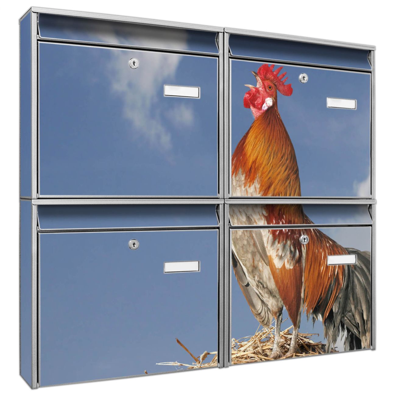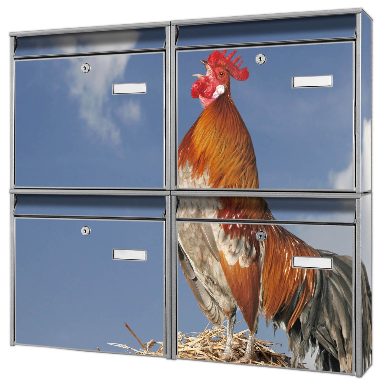 FUNKTION: Die Burg-Wächter Briefkastenanlage mit Motiv Hahn bietet Ihnen ausreichend Fassungsvermögen um auch A4 und C4 Sendungen zu empfangen. Das integrierte Namensschild lässt sich individuell beschriften. Wählen Sie aus den Grundfarben weiß, silber und schwarz. DESIGN: Die 4 Briefkästen haben ein ansprechendes und zeitloses Design, ohne dabei auf Funktionalität zu verzichten. Das Material ist sehr stabil, wetterfest und rostfrei. Durch das Motiv Hahn werden die Postkästen zu einem Blickfang. DETAILS: Die Postkästen bestehen aus verzinktem Stahl der zusätzlich mit Klarlack versiegelt wurde. Die Kästen sind gesamt 64,5cm hoch, 72,5cm breit und 10cm tief. Das Motiv besteht aus einer wetter- und UV-festen Folie, die Ihren Briefkasten zusätzlich vor Kratzern schützt. Die Postkästen werden mit Montagematerial, je einem Namensschild und je zwei Schlüsseln geliefert. NUTZEN: Das Briefkastenset eignet sich für die Wandmontage, die Größe bietet genügend Platz für Sendungen aller Art. Das zeitlose Design sowie die stabile Bauart bieten Ihnen einen treuen Begleiter für Ihre Post. BANJADO: