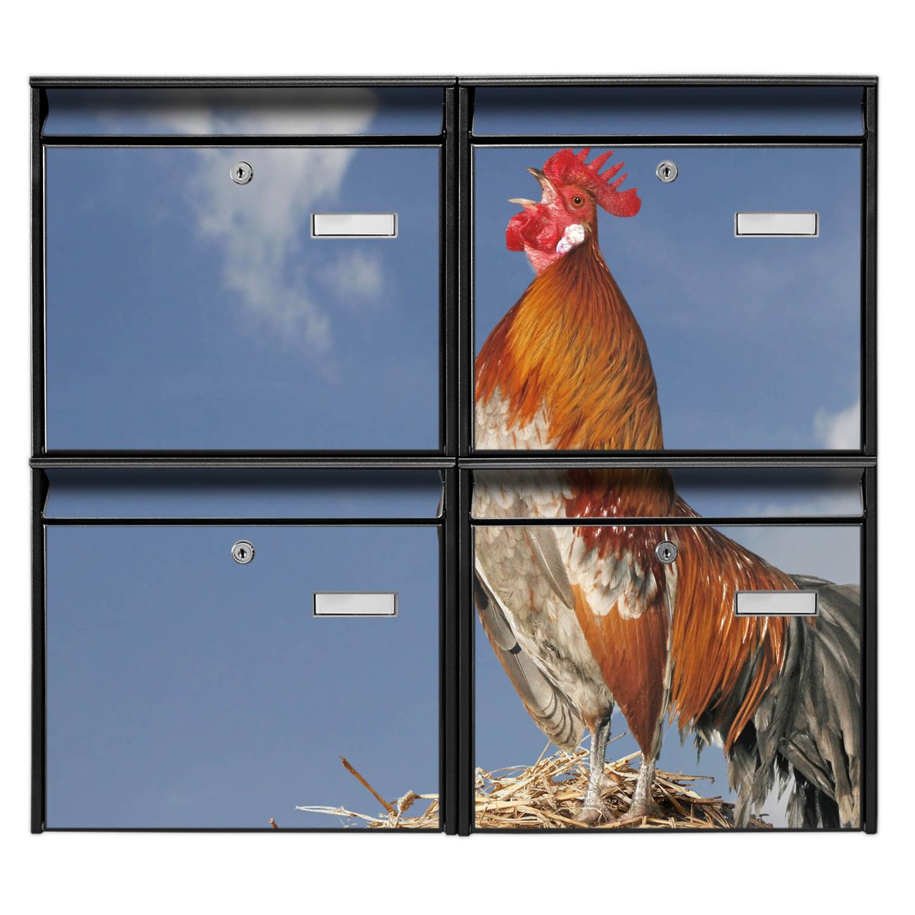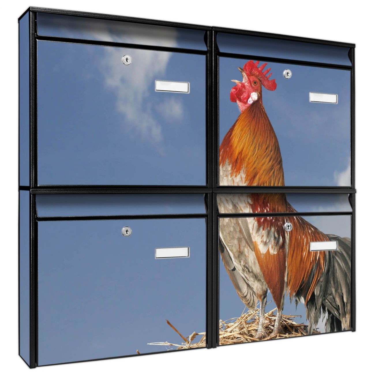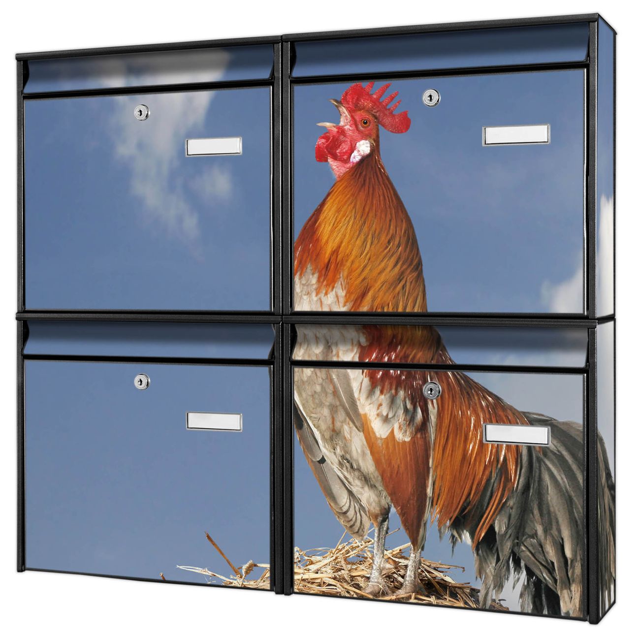 FUNKTION: Die Burg-Wächter Briefkastenanlage mit Motiv Hahn bietet Ihnen ausreichend Fassungsvermögen um auch A4 und C4 Sendungen zu empfangen. Das integrierte Namensschild lässt sich individuell beschriften. Wählen Sie aus den Grundfarben weiß, silber und schwarz. DESIGN: Die 4 Briefkästen haben ein ansprechendes und zeitloses Design, ohne dabei auf Funktionalität zu verzichten. Das Material ist sehr stabil, wetterfest und rostfrei. Durch das Motiv Hahn werden die Postkästen zu einem Blickfang. DETAILS: Die Postkästen bestehen aus verzinktem Stahl der zusätzlich mit Klarlack versiegelt wurde. Die Kästen sind gesamt 64,5cm hoch, 72,5cm breit und 10cm tief. Das Motiv besteht aus einer wetter- und UV-festen Folie, die Ihren Briefkasten zusätzlich vor Kratzern schützt. Die Postkästen werden mit Montagematerial, je einem Namensschild und je zwei Schlüsseln geliefert. NUTZEN: Das Briefkastenset eignet sich für die Wandmontage, die Größe bietet genügend Platz für Sendungen aller Art. Das zeitlose Design sowie die stabile Bauart bieten Ihnen einen treuen Begleiter für Ihre Post. BANJADO: