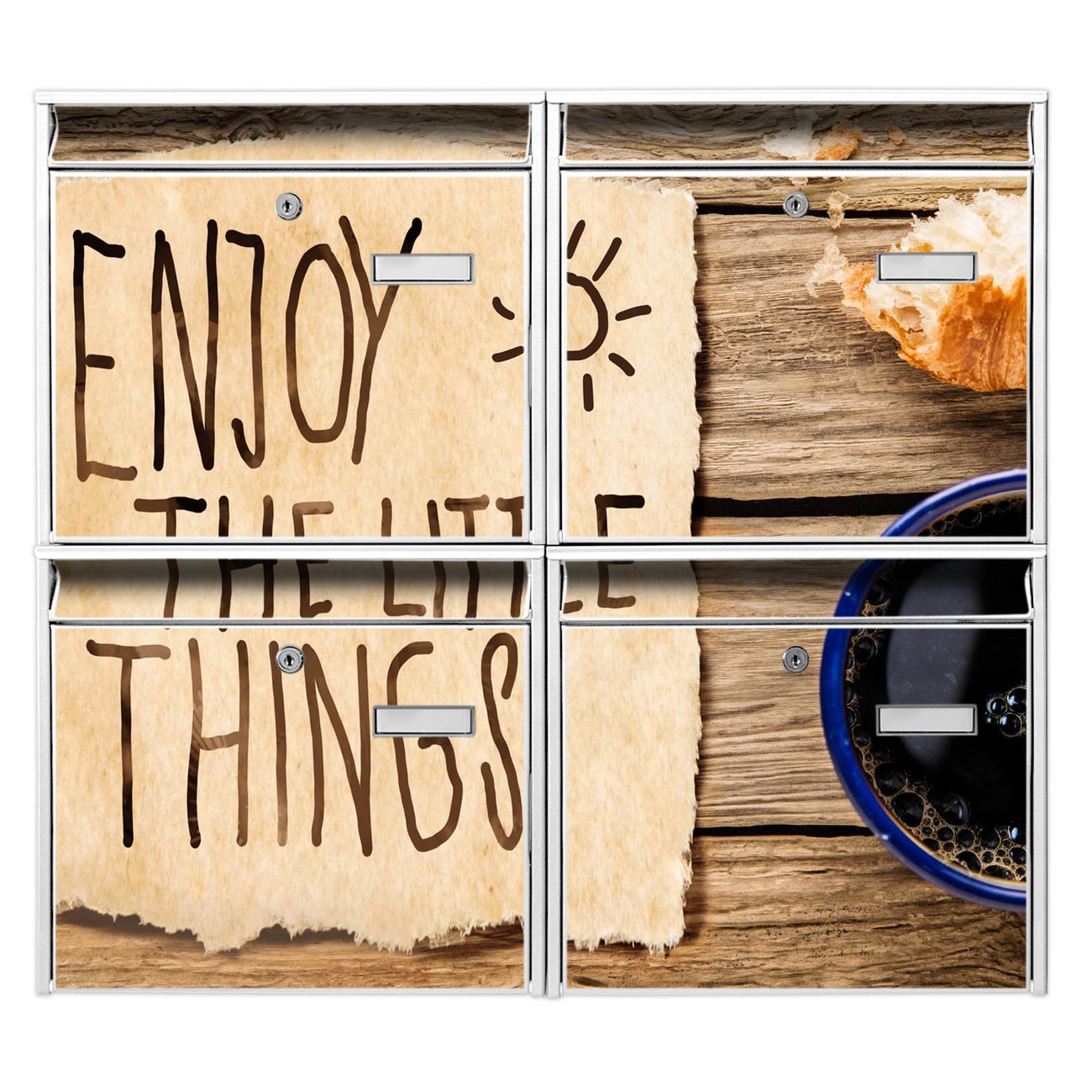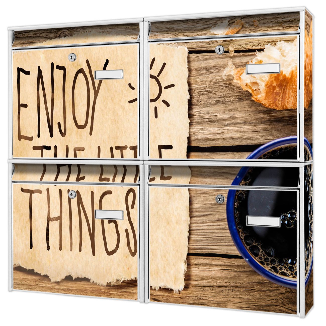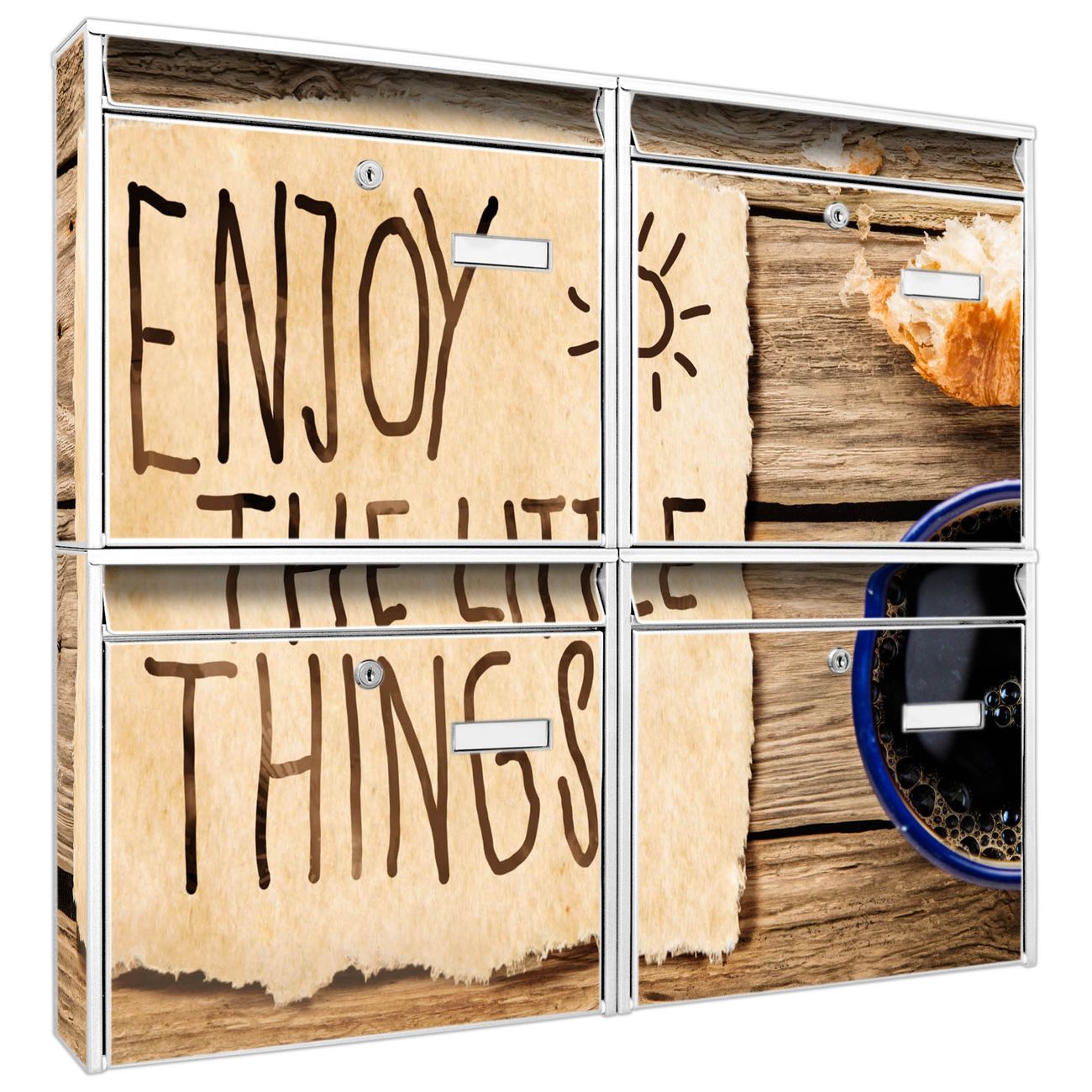 FUNKTION: Die Burg-Wächter Briefkastenanlage mit Motiv Happy Day bietet Ihnen ausreichend Fassungsvermögen um auch A4 und C4 Sendungen zu empfangen. Das integrierte Namensschild lässt sich individuell beschriften. Wählen Sie aus den Grundfarben weiß, silber und schwarz. DESIGN: Die 4 Briefkästen haben ein ansprechendes und zeitloses Design, ohne dabei auf Funktionalität zu verzichten. Das Material ist sehr stabil, wetterfest und rostfrei. Durch das Motiv Happy Day werden die Postkästen zu einem Blickfang. DETAILS: Die Postkästen bestehen aus verzinktem Stahl der zusätzlich mit Klarlack versiegelt wurde. Die Kästen sind gesamt 64,5cm hoch, 72,5cm breit und 10cm tief. Das Motiv besteht aus einer wetter- und UV-festen Folie, die Ihren Briefkasten zusätzlich vor Kratzern schützt. Die Postkästen werden mit Montagematerial, je einem Namensschild und je zwei Schlüsseln geliefert. NUTZEN: Das Briefkastenset eignet sich für die Wandmontage, die Größe bietet genügend Platz für Sendungen aller Art. Das zeitlose Design sowie die stabile Bauart bieten Ihnen einen treuen Begleiter für Ihre Post. BANJADO:
