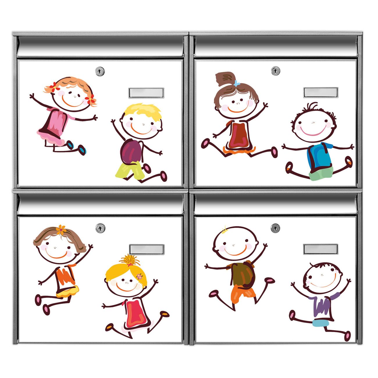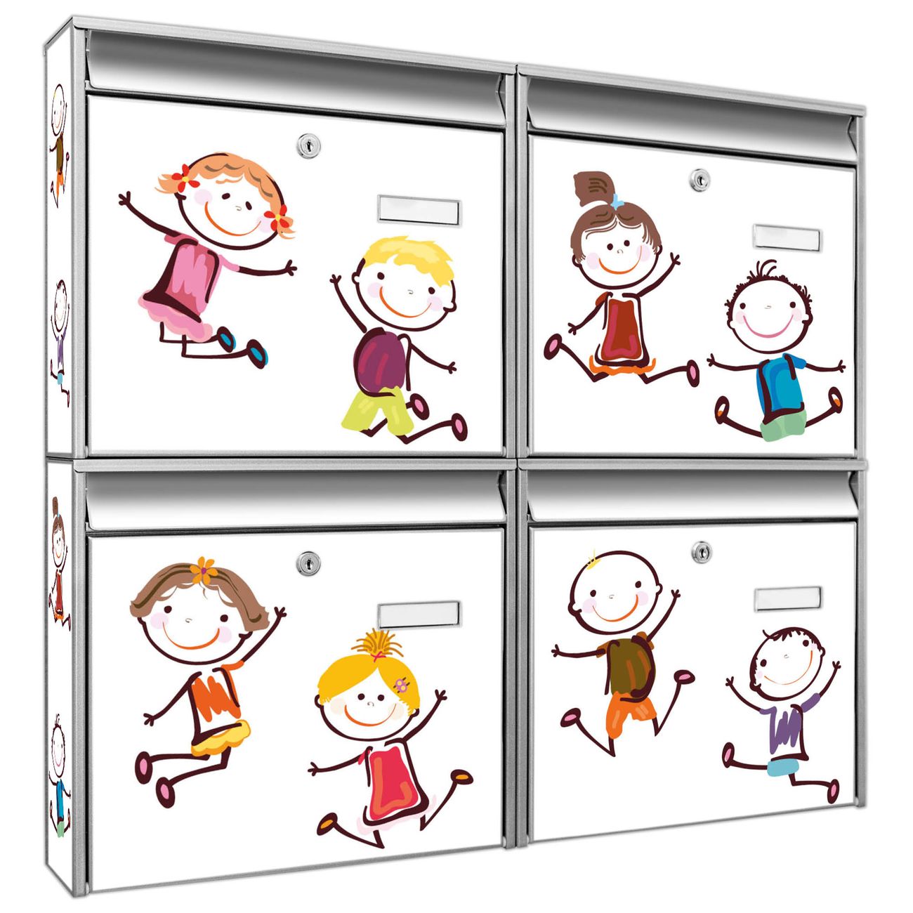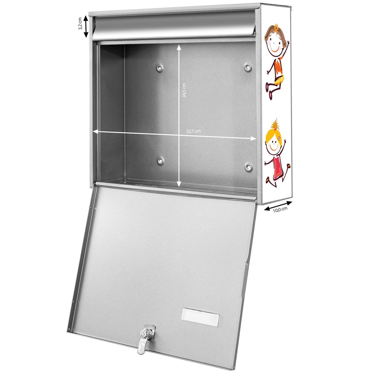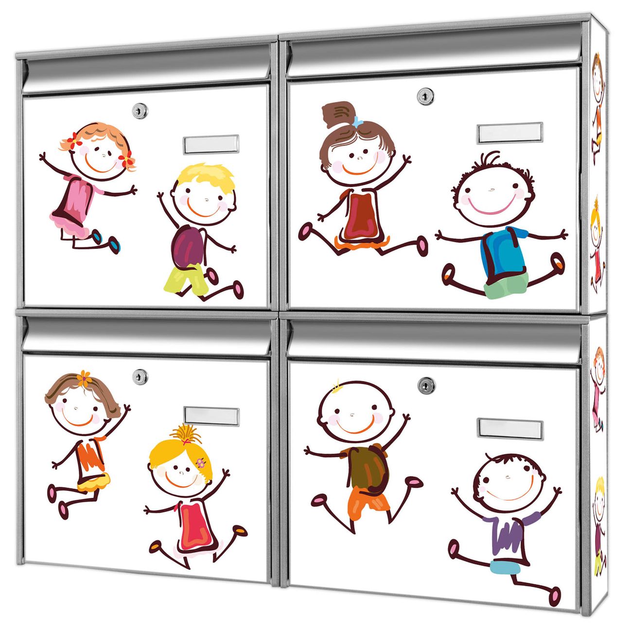FUNKTION: Die Burg-Wächter Briefkastenanlage mit Motiv Happy Kids bietet Ihnen ausreichend Fassungsvermögen um auch A4 und C4 Sendungen zu empfangen. Das integrierte Namensschild lässt sich individuell beschriften. Wählen Sie aus den Grundfarben weiß, silber und schwarz. DESIGN: Die 4 Briefkästen haben ein ansprechendes und zeitloses Design, ohne dabei auf Funktionalität zu verzichten. Das Material ist sehr stabil, wetterfest und rostfrei. Durch das Motiv Happy Kids werden die Postkästen zu einem Blickfang. DETAILS: Die Postkästen bestehen aus verzinktem Stahl der zusätzlich mit Klarlack versiegelt wurde. Die Kästen sind gesamt 64,5cm hoch, 72,5cm breit und 10cm tief. Das Motiv besteht aus einer wetter- und UV-festen Folie, die Ihren Briefkasten zusätzlich vor Kratzern schützt. Die Postkästen werden mit Montagematerial, je einem Namensschild und je zwei Schlüsseln geliefert. NUTZEN: Das Briefkastenset eignet sich für die Wandmontage, die Größe bietet genügend Platz für Sendungen aller Art. Das zeitlose Design sowie die stabile Bauart bieten Ihnen einen treuen Begleiter für Ihre Post. BANJADO: