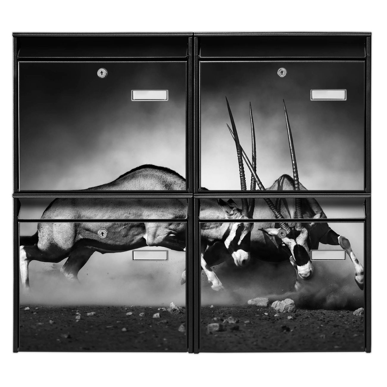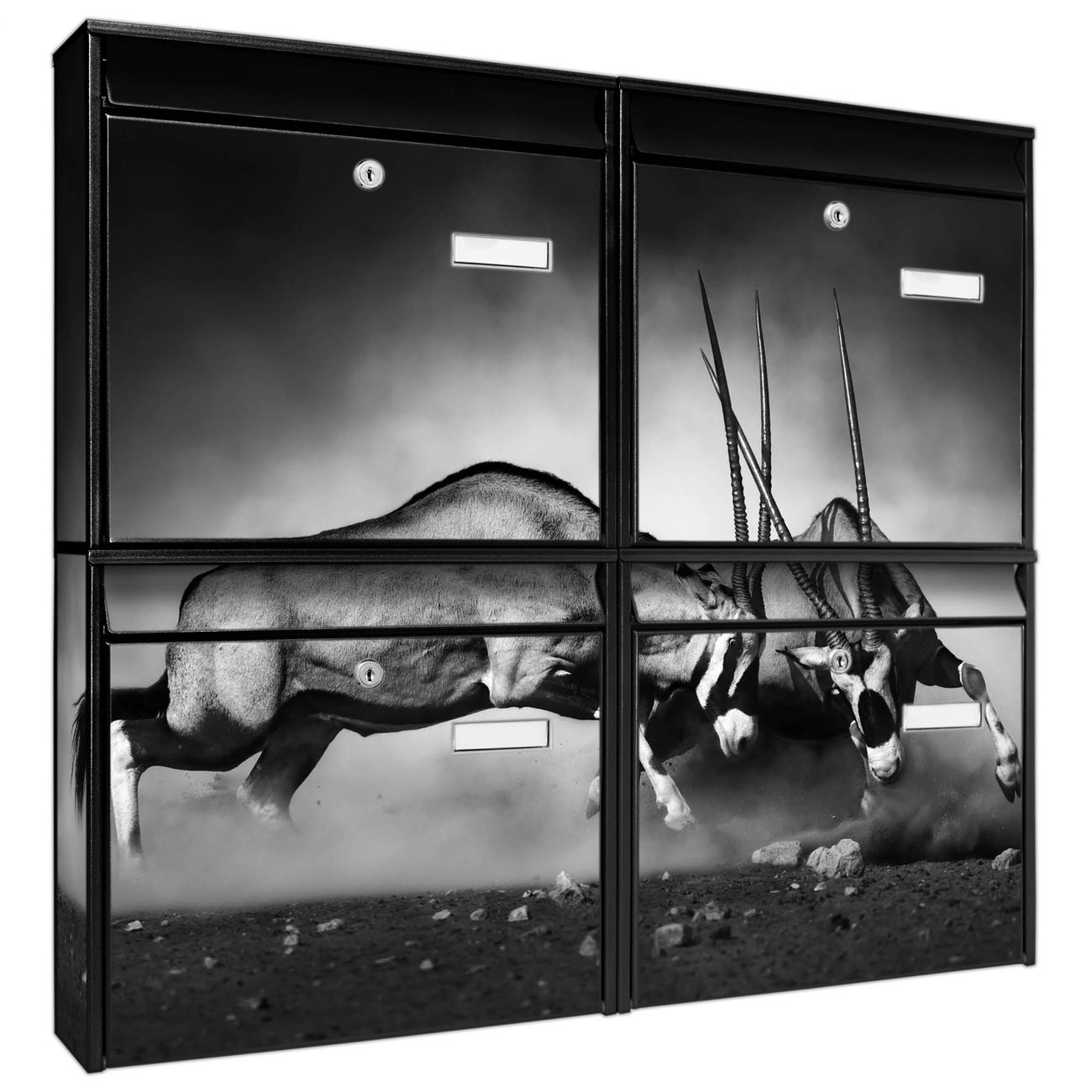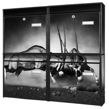 FUNKTION: Die Burg-Wächter Briefkastenanlage mit Motiv Head Crash bietet Ihnen ausreichend Fassungsvermögen um auch A4 und C4 Sendungen zu empfangen. Das integrierte Namensschild lässt sich individuell beschriften. Wählen Sie aus den Grundfarben weiß, silber und schwarz. DESIGN: Die 4 Briefkästen haben ein ansprechendes und zeitloses Design, ohne dabei auf Funktionalität zu verzichten. Das Material ist sehr stabil, wetterfest und rostfrei. Durch das Motiv Head Crash werden die Postkästen zu einem Blickfang. DETAILS: Die Postkästen bestehen aus verzinktem Stahl der zusätzlich mit Klarlack versiegelt wurde. Die Kästen sind gesamt 64,5cm hoch, 72,5cm breit und 10cm tief. Das Motiv besteht aus einer wetter- und UV-festen Folie, die Ihren Briefkasten zusätzlich vor Kratzern schützt. Die Postkästen werden mit Montagematerial, je einem Namensschild und je zwei Schlüsseln geliefert. NUTZEN: Das Briefkastenset eignet sich für die Wandmontage, die Größe bietet genügend Platz für Sendungen aller Art. Das zeitlose Design sowie die stabile Bauart bieten Ihnen einen treuen Begleiter für Ihre Post. BANJADO: