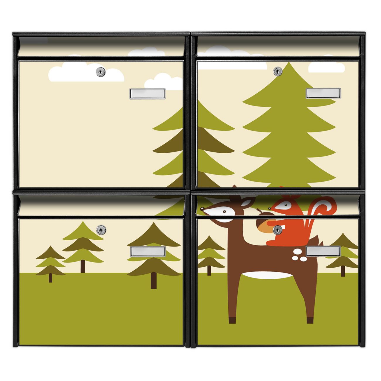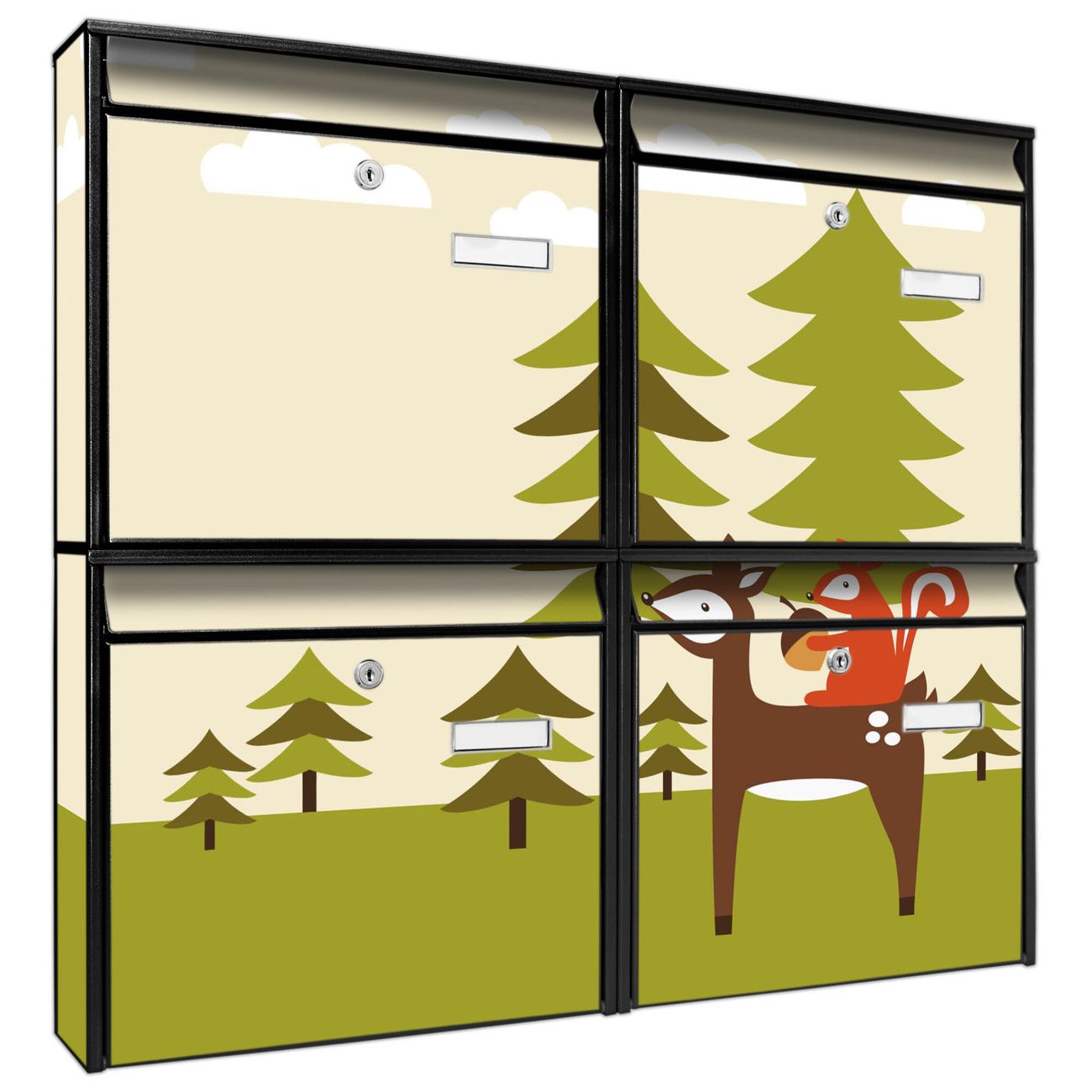 FUNKTION: Die Burg-Wächter Briefkastenanlage mit Motiv Heimweg bietet Ihnen ausreichend Fassungsvermögen um auch A4 und C4 Sendungen zu empfangen. Das integrierte Namensschild lässt sich individuell beschriften. Wählen Sie aus den Grundfarben weiß, silber und schwarz. DESIGN: Die 4 Briefkästen haben ein ansprechendes und zeitloses Design, ohne dabei auf Funktionalität zu verzichten. Das Material ist sehr stabil, wetterfest und rostfrei. Durch das Motiv Heimweg werden die Postkästen zu einem Blickfang. DETAILS: Die Postkästen bestehen aus verzinktem Stahl der zusätzlich mit Klarlack versiegelt wurde. Die Kästen sind gesamt 64,5cm hoch, 72,5cm breit und 10cm tief. Das Motiv besteht aus einer wetter- und UV-festen Folie, die Ihren Briefkasten zusätzlich vor Kratzern schützt. Die Postkästen werden mit Montagematerial, je einem Namensschild und je zwei Schlüsseln geliefert. NUTZEN: Das Briefkastenset eignet sich für die Wandmontage, die Größe bietet genügend Platz für Sendungen aller Art. Das zeitlose Design sowie die stabile Bauart bieten Ihnen einen treuen Begleiter für Ihre Post. BANJADO:
